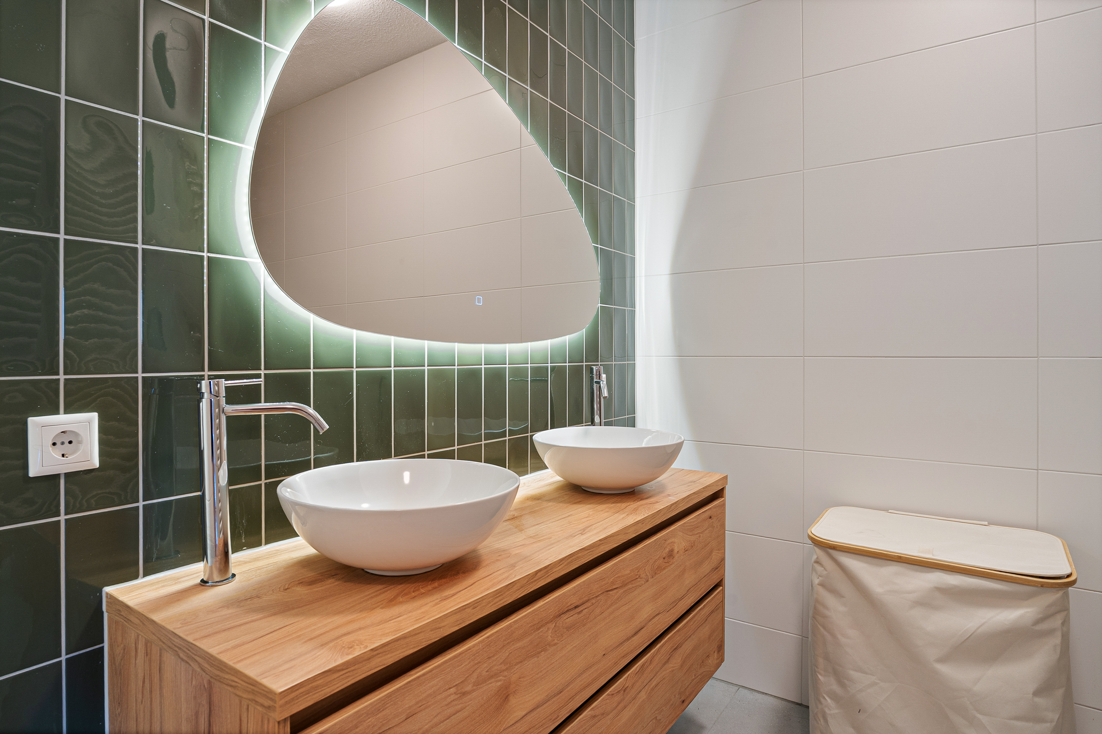 De moderne badkamer is netjes afgewerkt met sfeervolle groene tegels en voorzien van een inloopdouche, dubbele wastafelmeubel en verlichte spiegel. Daarnaast is er een separaat toilet tevens voorzien in dezelfde stijl als de badkamer en een praktische berg-/technische ruimte met opstelling voor de installaties en extra opbergruimte.