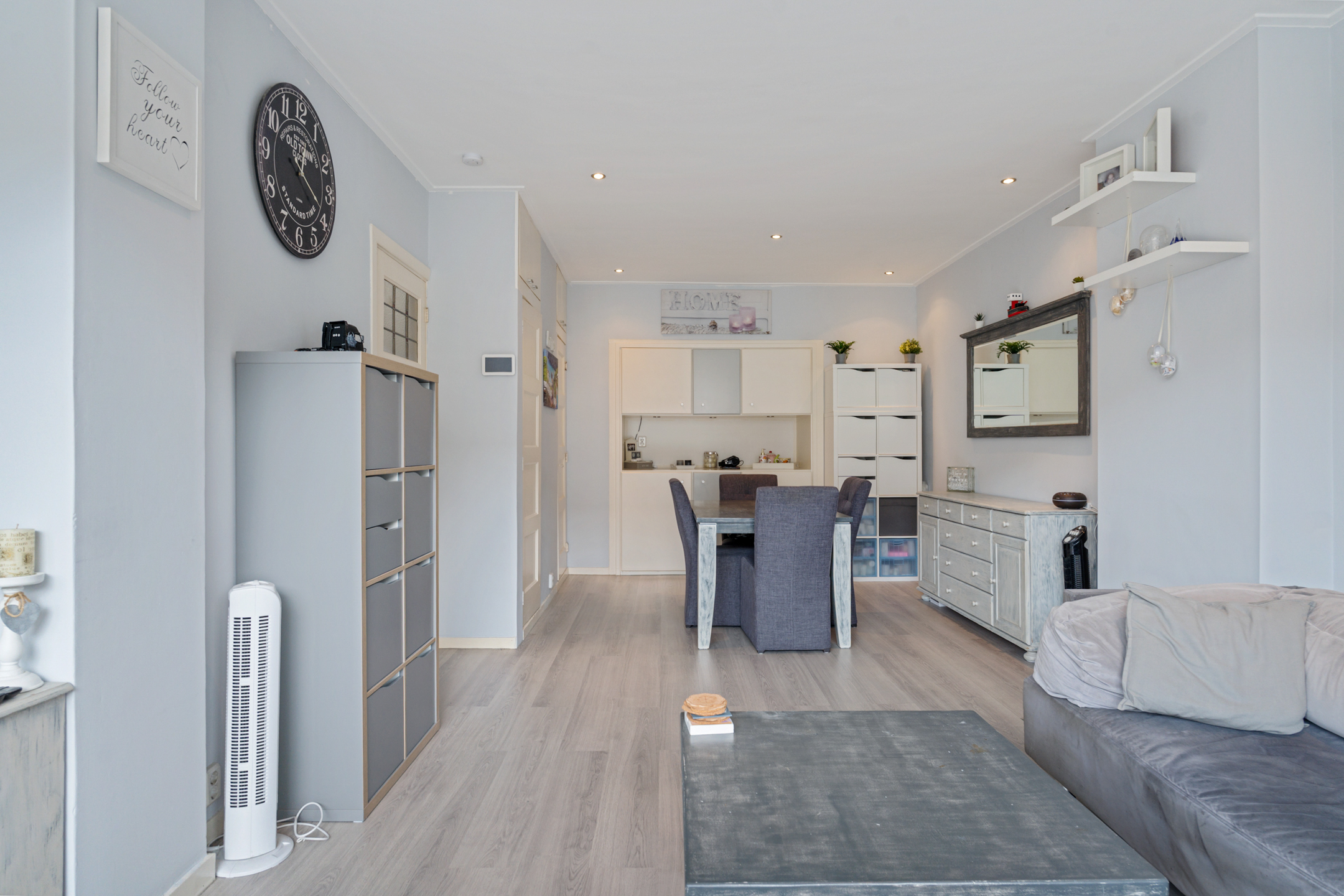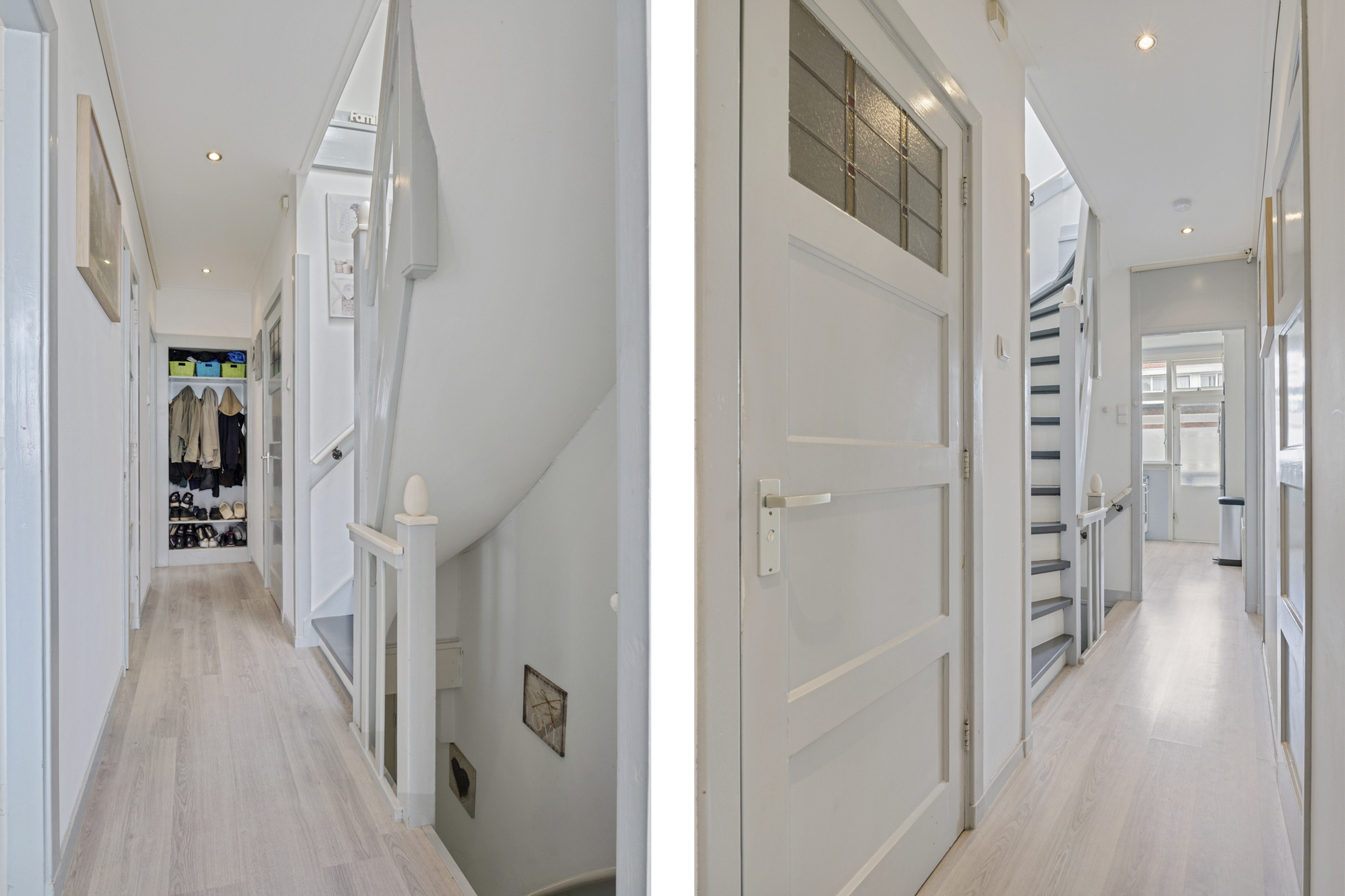 Ruime hal met toegang tot alle vertrekken, waaronder de meterkast en het toilet. De sfeervolle woonkamer is royaal en licht, met plafondspots, glas-in-loodramen en een fraaie vloer. Vaste kasten zorgen voor extra opbergruimte.