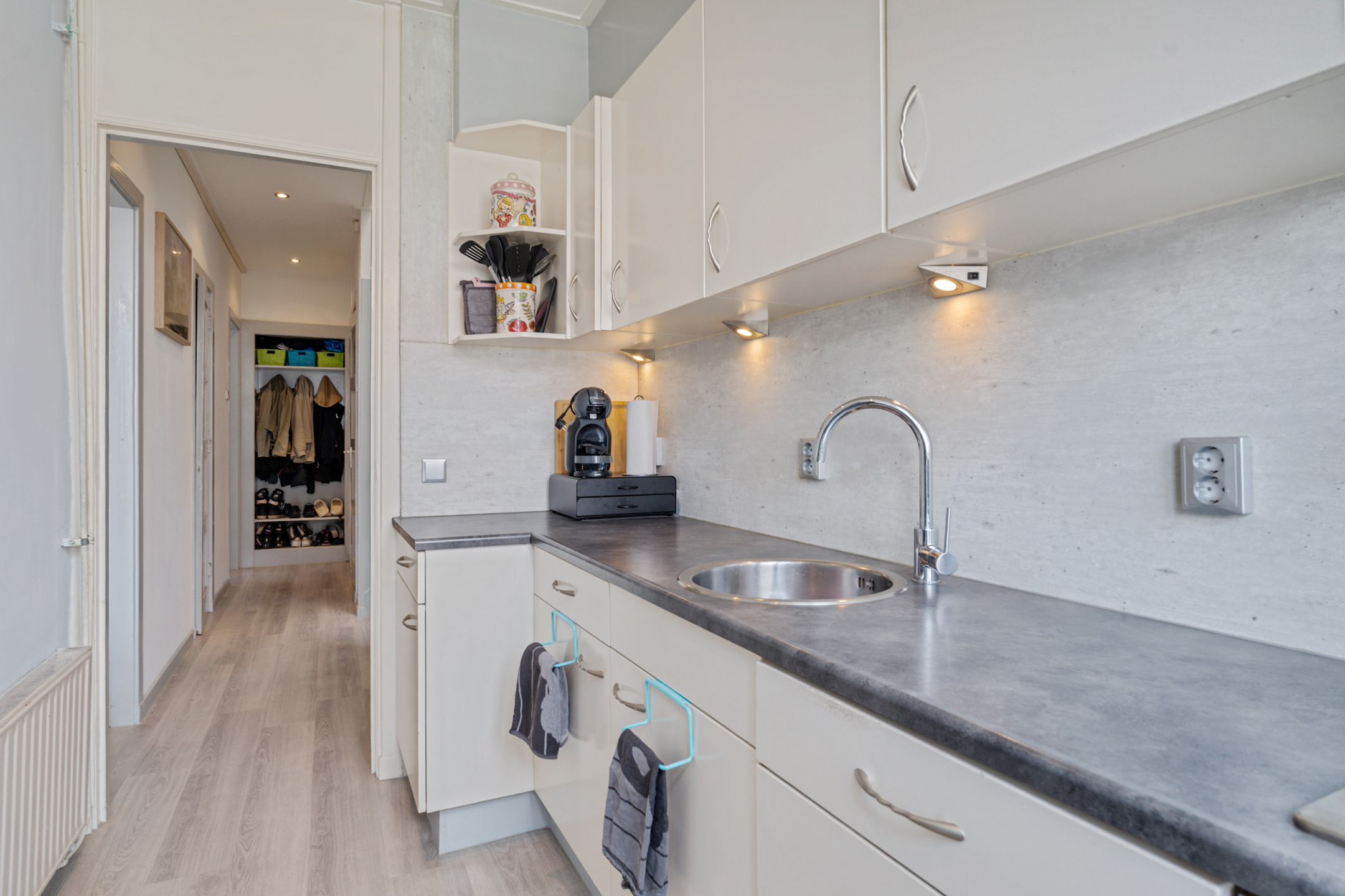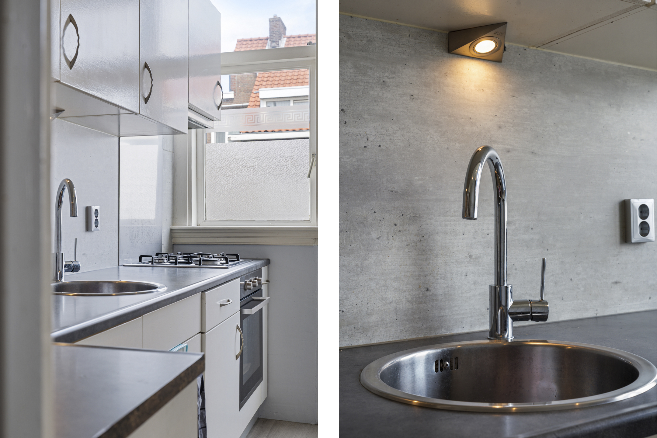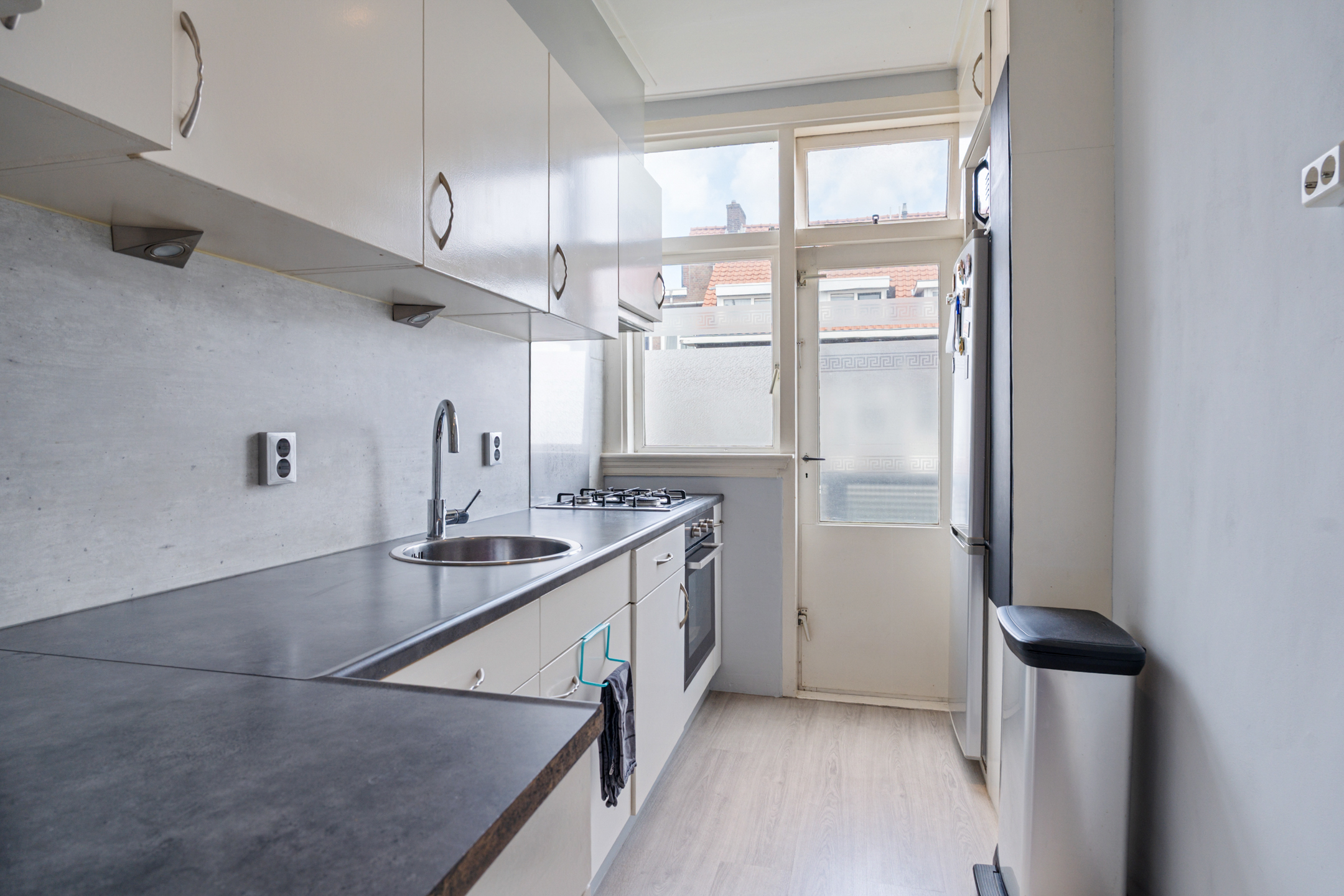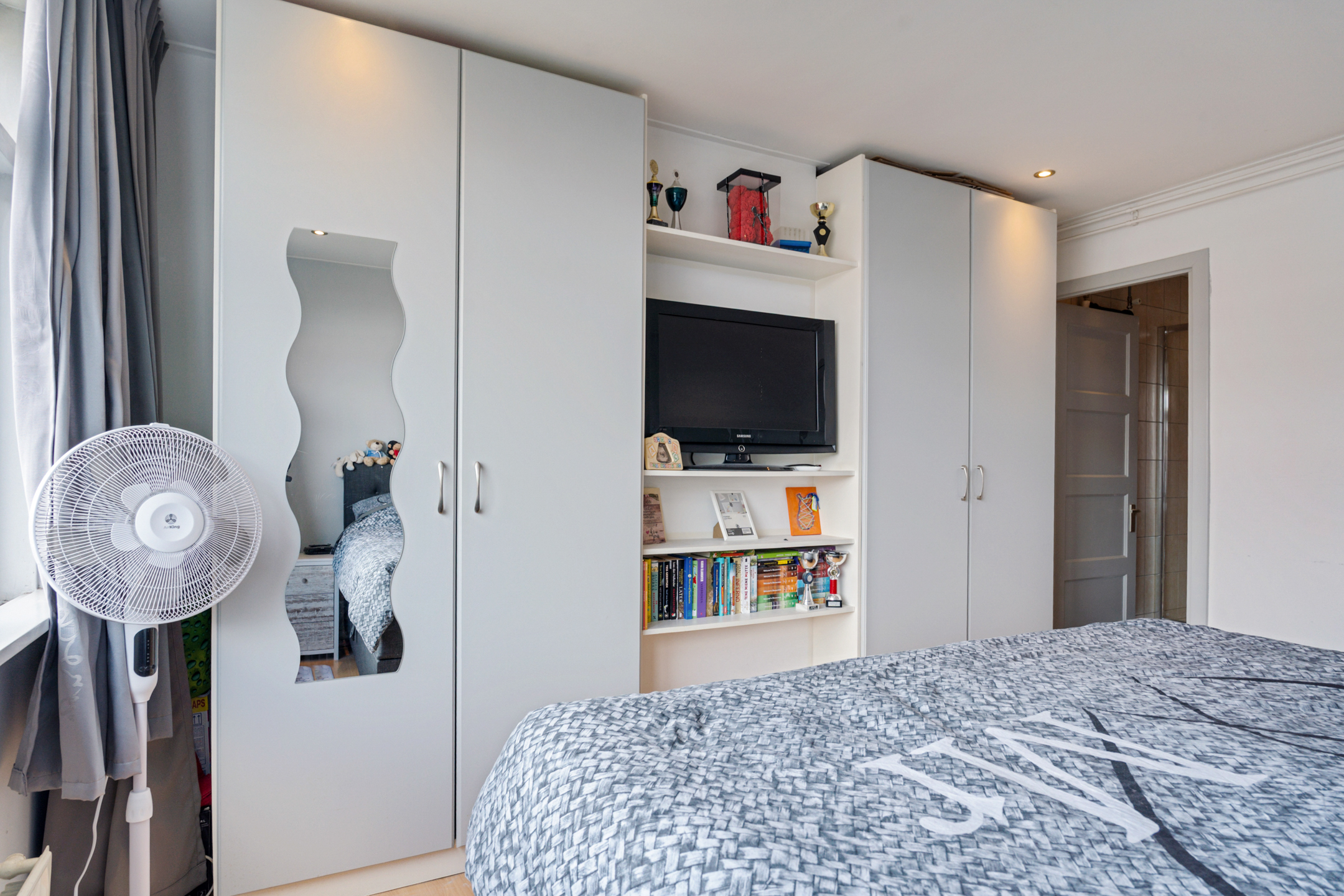 Aan de achterzijde bevindt zich de gesloten, functionele keuken, uitgerust met een oven, 4-pits gasfornuis en voldoende kastruimte. Vanuit de keuken loop je zo het balkon op. Aan de achterzijde ligt ook de eerste ruime slaapkamer, eveneens voorzien van vaste kasten en met directe toegang tot het balkon.