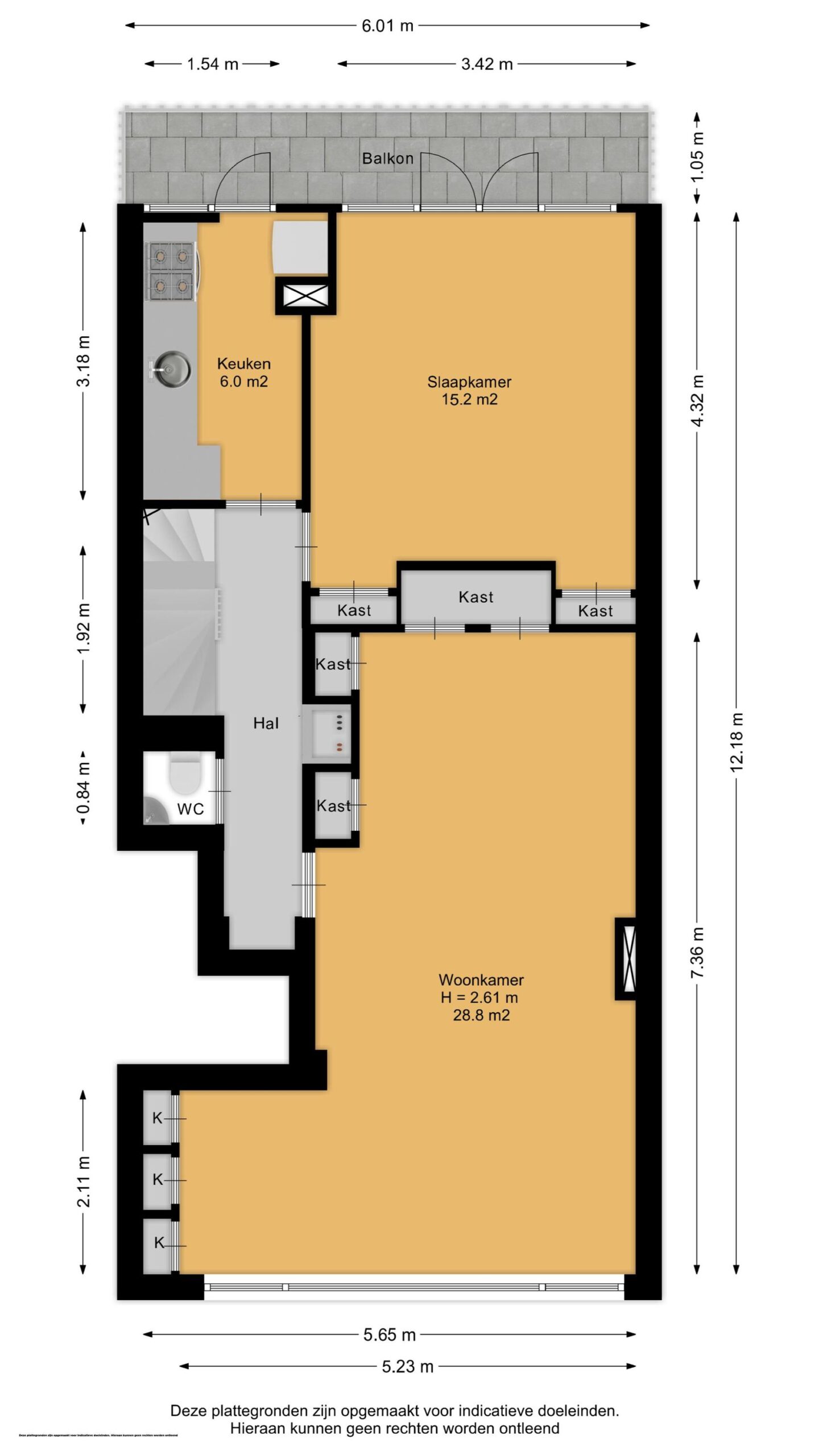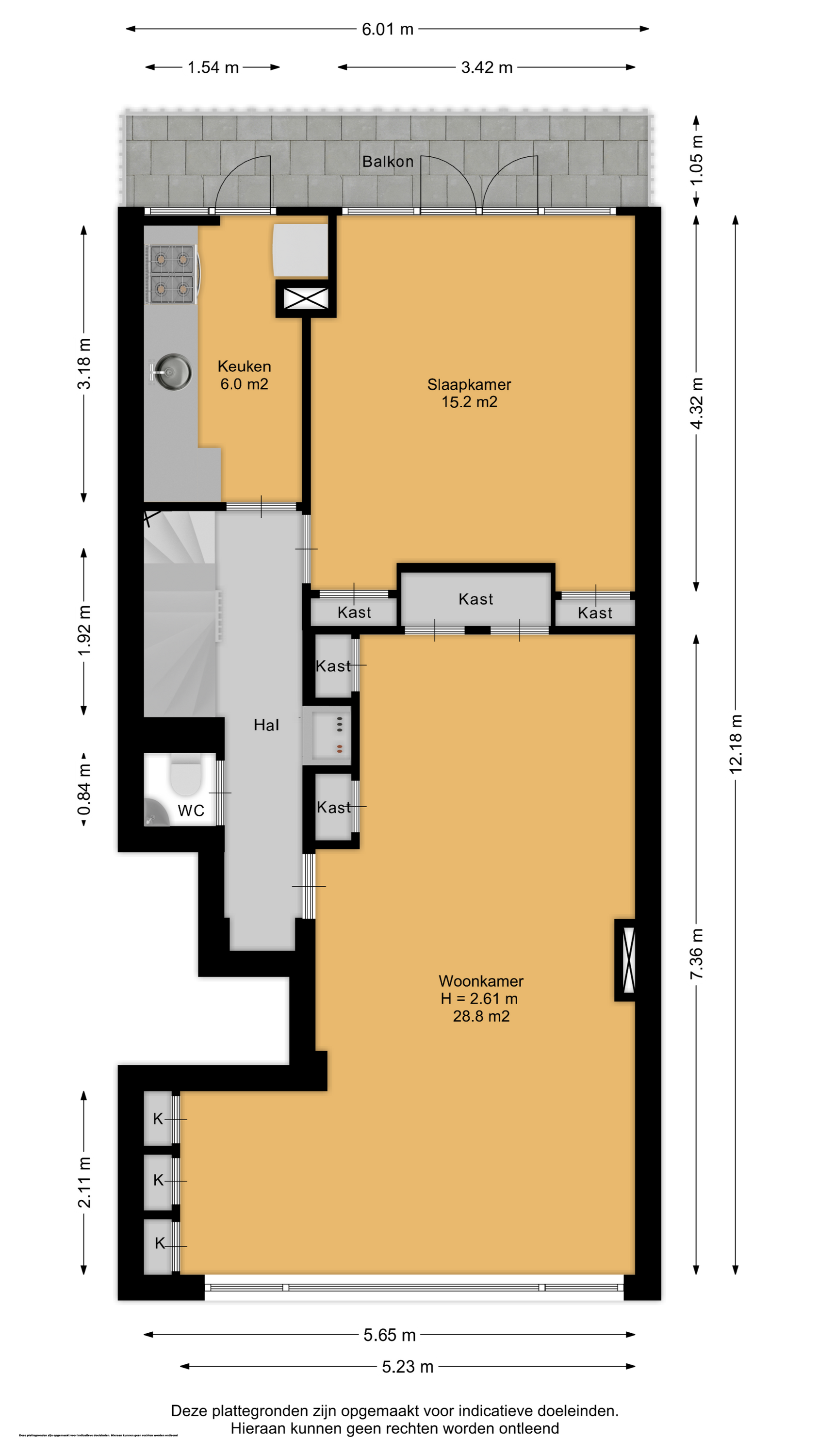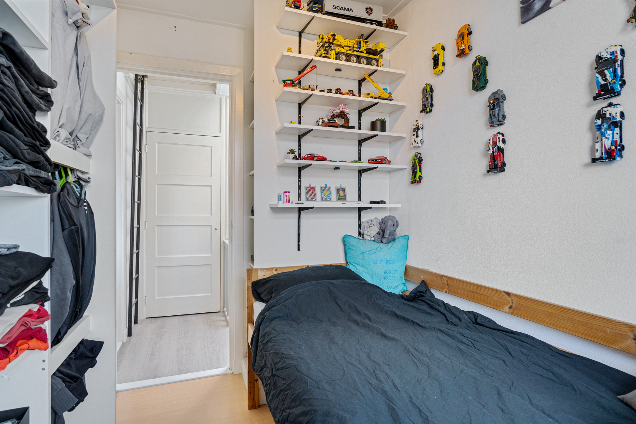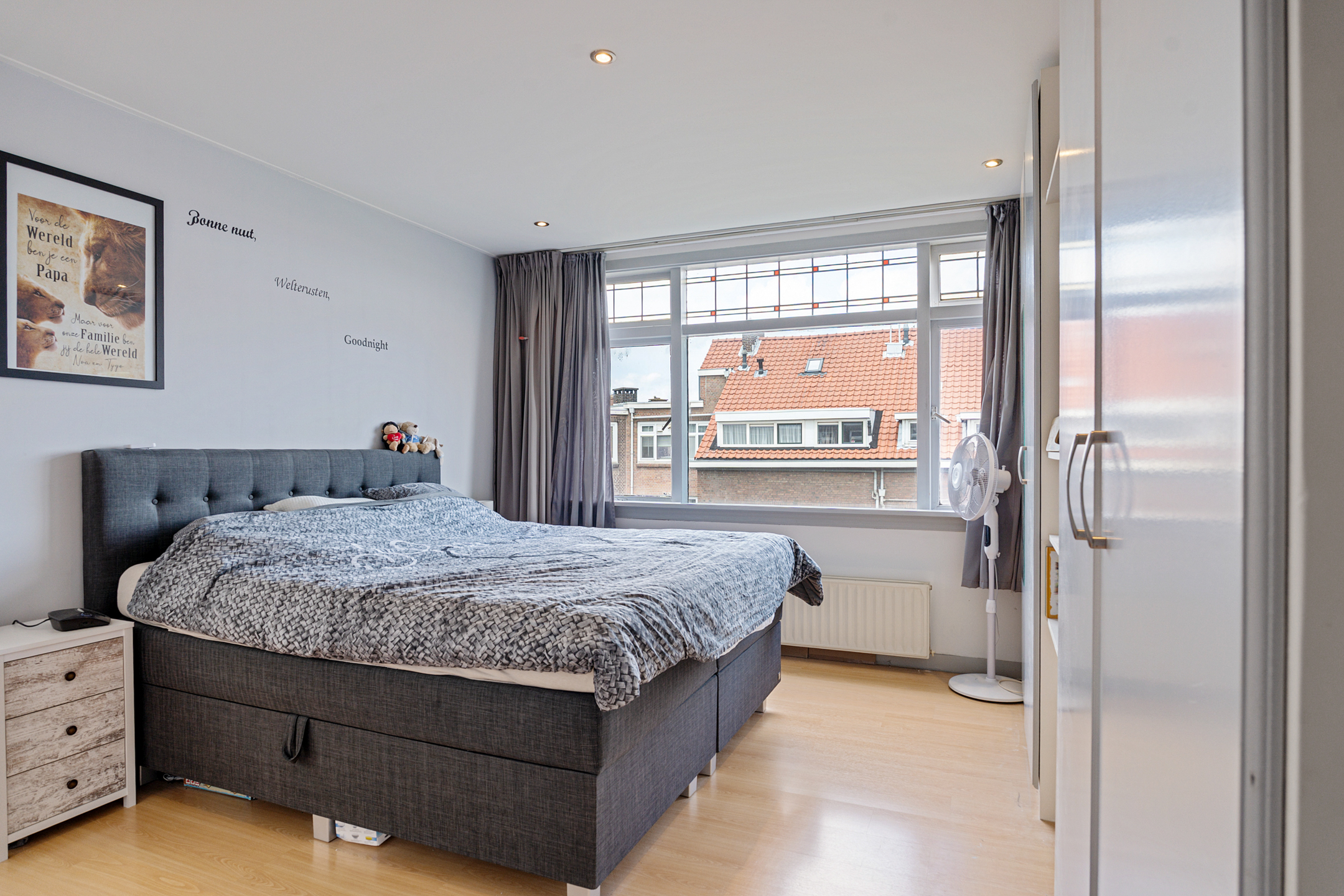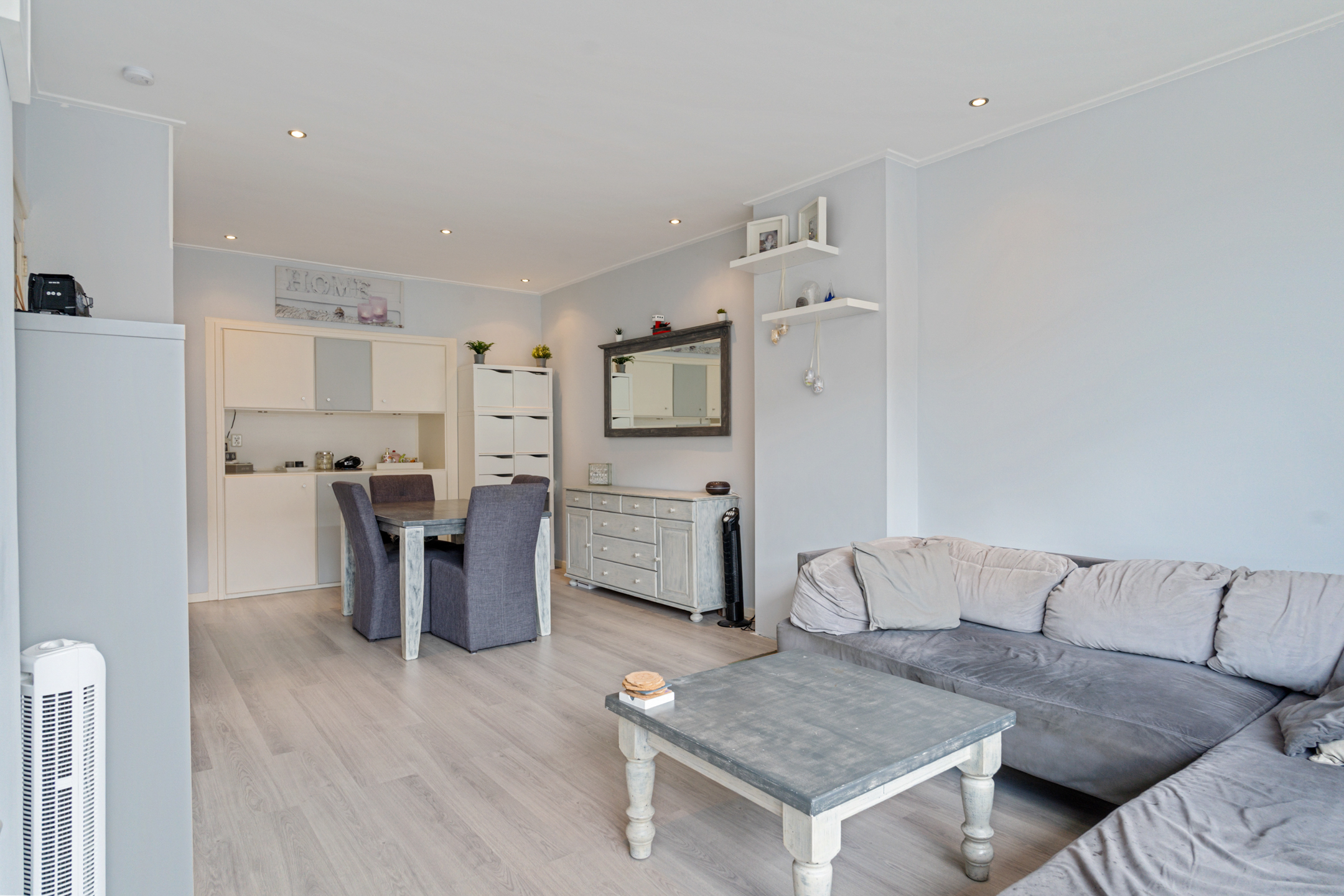 Aan de achterzijde bevindt zich de gesloten, functionele keuken, uitgerust met een oven, 4-pits gasfornuis en voldoende kastruimte. Vanuit de keuken loop je zo het balkon op. Aan de achterzijde ligt ook de eerste ruime slaapkamer, eveneens voorzien van vaste kasten en met directe toegang tot het balkon.