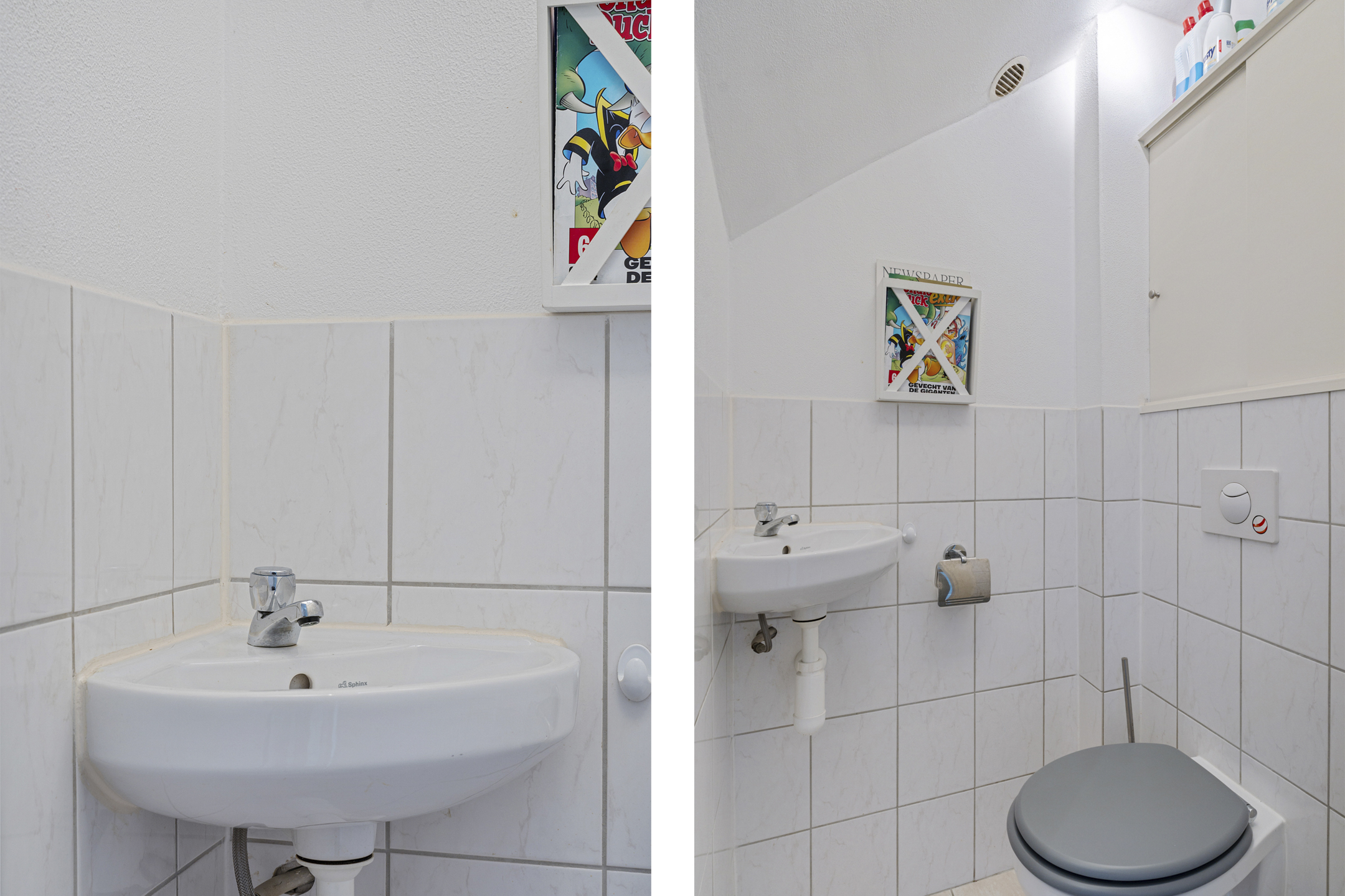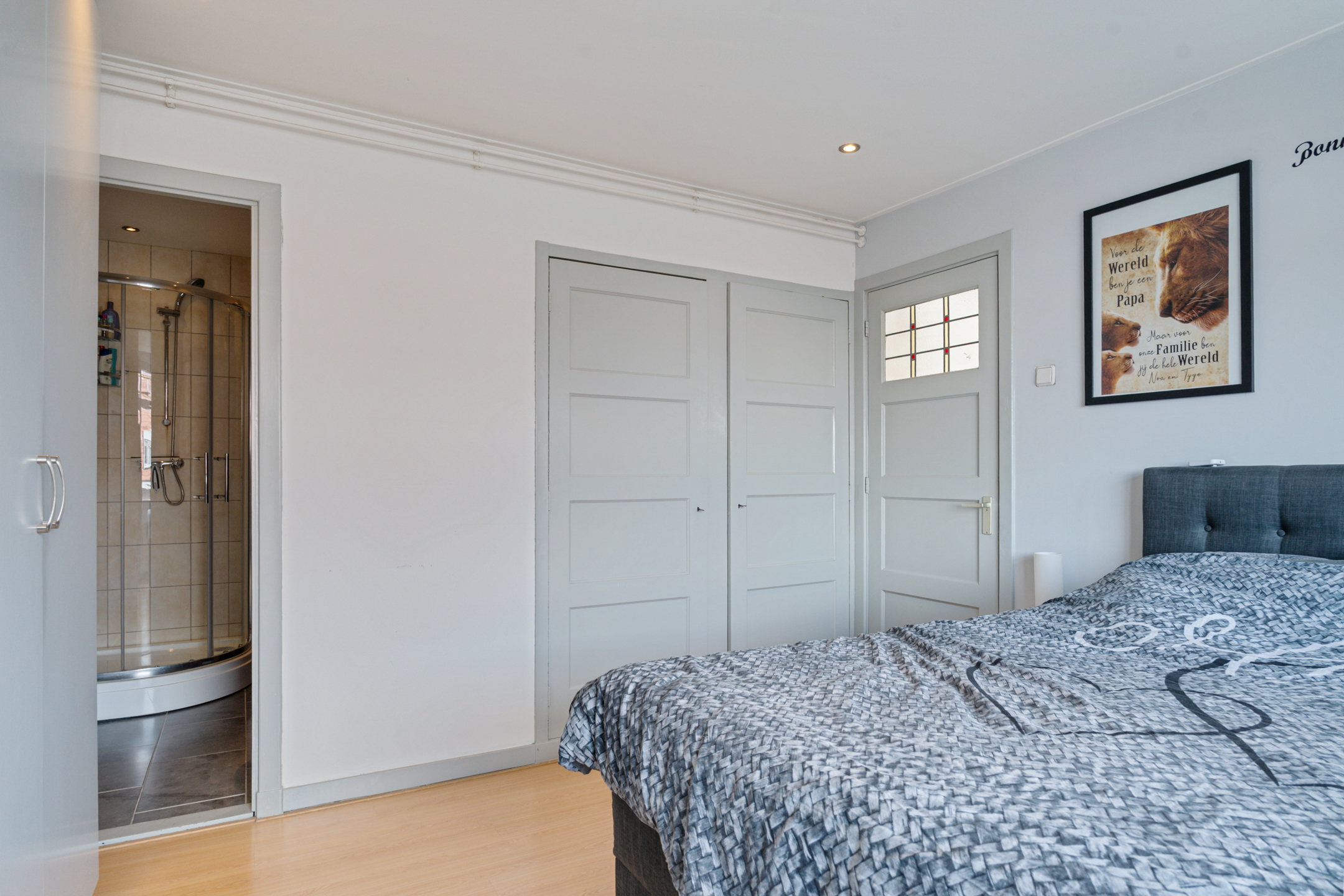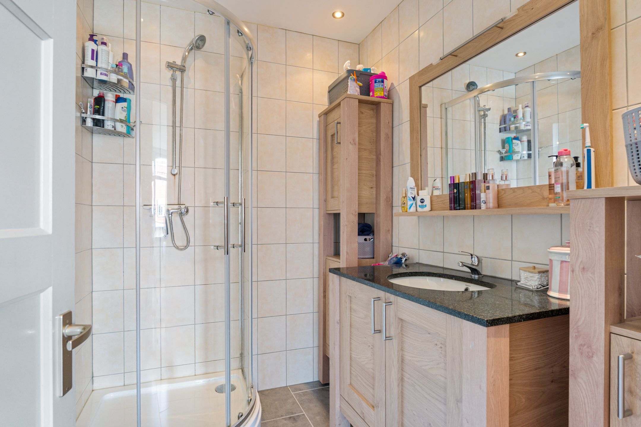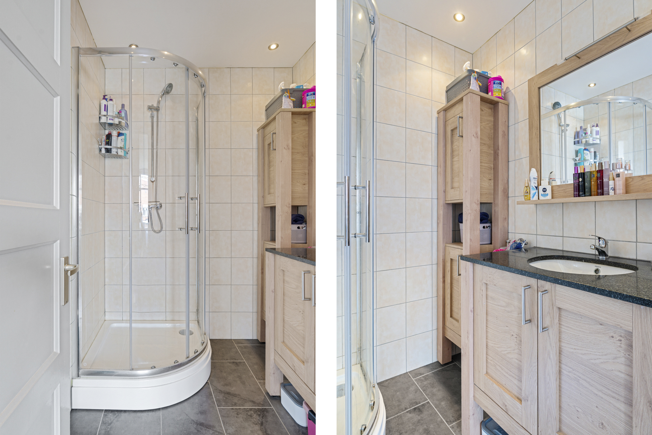 De hoofdslaapkamer beschikt over twee vaste kasten en biedt toegang tot de nette, volledig betegelde badkamer aan de voorzijde. Deze is ingericht met een ruime douchecabine, wastafelmeubel, spiegel, extra kastruimte en plafondspotjes.