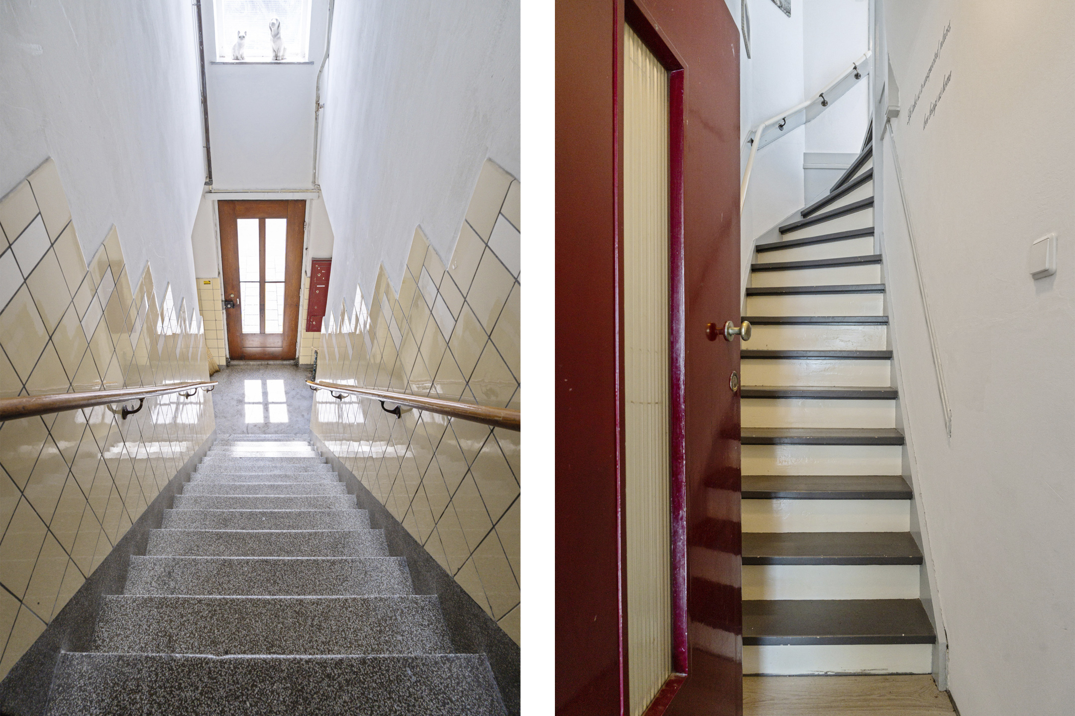 Afgesloten entree met bellentableau en trapopgang naar de woning.