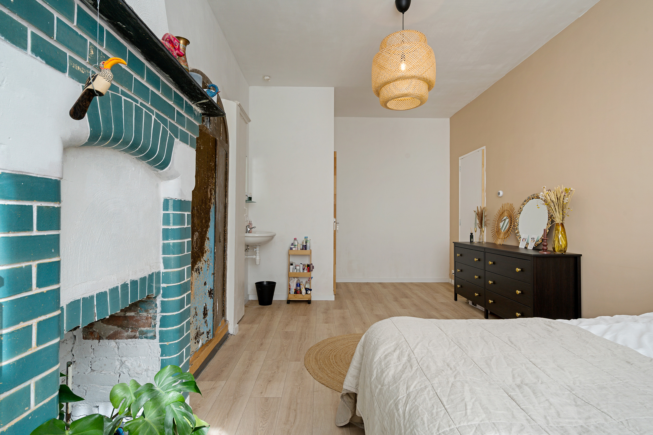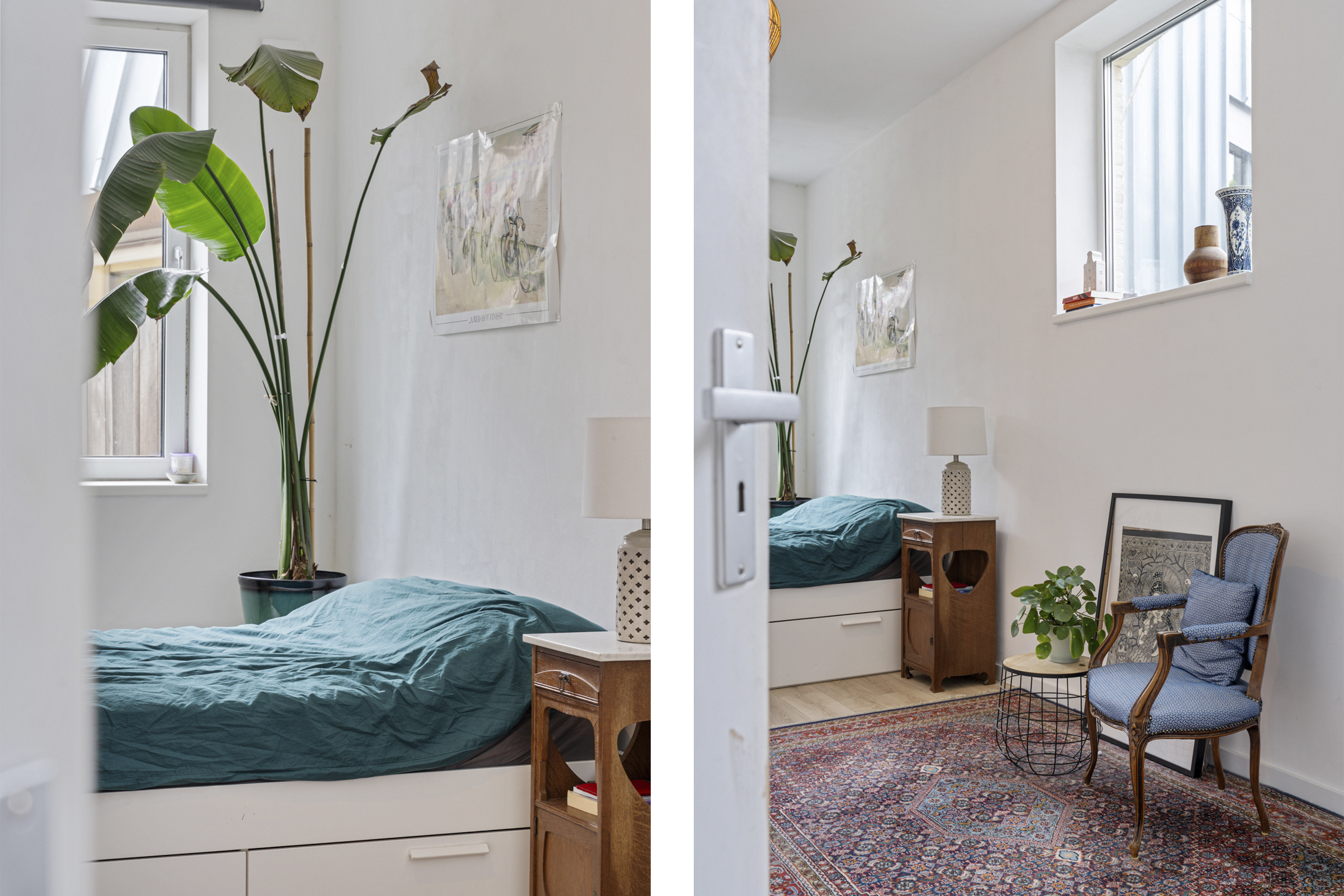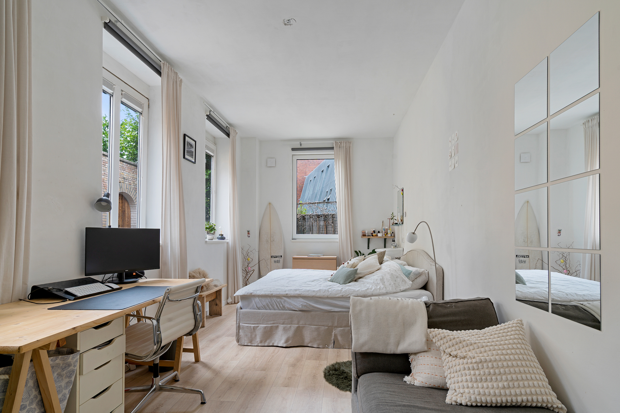 De centrale hal verbindt alle ruimtes in de woning. Aan de voorzijde tref je een ruime slaapkamer met hoge ramen net boven straatniveau. Door deze slimme ligging komt het daglicht volop binnen, terwijl je toch veel privacy hebt.