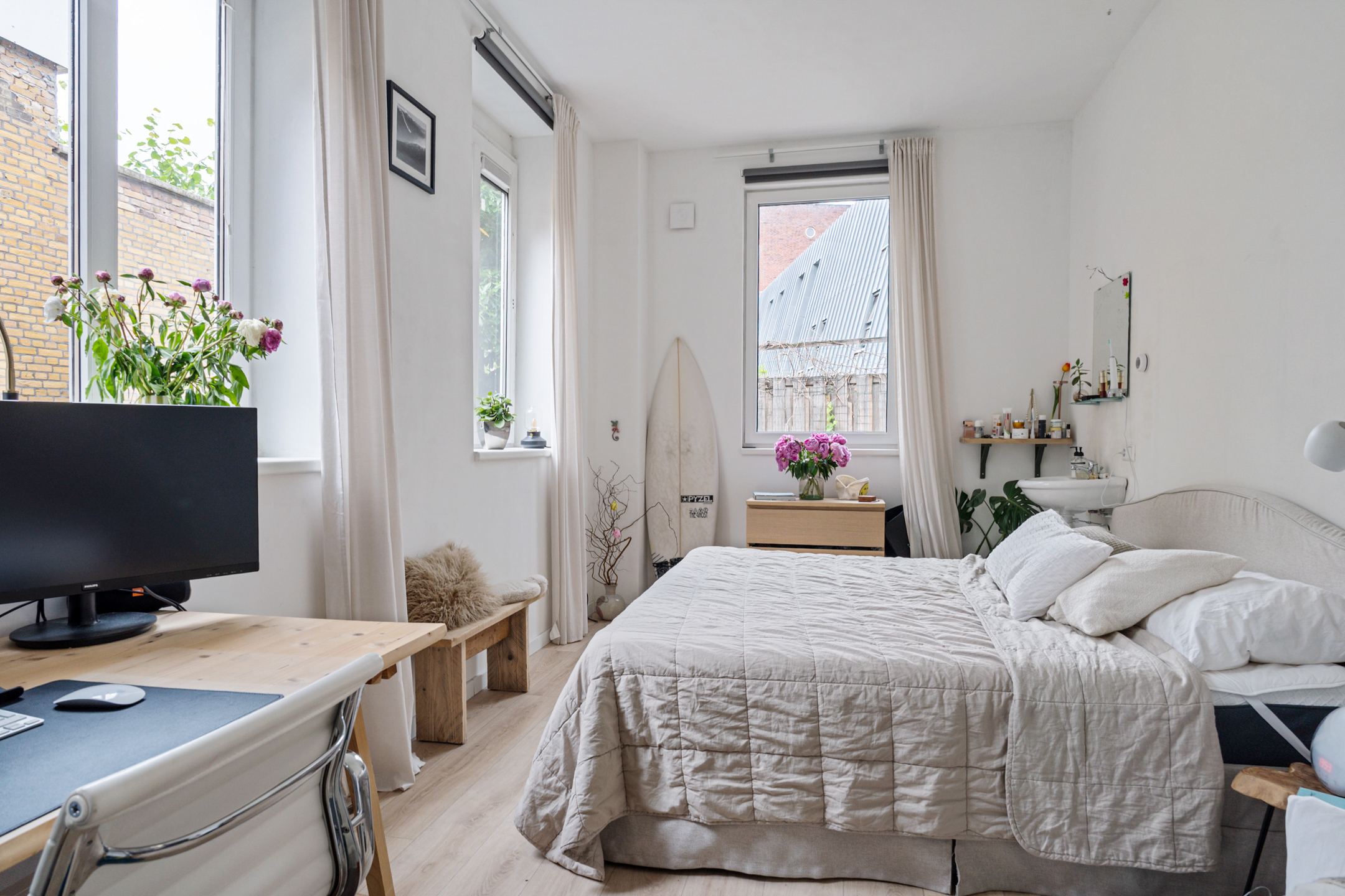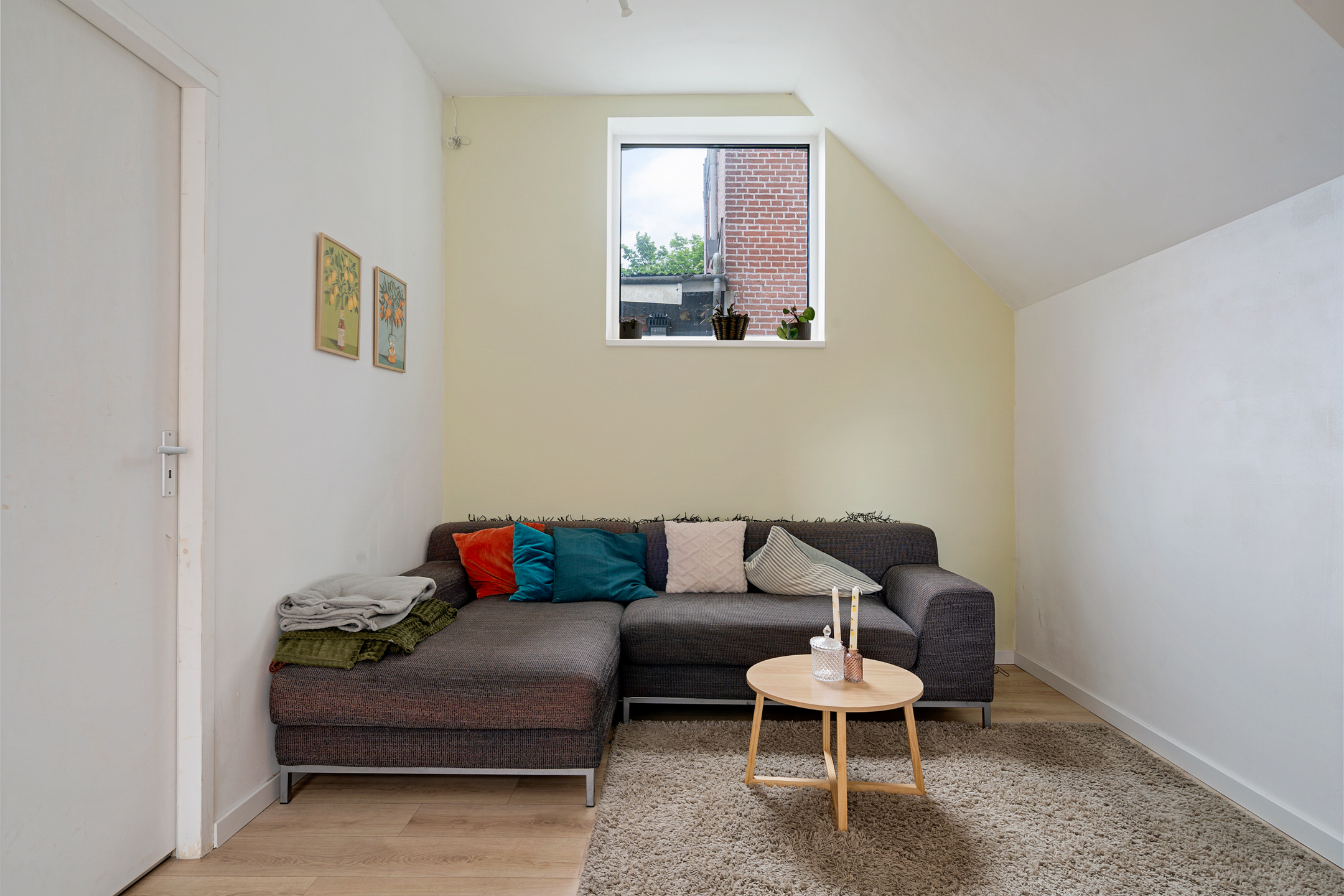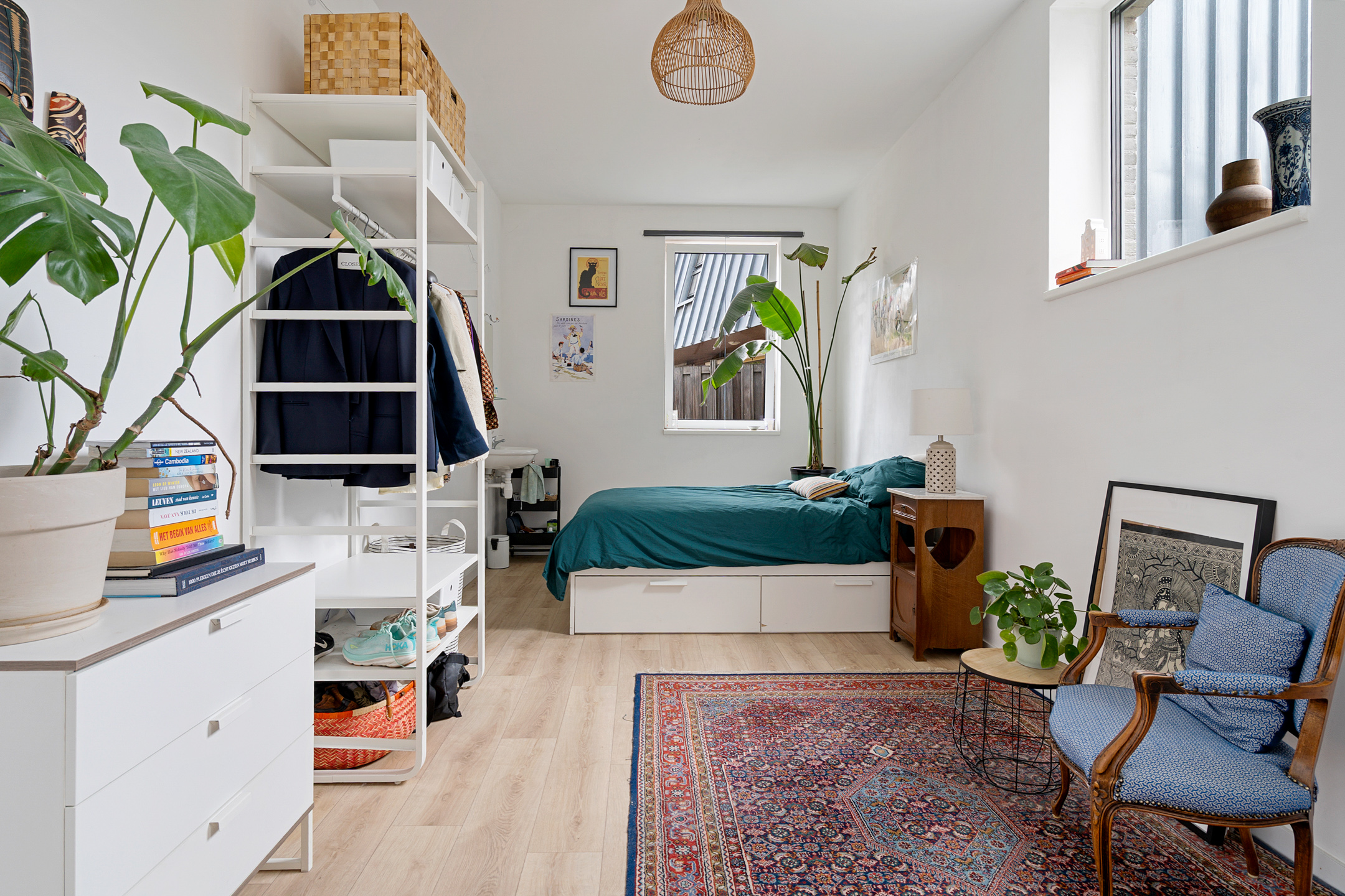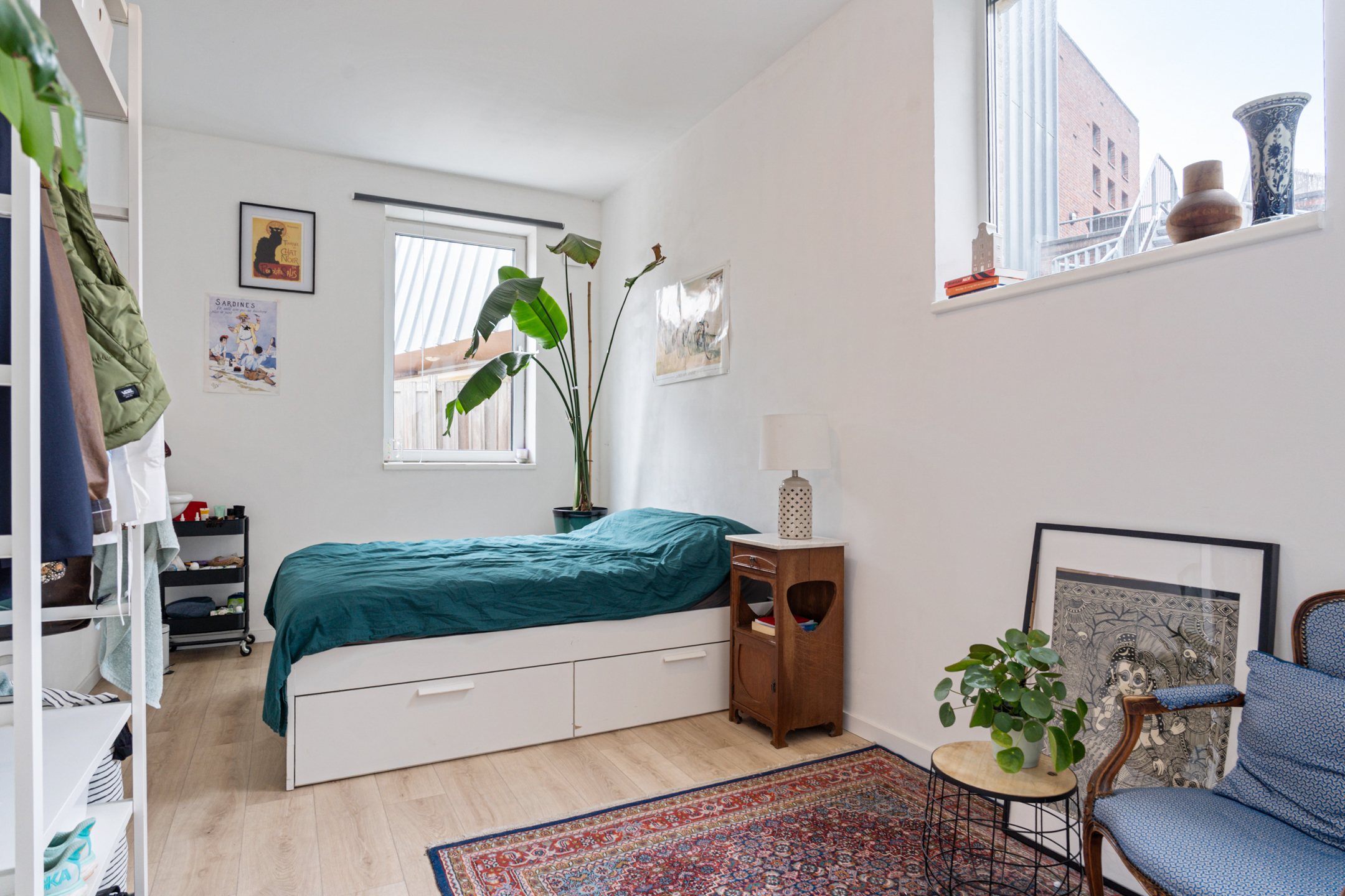 De centrale hal verbindt alle ruimtes in de woning. Aan de voorzijde tref je een ruime slaapkamer met hoge ramen net boven straatniveau. Door deze slimme ligging komt het daglicht volop binnen, terwijl je toch veel privacy hebt.