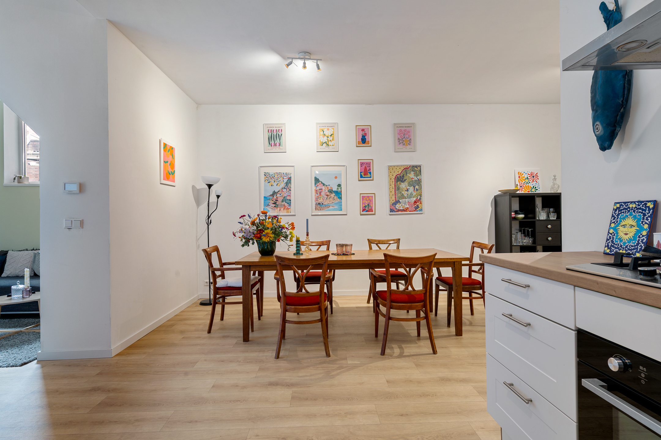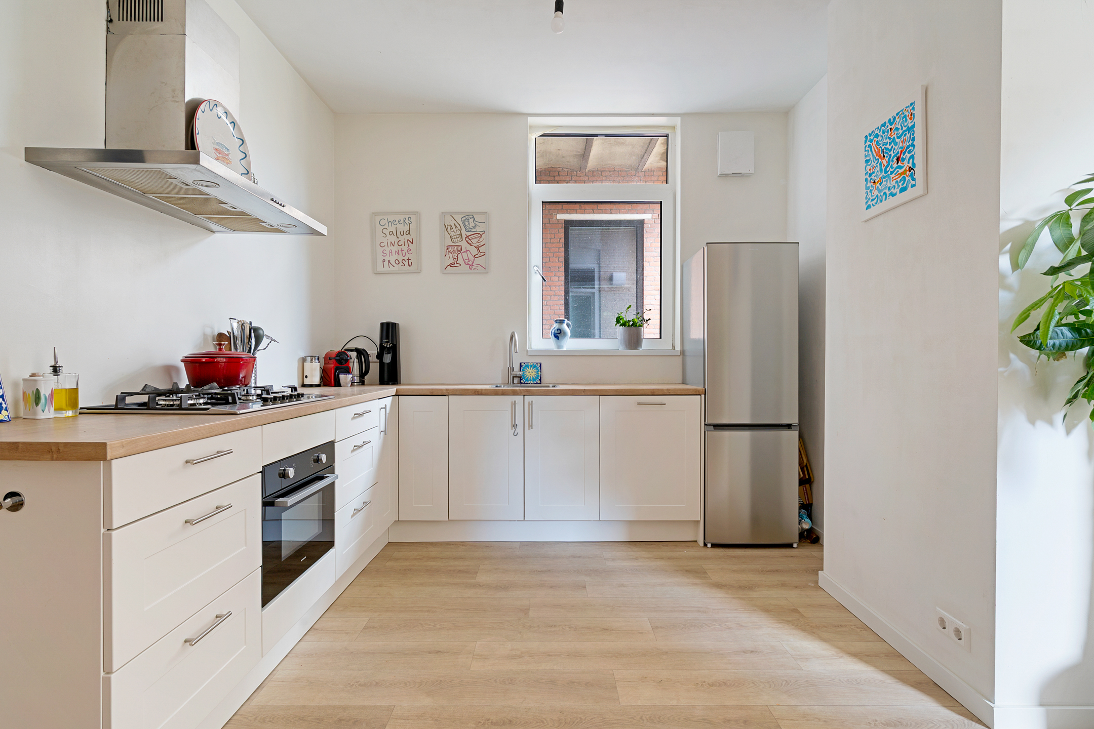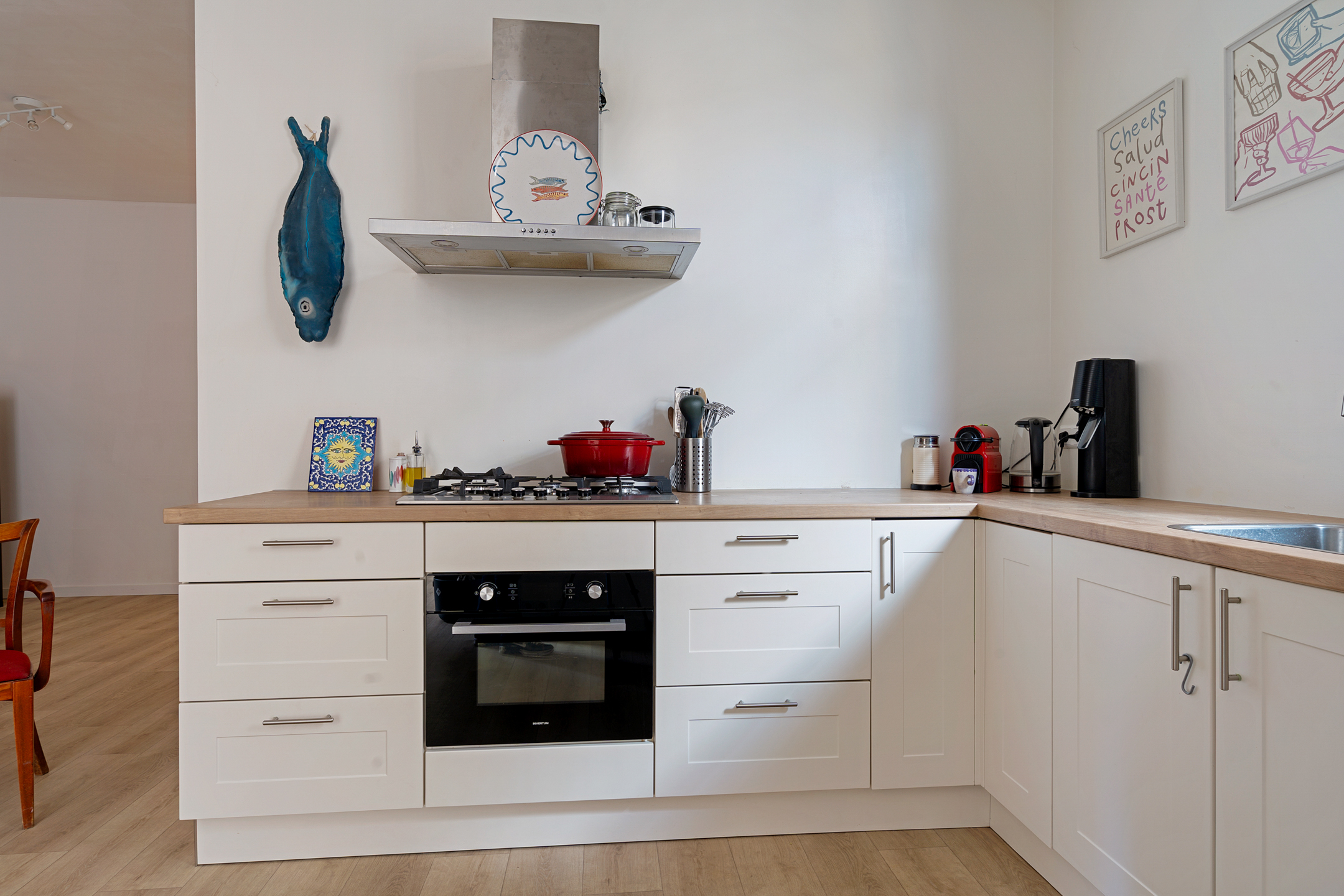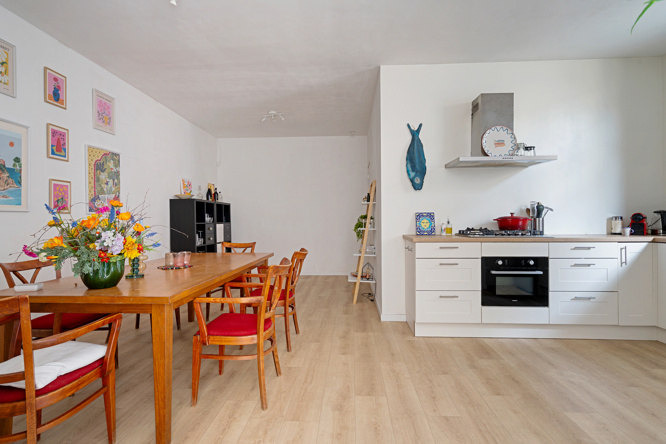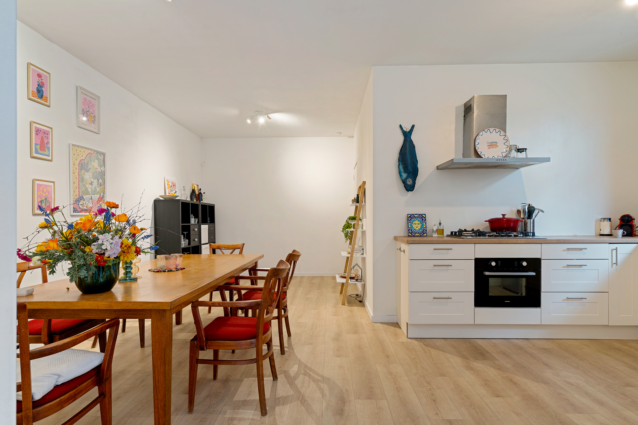 De royale woonkamer ligt aan de achterzijde en is voorzien van een moderne open hoekkeuken met inbouwapparatuur, waaronder een kookplaat, afzuigkap, koelkast en vaatwasser. Dankzij de schuifpui naar de tuin stroomt het licht hier rijkelijk naar binnen. Een heerlijke plek waar binnen en buiten op natuurlijke wijze in elkaar overlopen.