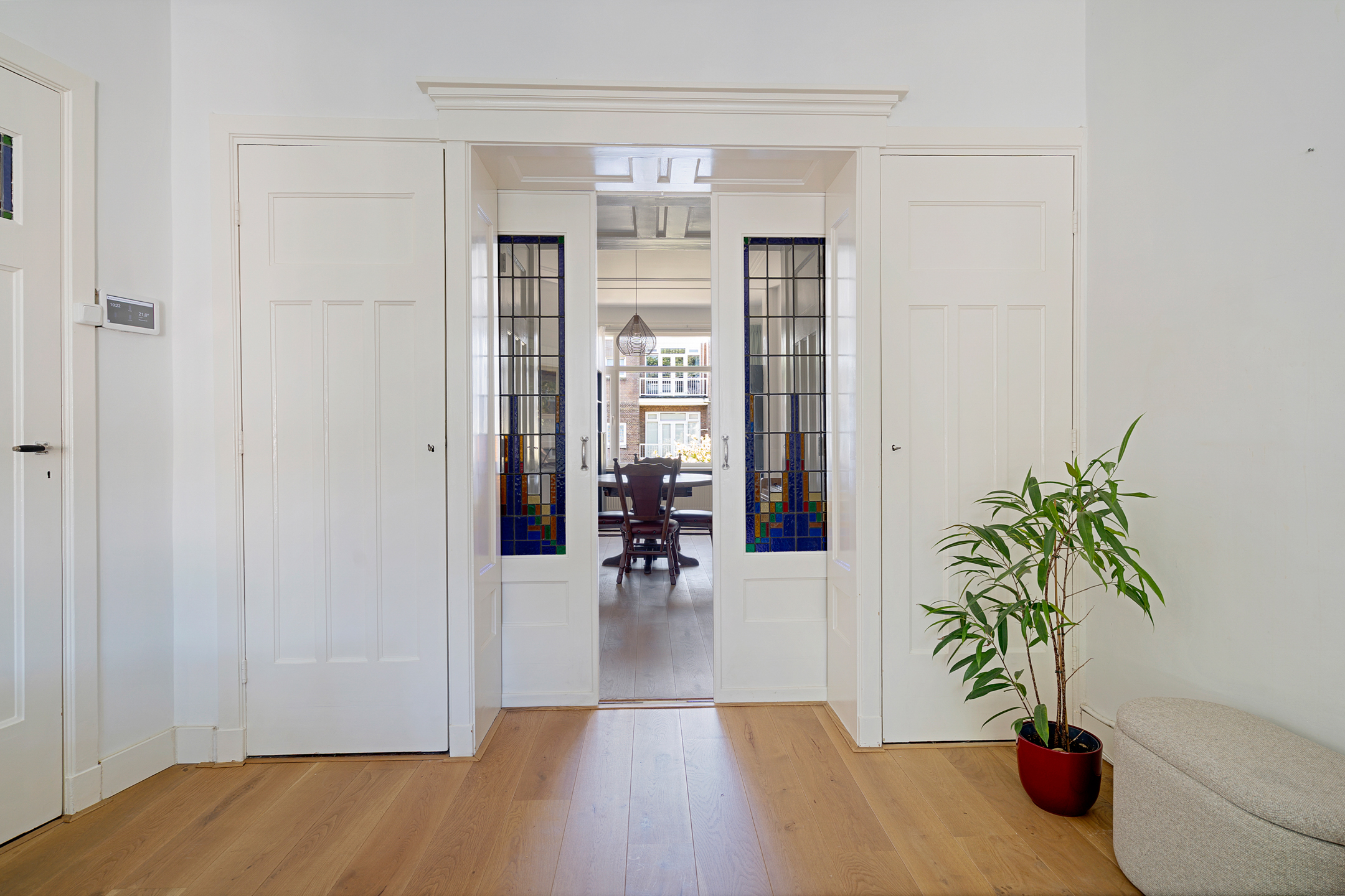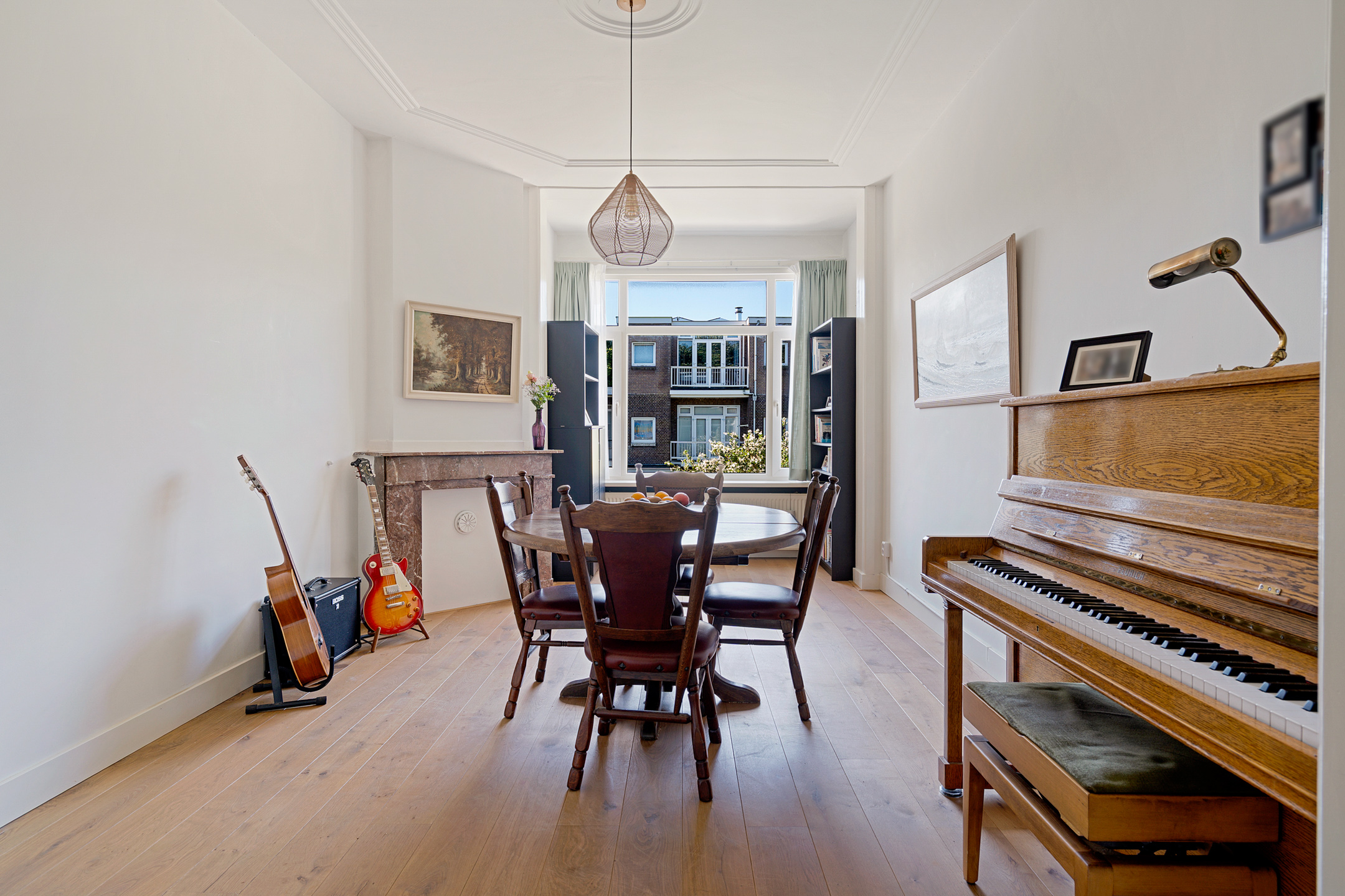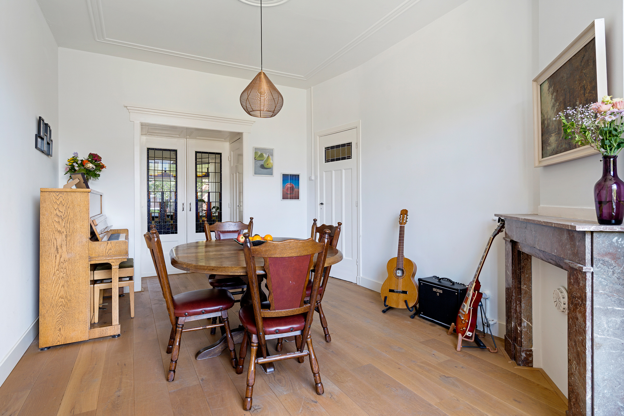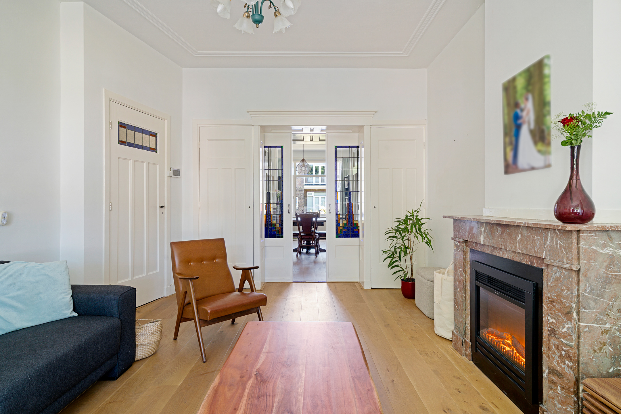 De sfeervolle en ruime kamer en suite is het hart van de woning. Hier vind je klassieke schuifdeuren met glas-in-loodramen, een authentieke erker aan de voorzijde, originele details en een open haard die zorgt voor extra warmte en gezelligheid. De grote raampartijen zorgen voor veel lichtinval en een prettige leefruimte, ideaal om zowel te ontspannen als te ontvangen.