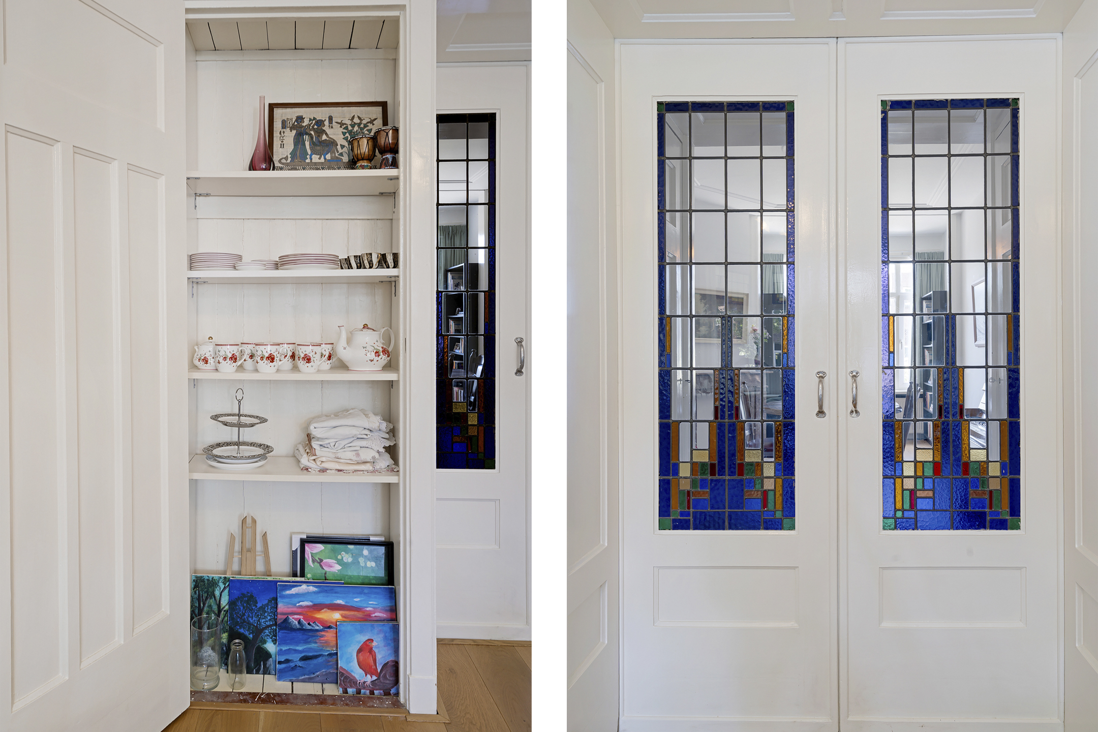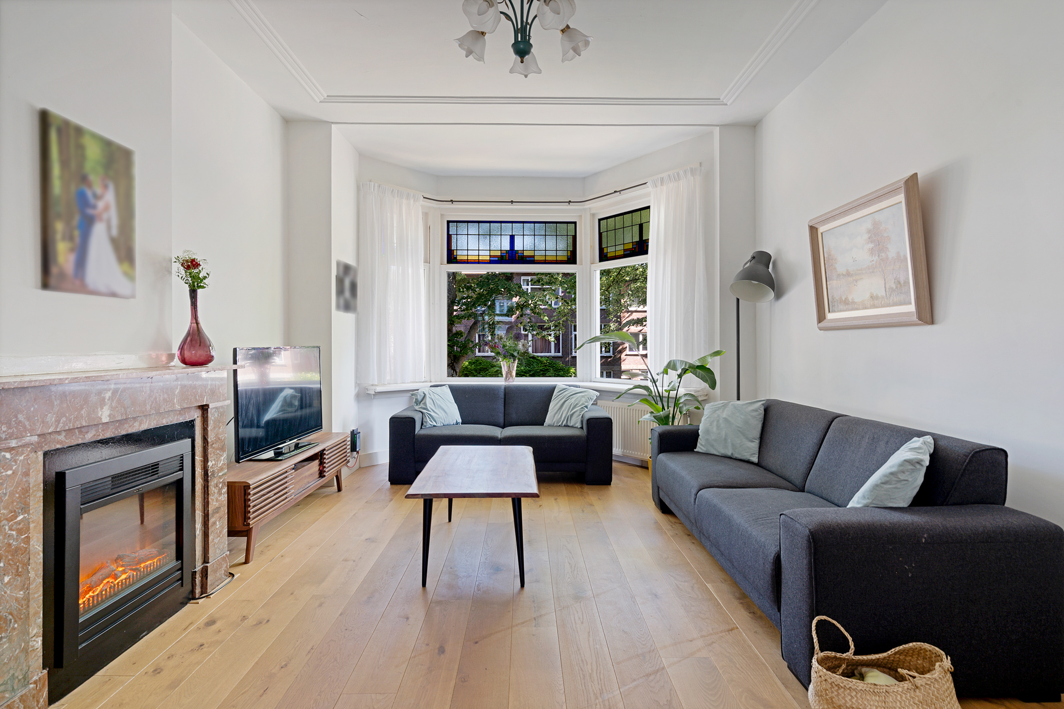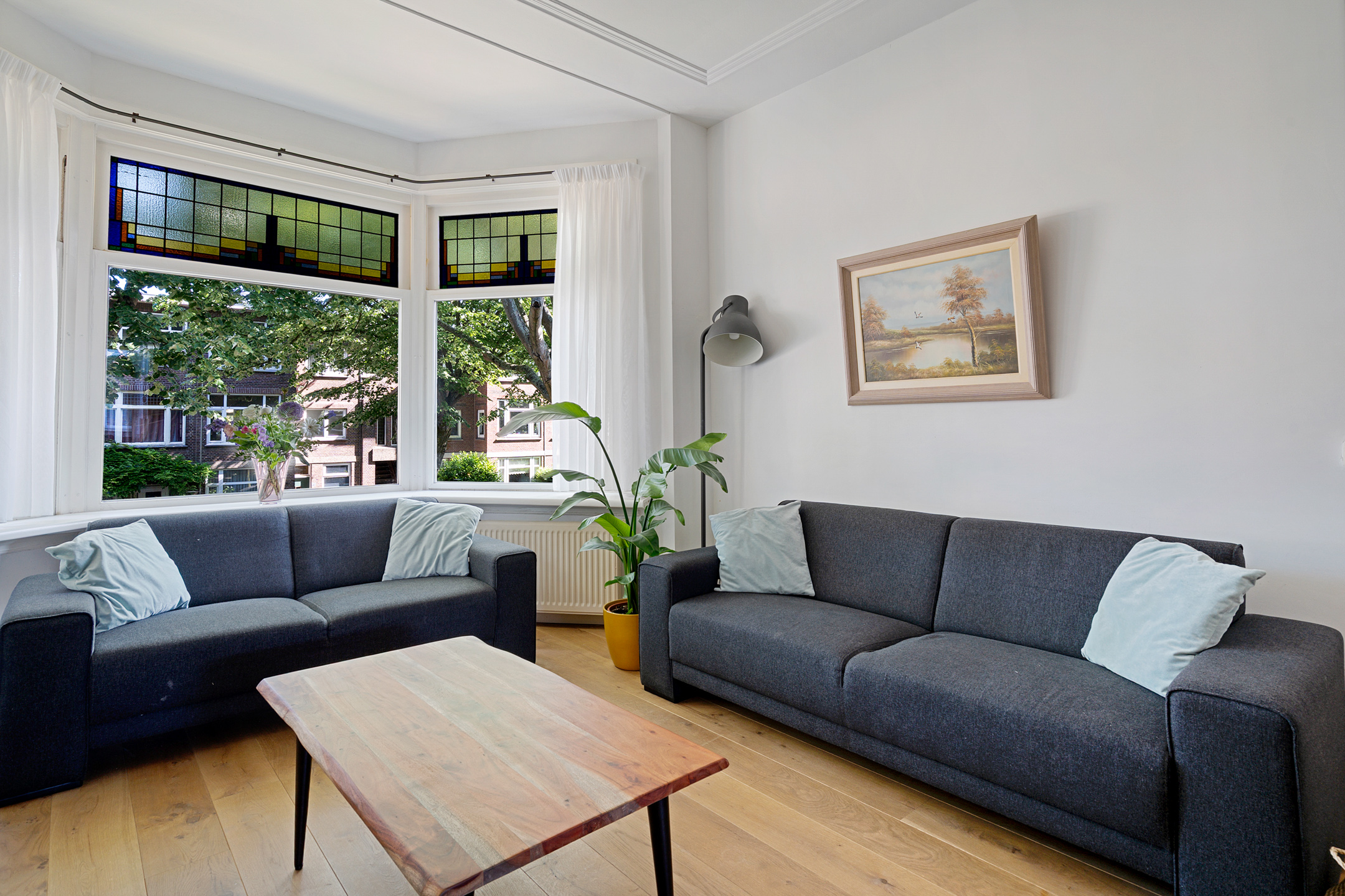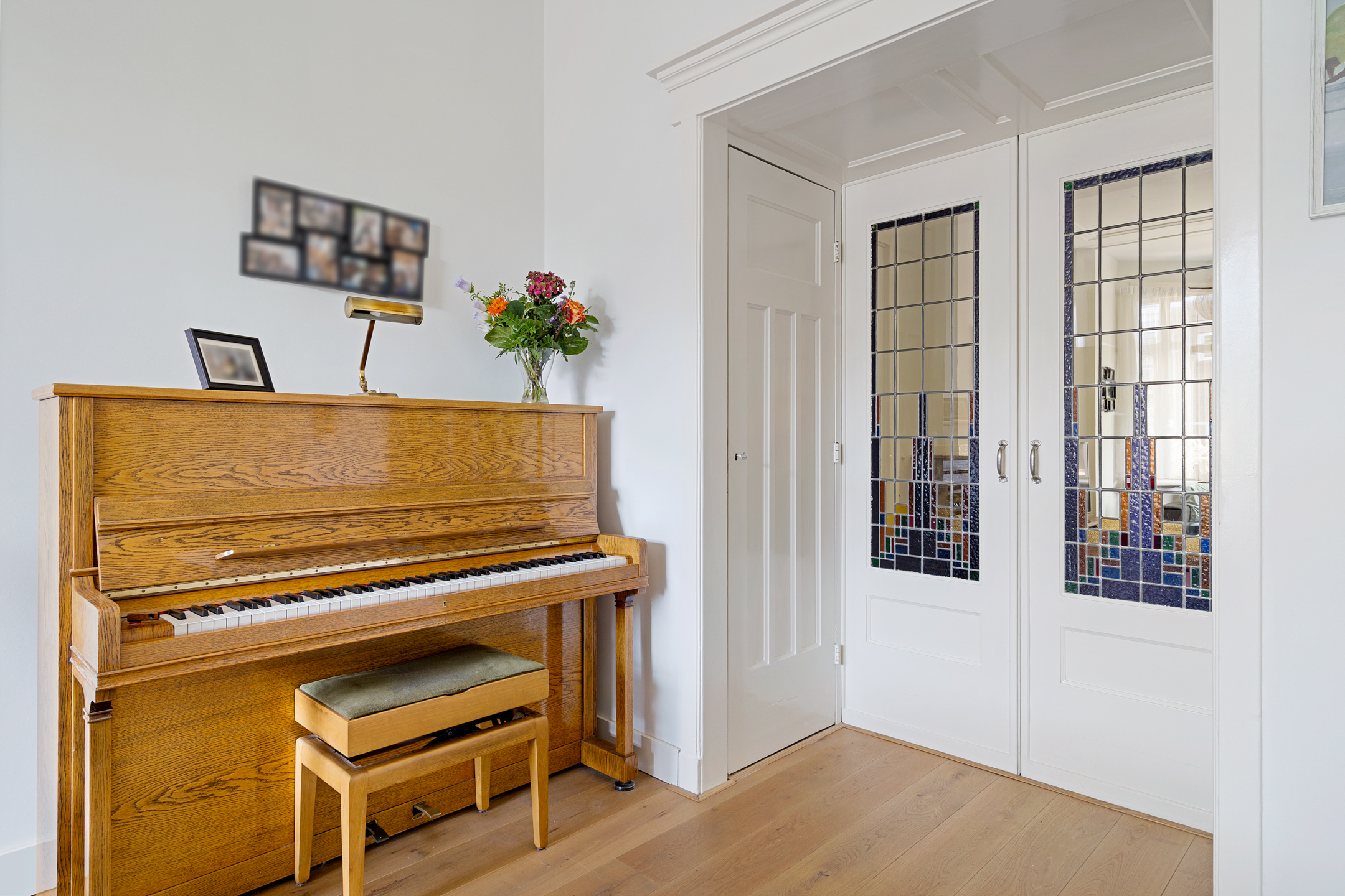 De sfeervolle en ruime kamer en suite is het hart van de woning. Hier vind je klassieke schuifdeuren met glas-in-loodramen, een authentieke erker aan de voorzijde, originele details en een open haard die zorgt voor extra warmte en gezelligheid. De grote raampartijen zorgen voor veel lichtinval en een prettige leefruimte, ideaal om zowel te ontspannen als te ontvangen.