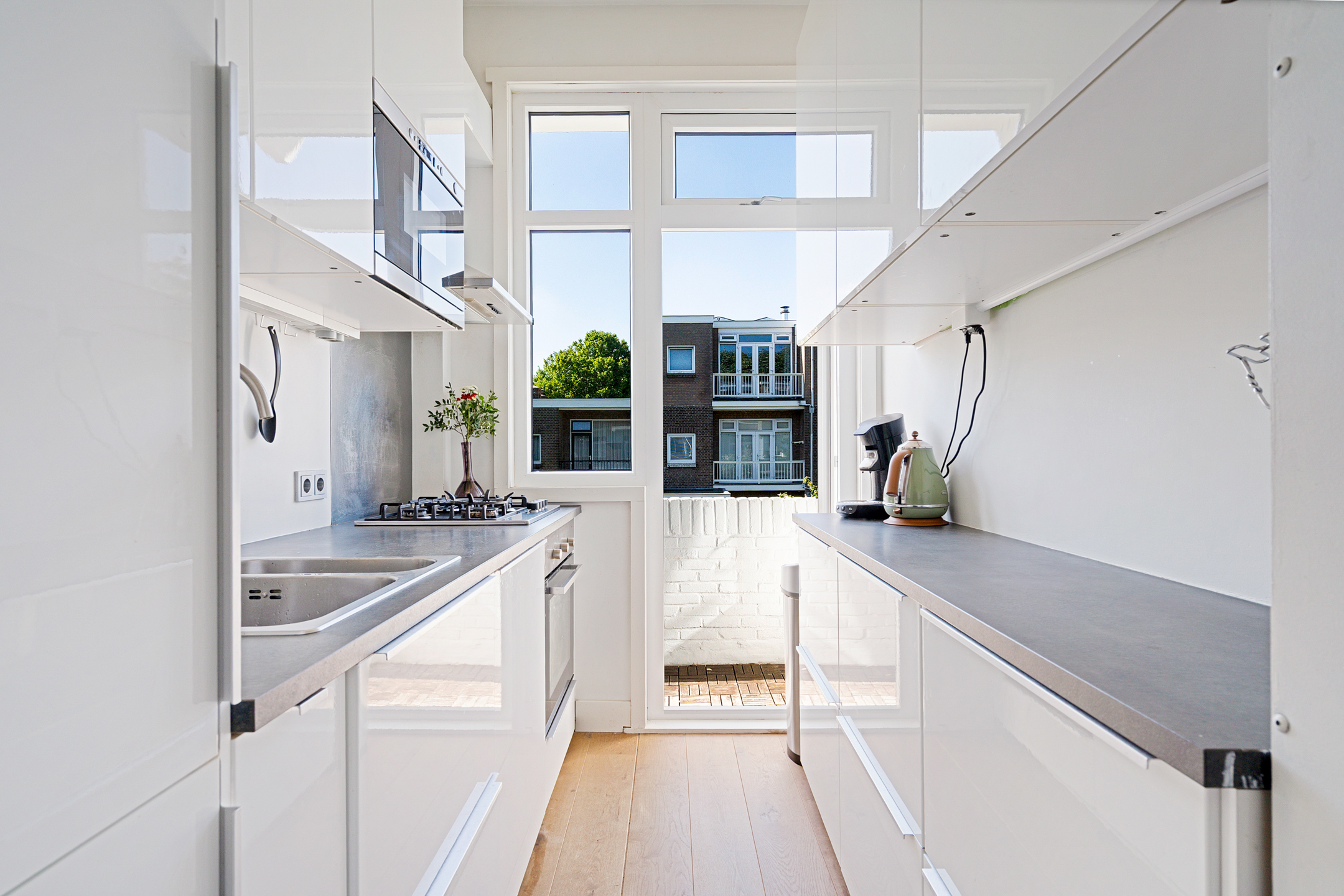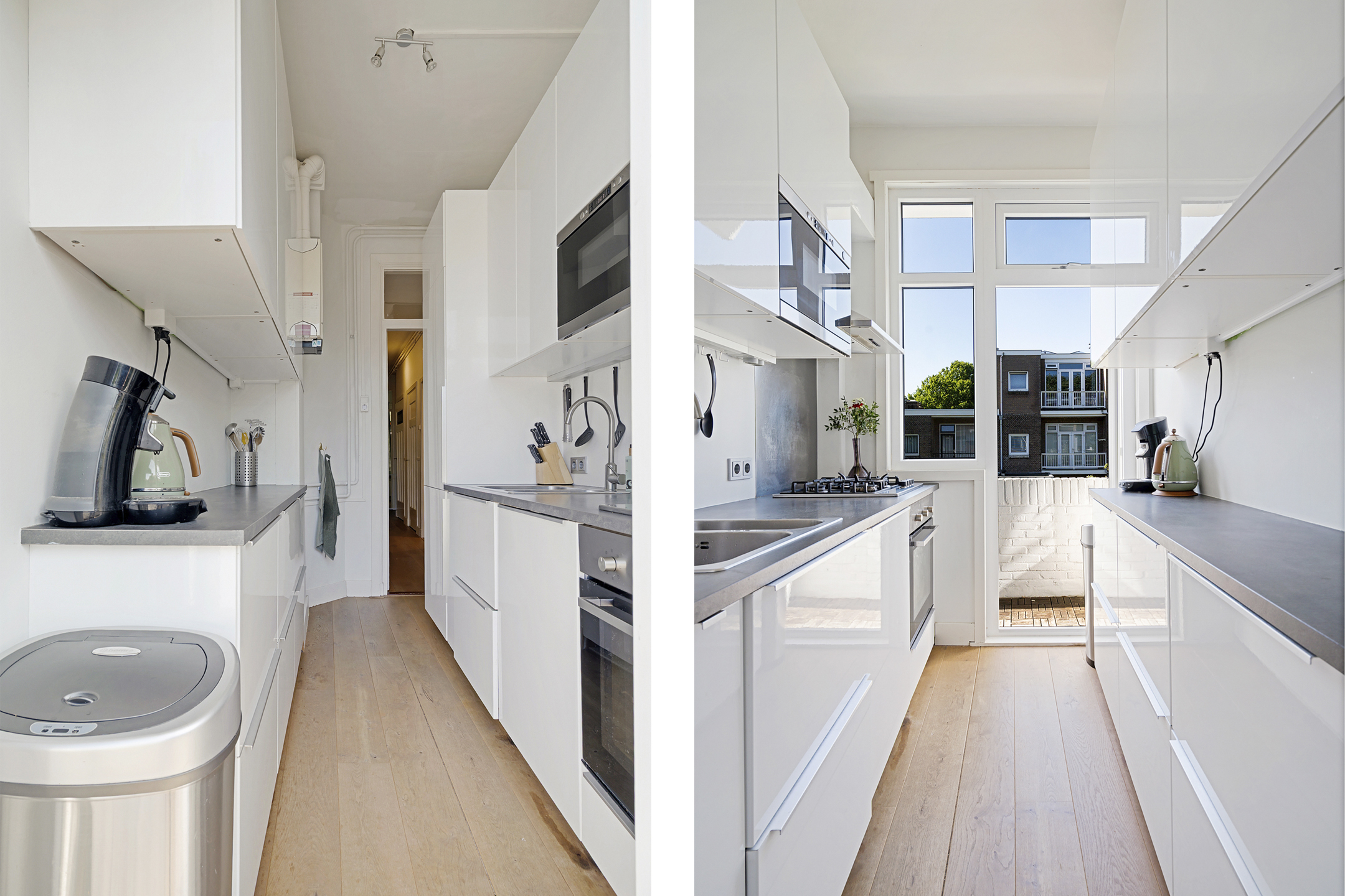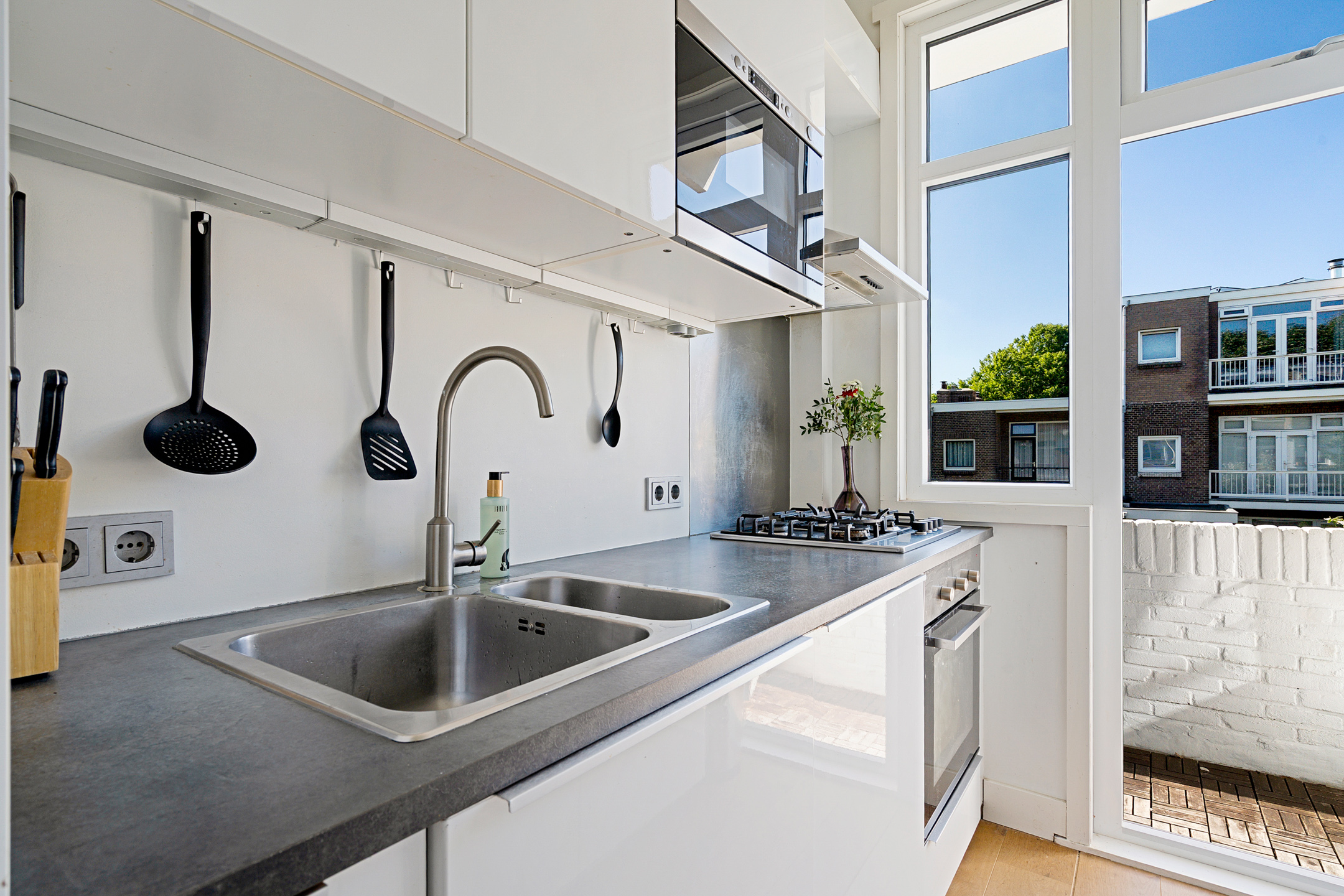 De moderne keuken is praktisch ingericht en van alle gemakken voorzien: een 4-pits gasfornuis, afzuigkap, oven, magnetron, vaatwasser en een koel-/vriescombinatie. Vanuit de keuken stap je zo het balkon op, gelegen op het zonnige zuidwesten – een fijne plek om buiten te zitten.
