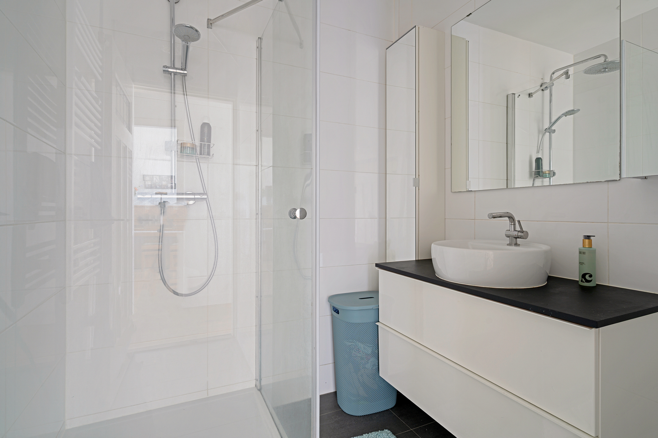 De moderne badkamer is verzorgd afgewerkt en voorzien van een inloopdouche, een stijlvol wastafelmeubel met waskom en een spiegelkast.