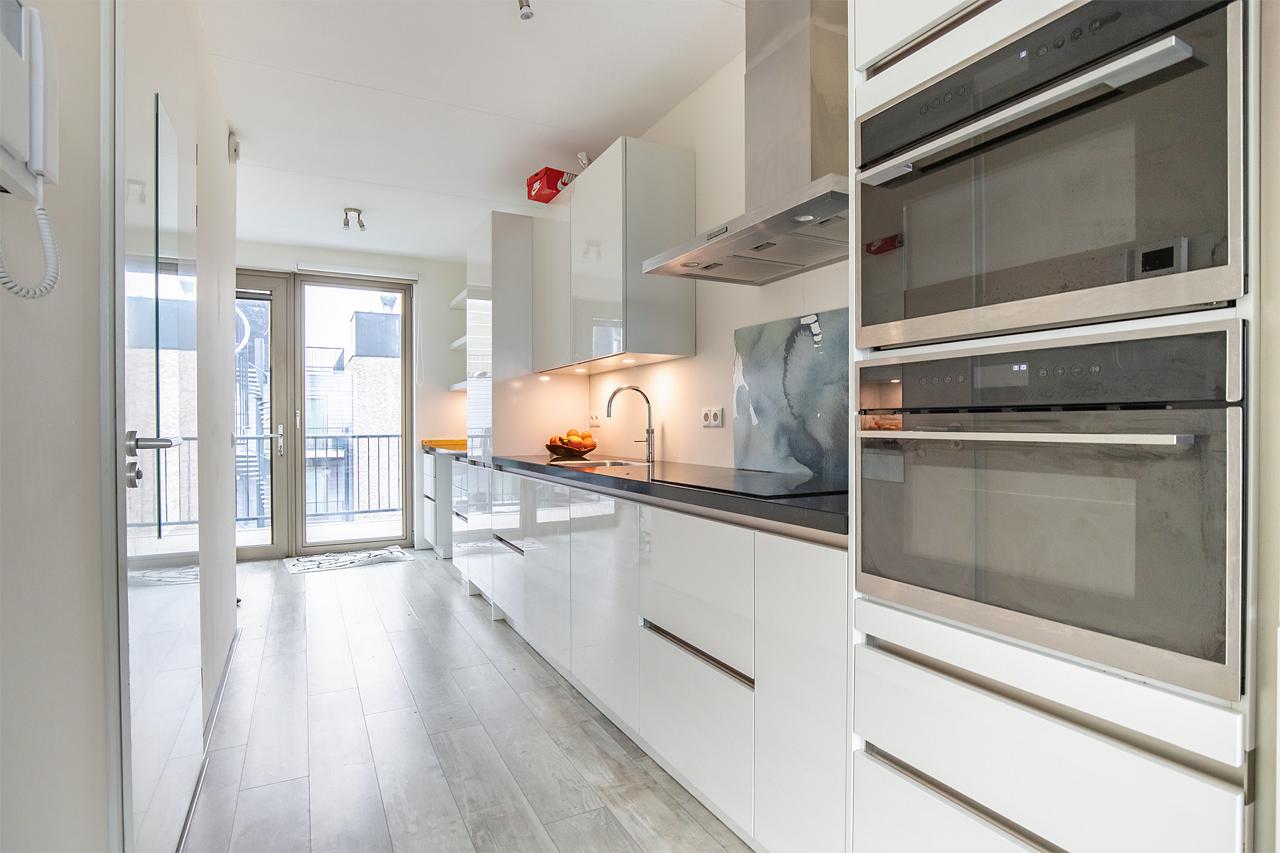 De luxe open keuken is voorzien van hoogwaardige inbouwapparatuur én een Quooker. Lichte woonkamer met Frans balkon en een nette laminaatvloer door de hele woning.