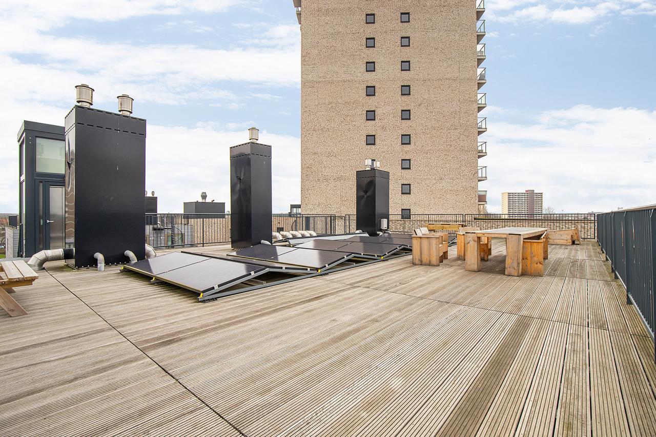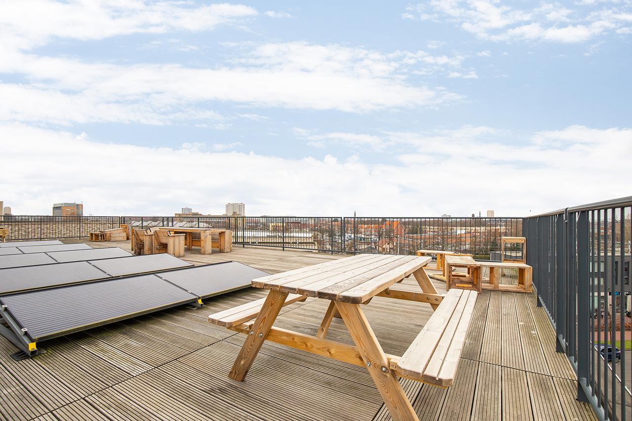 Geniet van het gezamenlijke dakterras boven op het complex. Energielabel A en optie tot het huren van een parkeerplaats op afgesloten terrein.