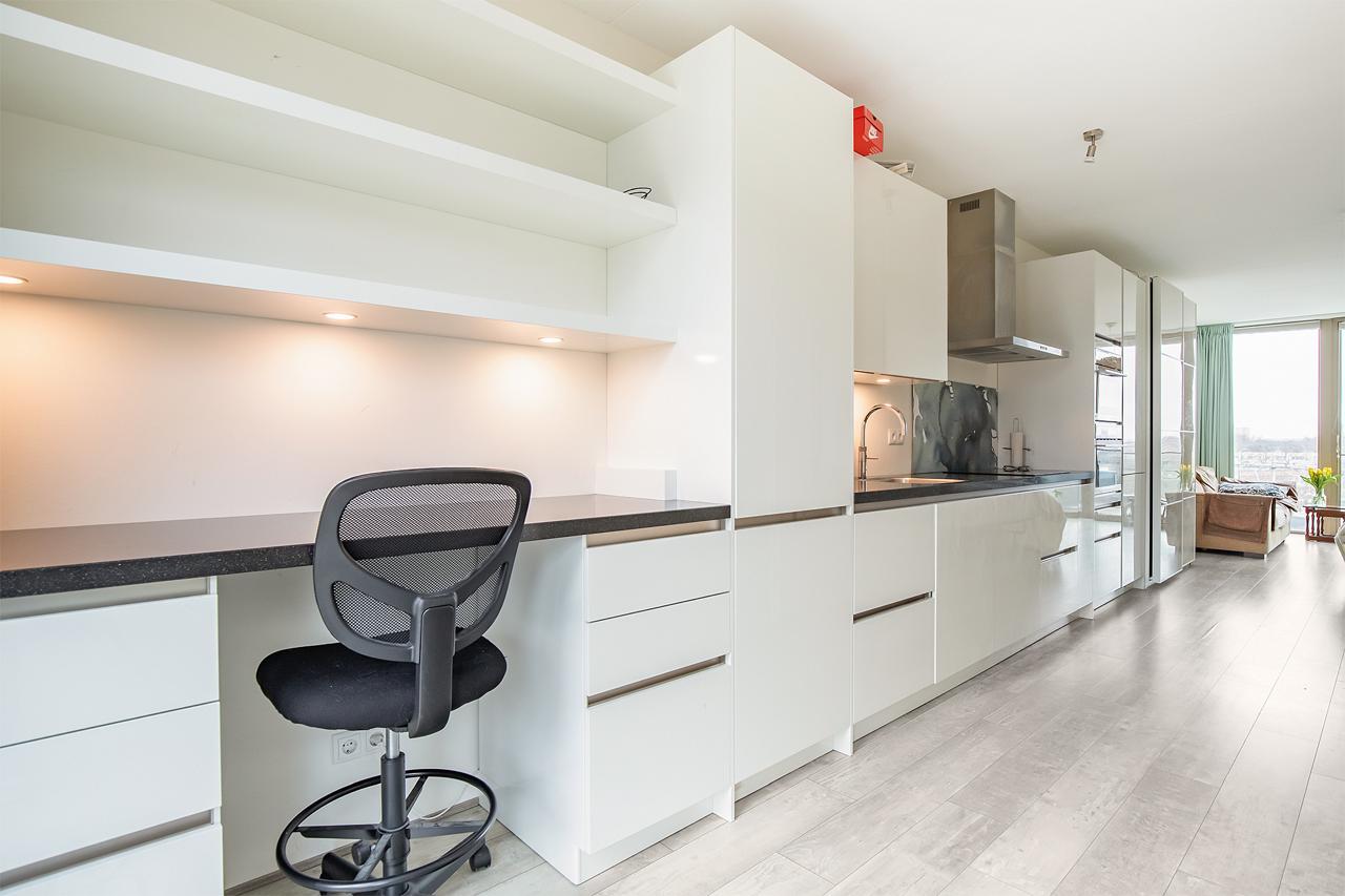 Het appartement beschikt over een gezamenlijke entree met brievenbussen en videophone, een lift of trap naar de 4e etage, een luxe keuken met moderne apparatuur plus een Quooker, een ruime woon-/eetkamer met groot volledig openslaand raam voor een prachtig uitzicht. Via de lift heeft u toegang tot het gezamenlijke dakterras op de 5e etage, met adembenemend uitzicht over de skyline van Den Haag.