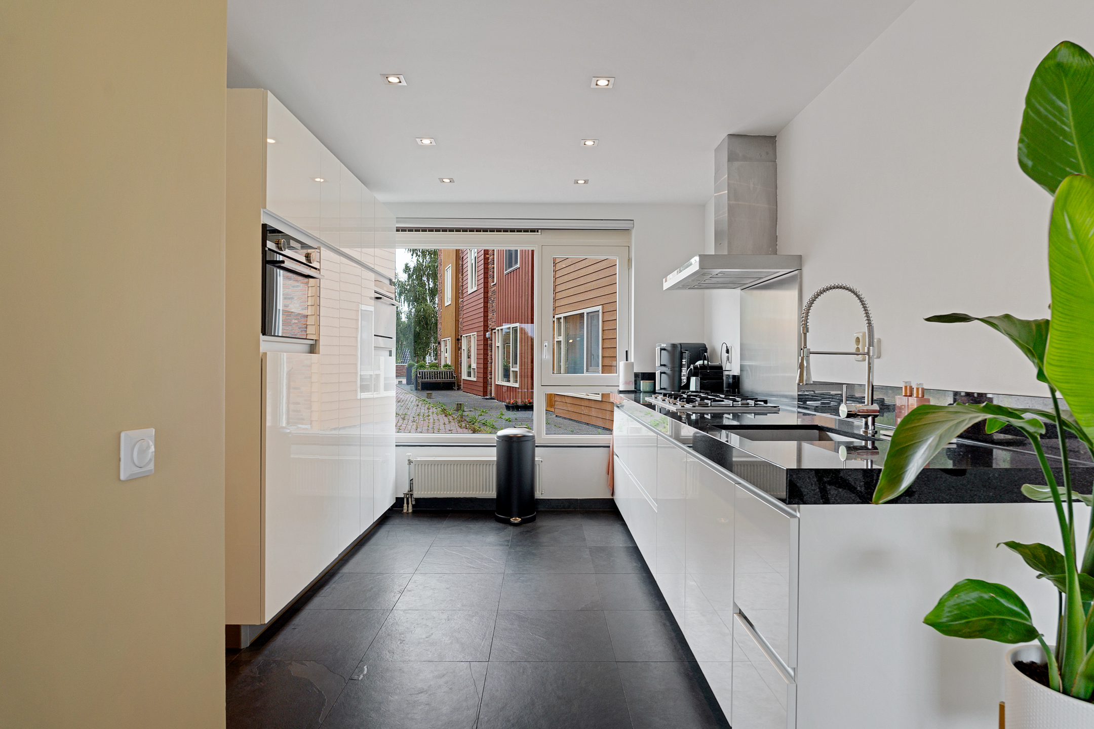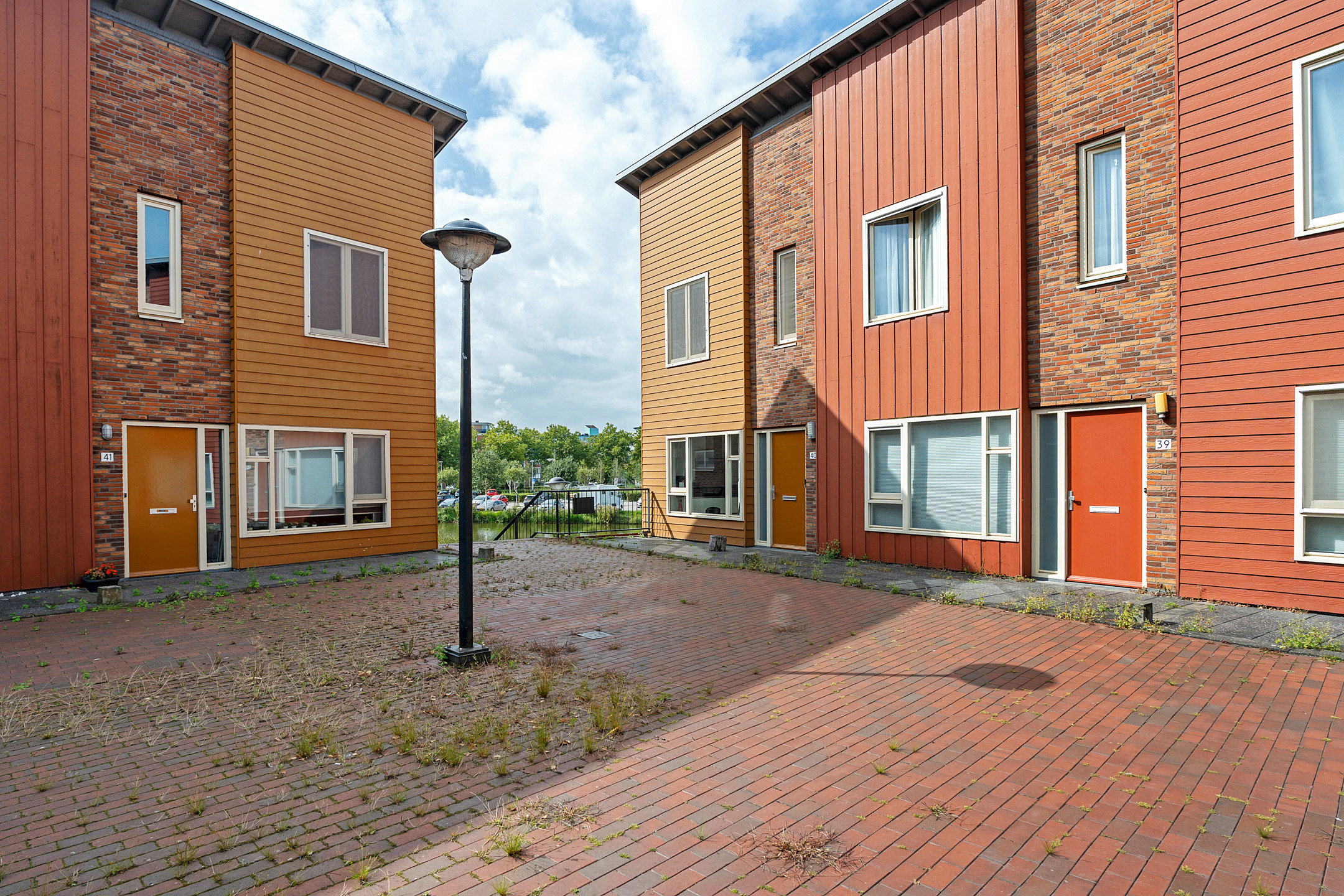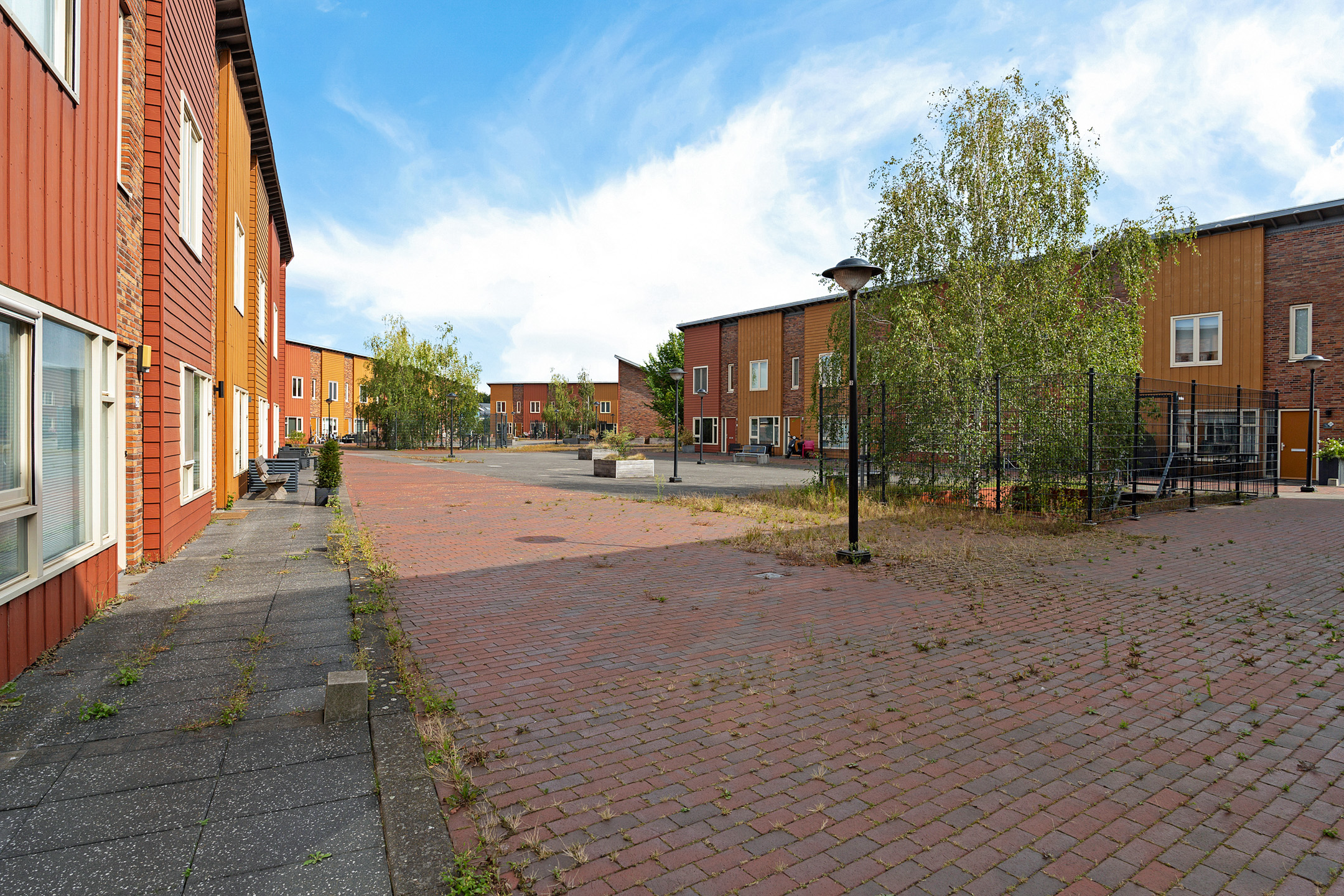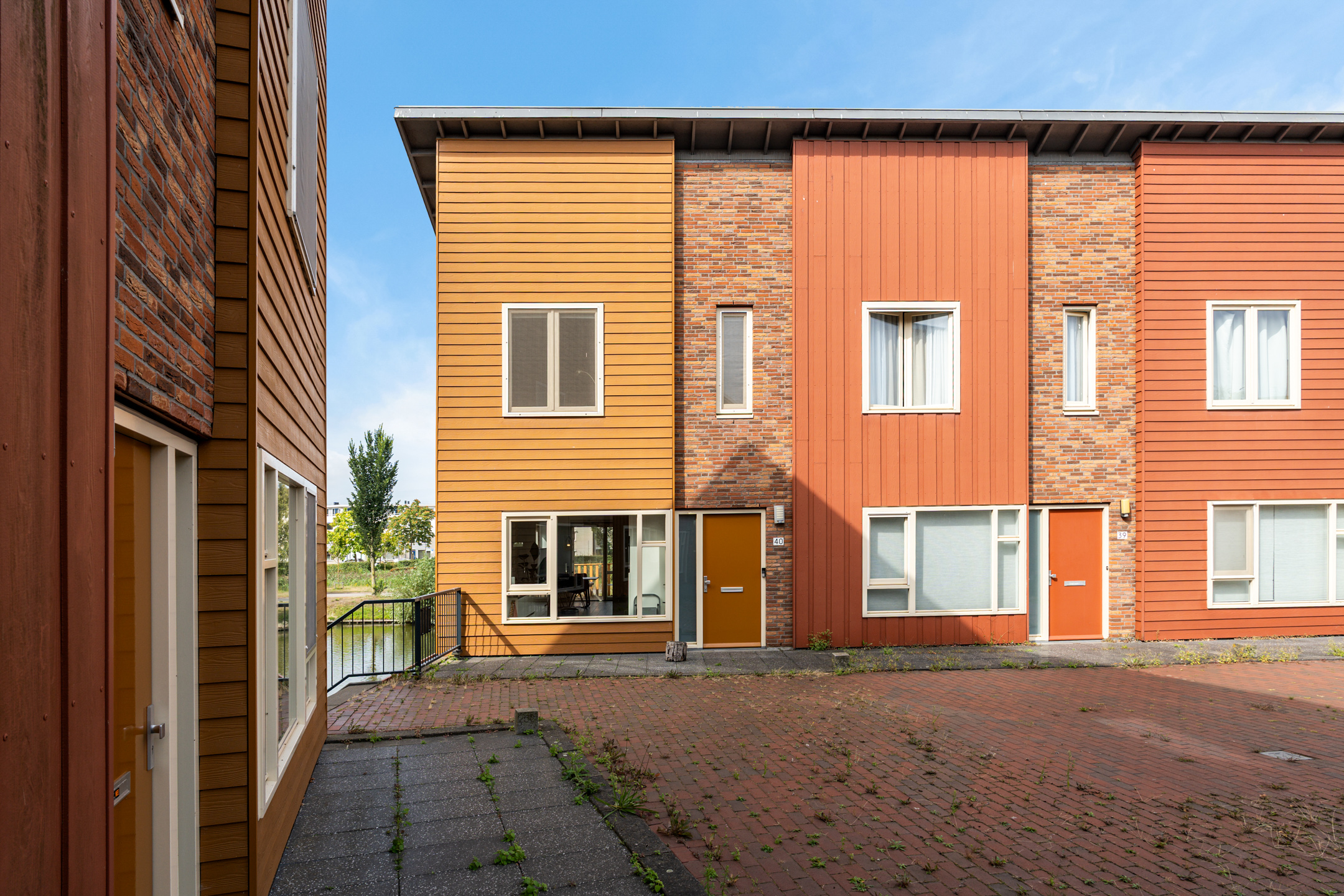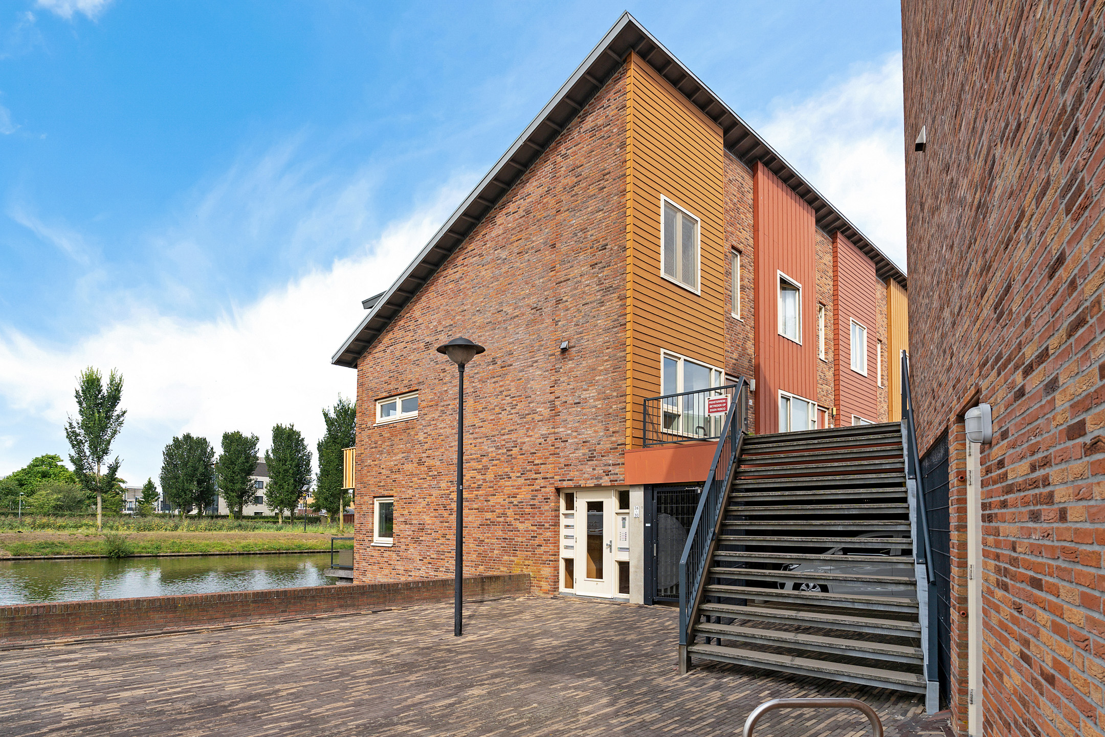 De voordeur grenst aan een autovrije binnenplaats met speelruimte voor kinderen, terwijl je aan de achterzijde vrij uitzicht hebt over het water, een rustige en groene setting waar je iedere dag van geniet.