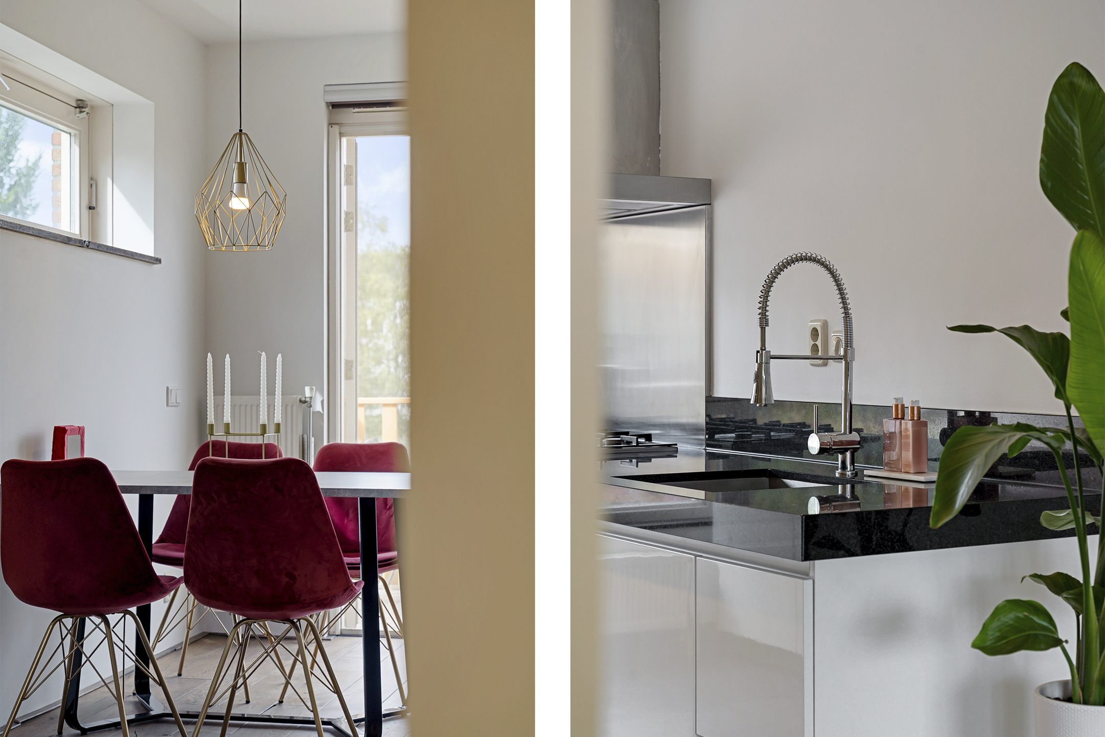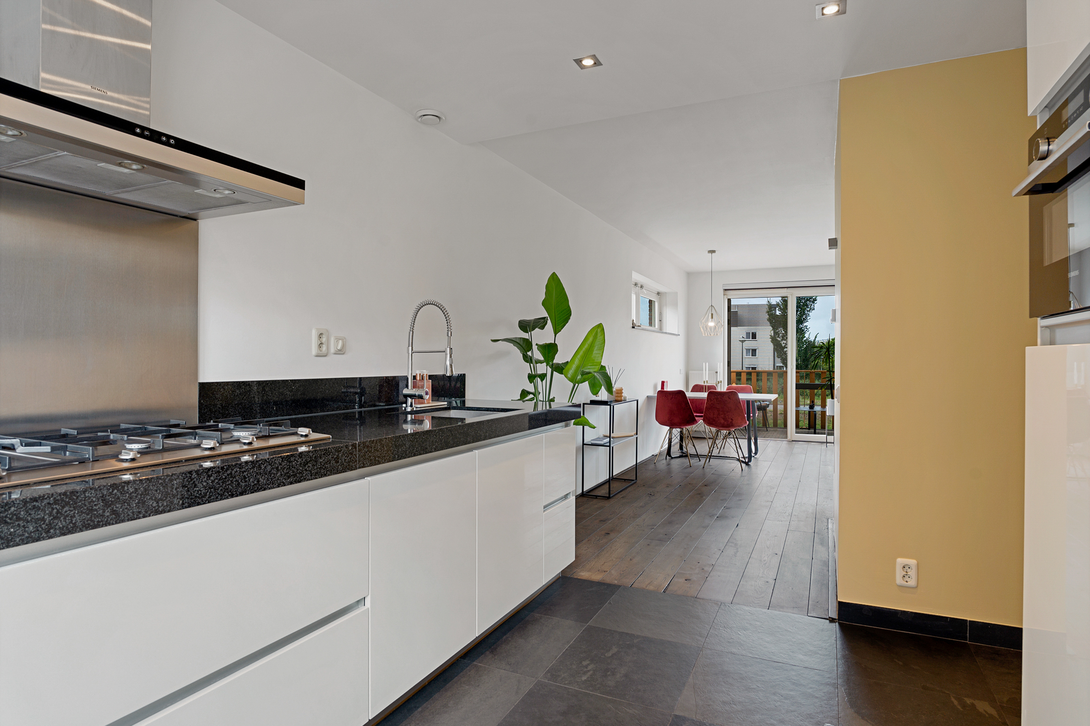 Aan de voorzijde ligt de moderne open keuken, uitgevoerd in een stijlvolle rechte opstelling met hoogwaardige Siemens-inbouwapparatuur: een 5-pits gaskookplaat, stoomoven, combi-magnetron, afzuigkap, vaatwasser, koelkast en vriezer. De keuken is strak afgewerkt en biedt volop werk- en bergruimte.