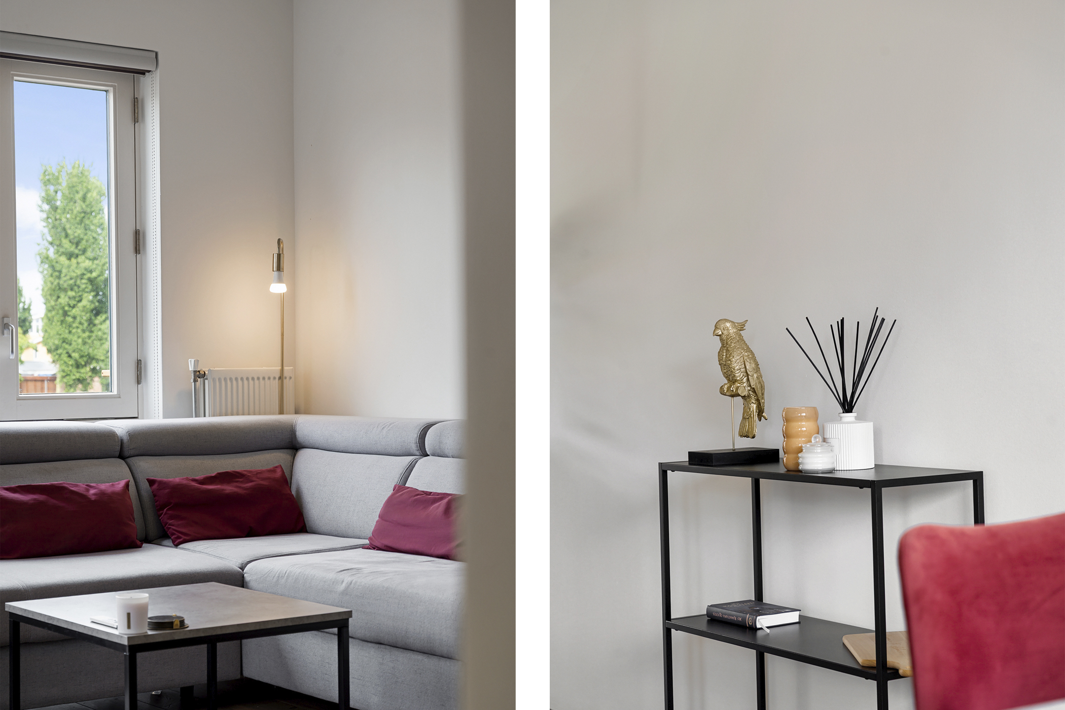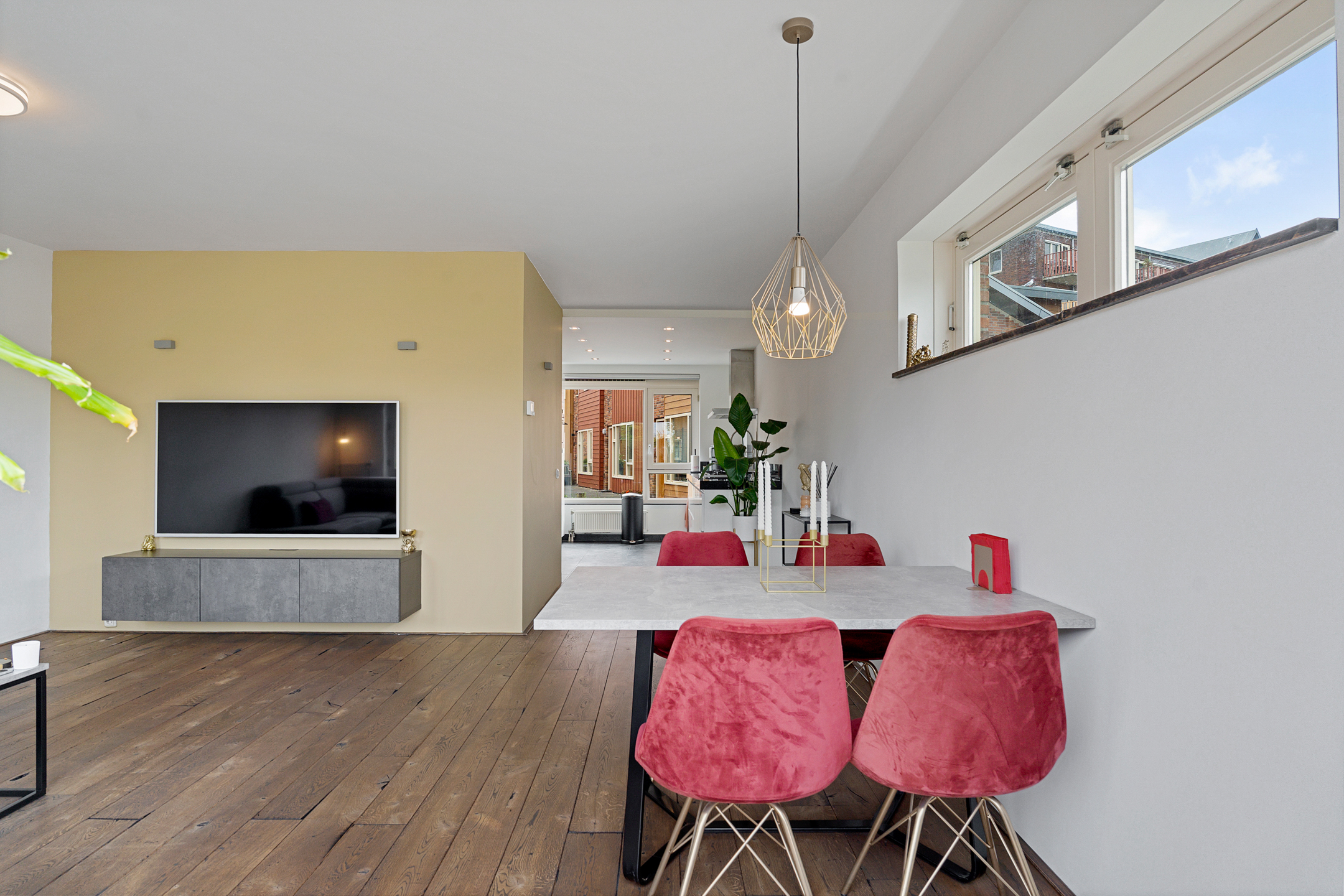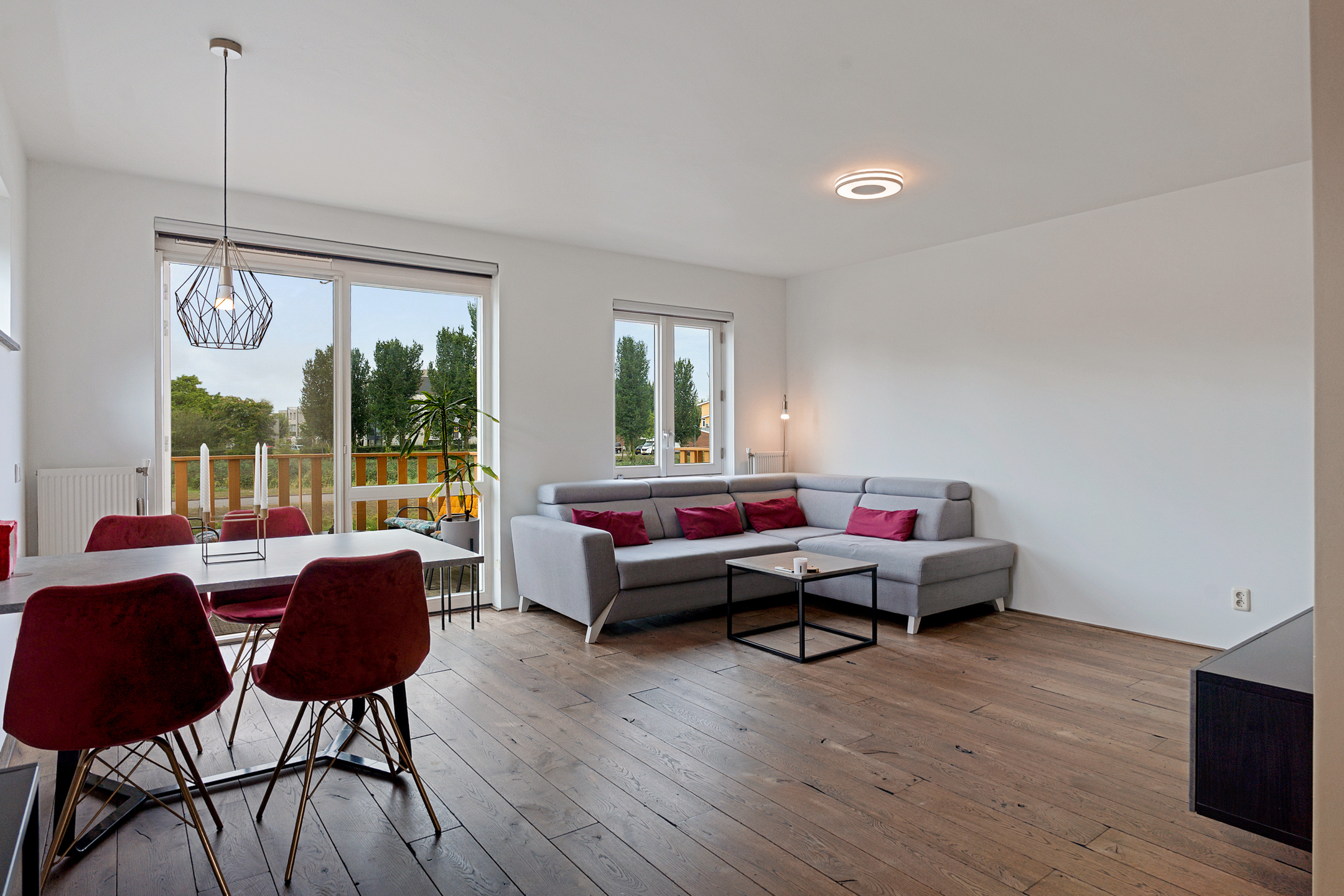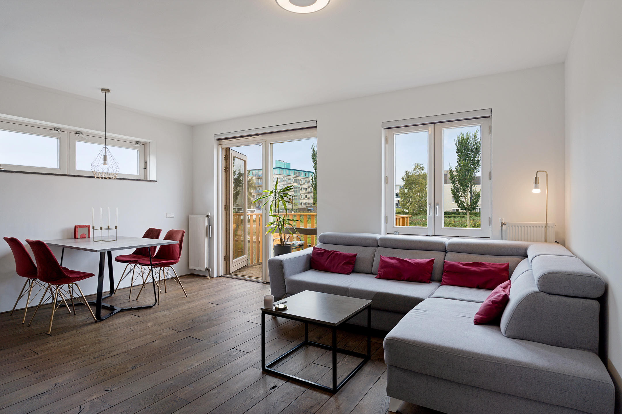 De ruime woonkamer ligt aan de achterzijde en heeft een sfeervolle eiken houten vloer, een gezellige zithoek en veel licht dankzij de grote ramen. Via de deur stap je zo het balkon op, gelegen op het westen, waar je heerlijk van de middag- en avondzon kunt genieten.