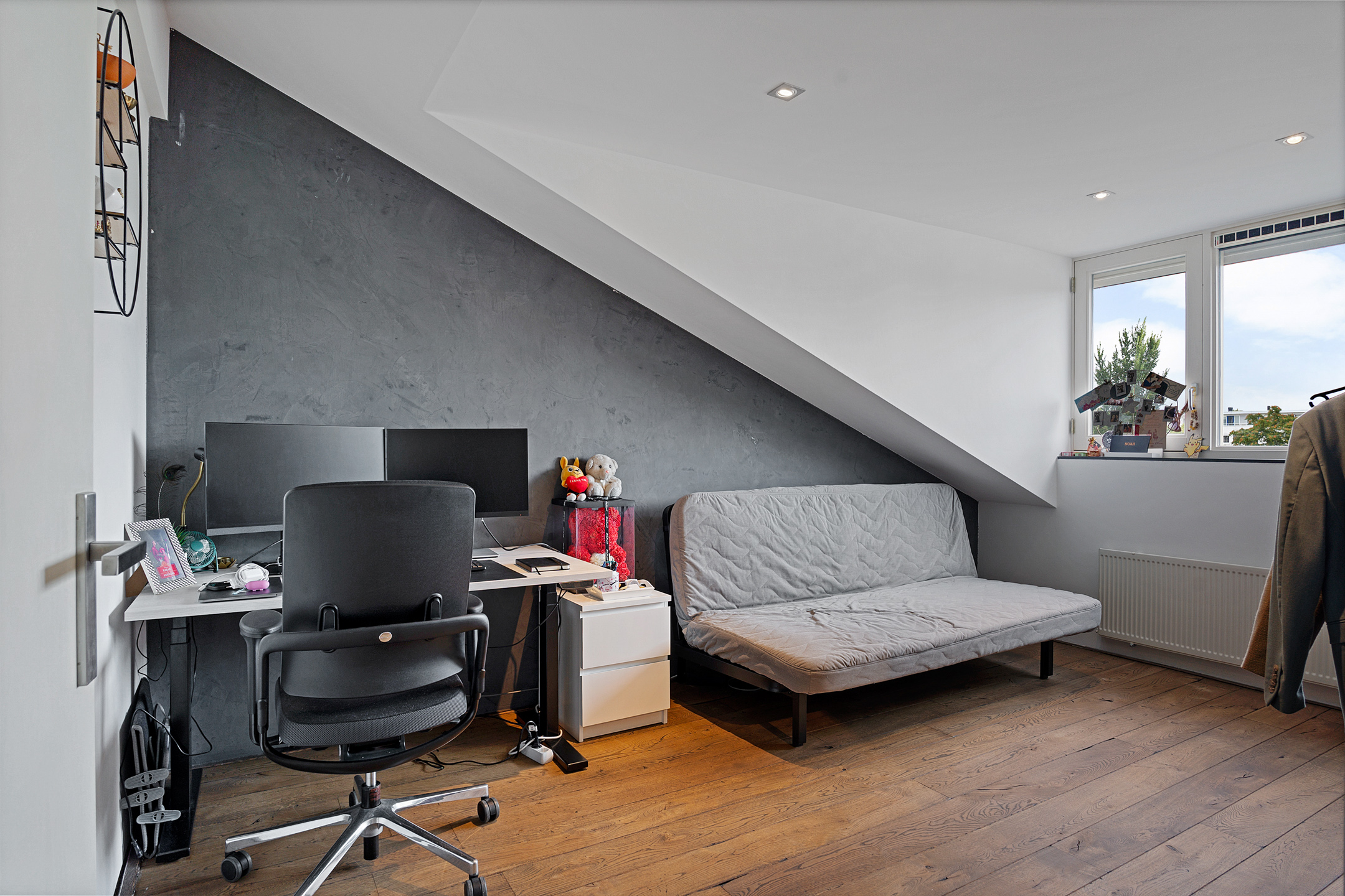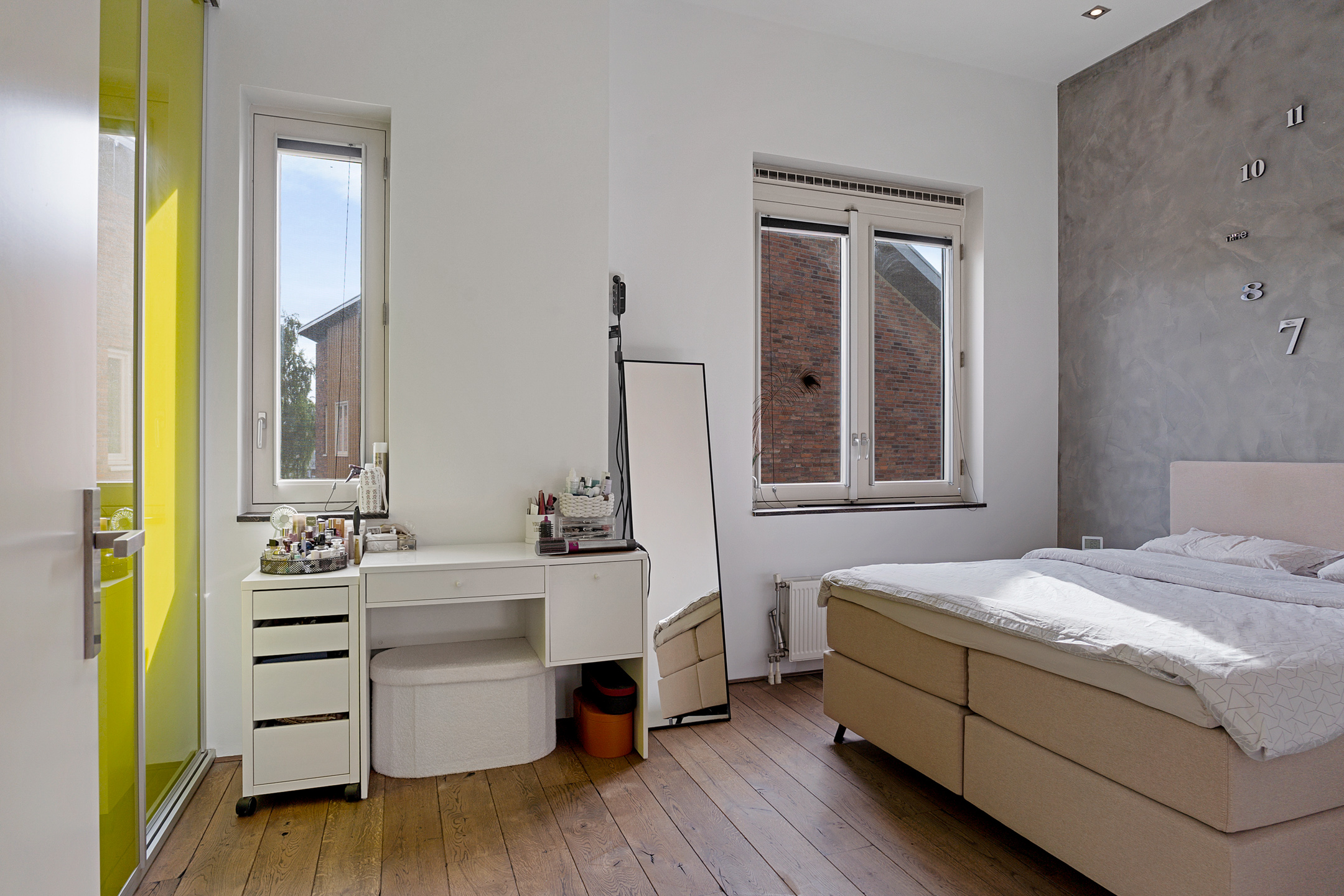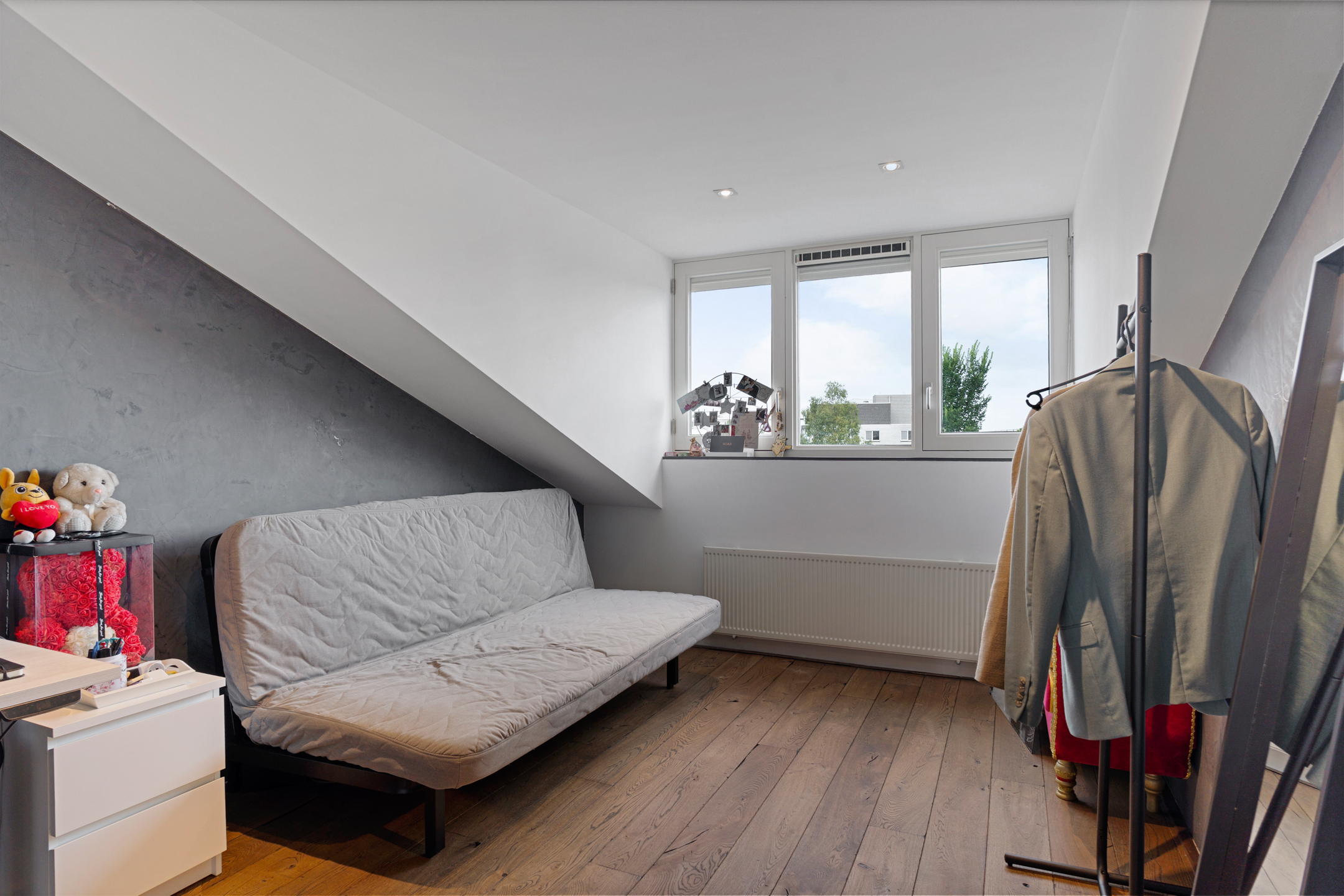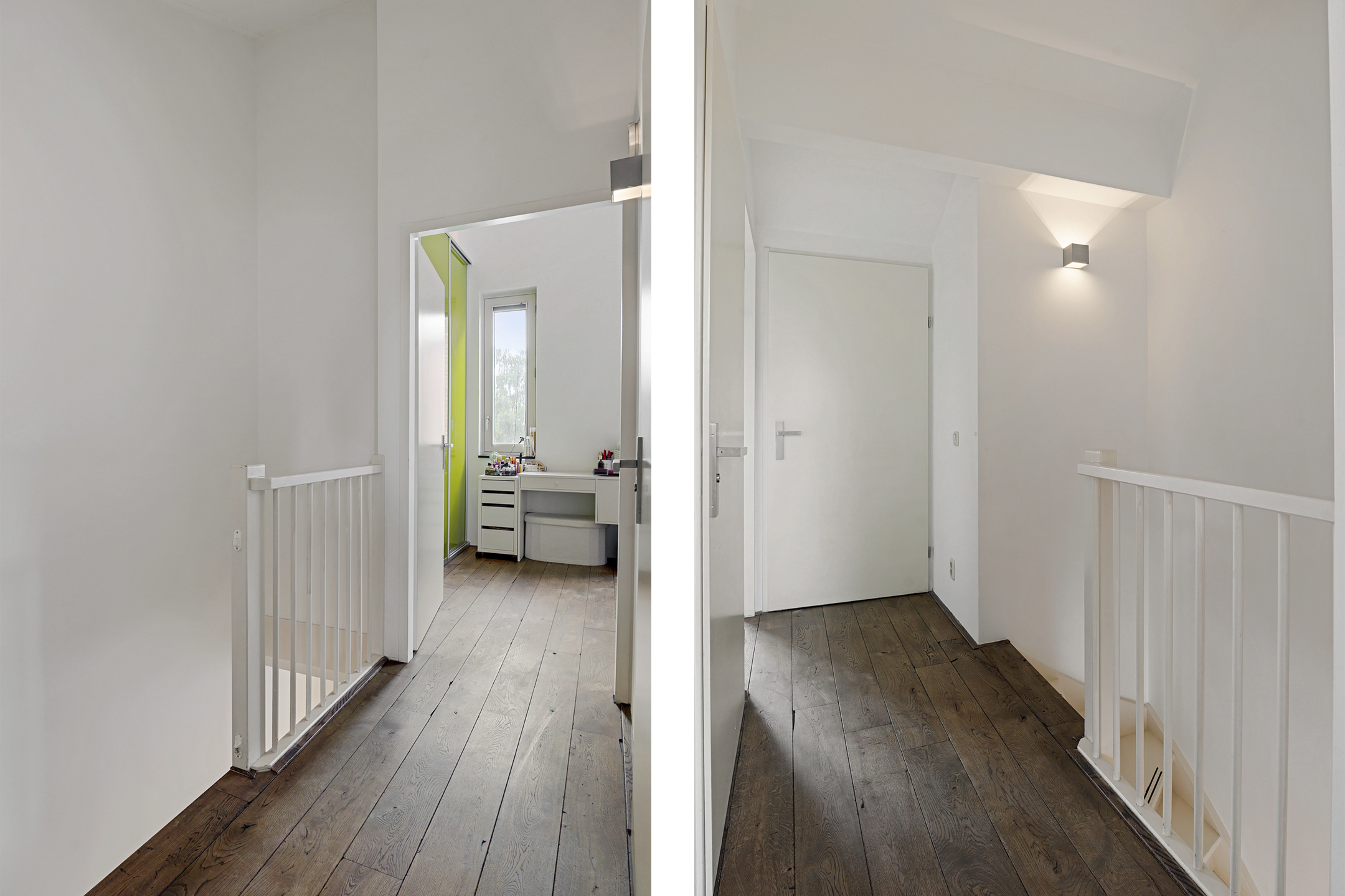 Op de eerste verdieping bevinden zich twee ruime slaapkamers. De hoofdslaapkamer aan de voorzijde heeft een prettige plafondhoogte en een grote vaste kastenwand. De tweede slaapkamer aan de achterzijde is eveneens licht en praktisch in te delen.