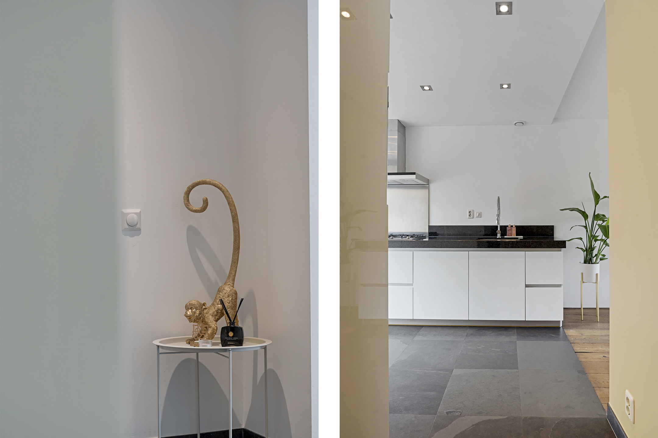 Via je eigen voordeur op straatniveau kom je binnen in een verzorgde hal met plavuizen vloer, trapkast en een modern toilet (2021) met fonteintje. De woning is volledig voorzien van houten kozijnen met dubbel glas en strakke wandafwerking.