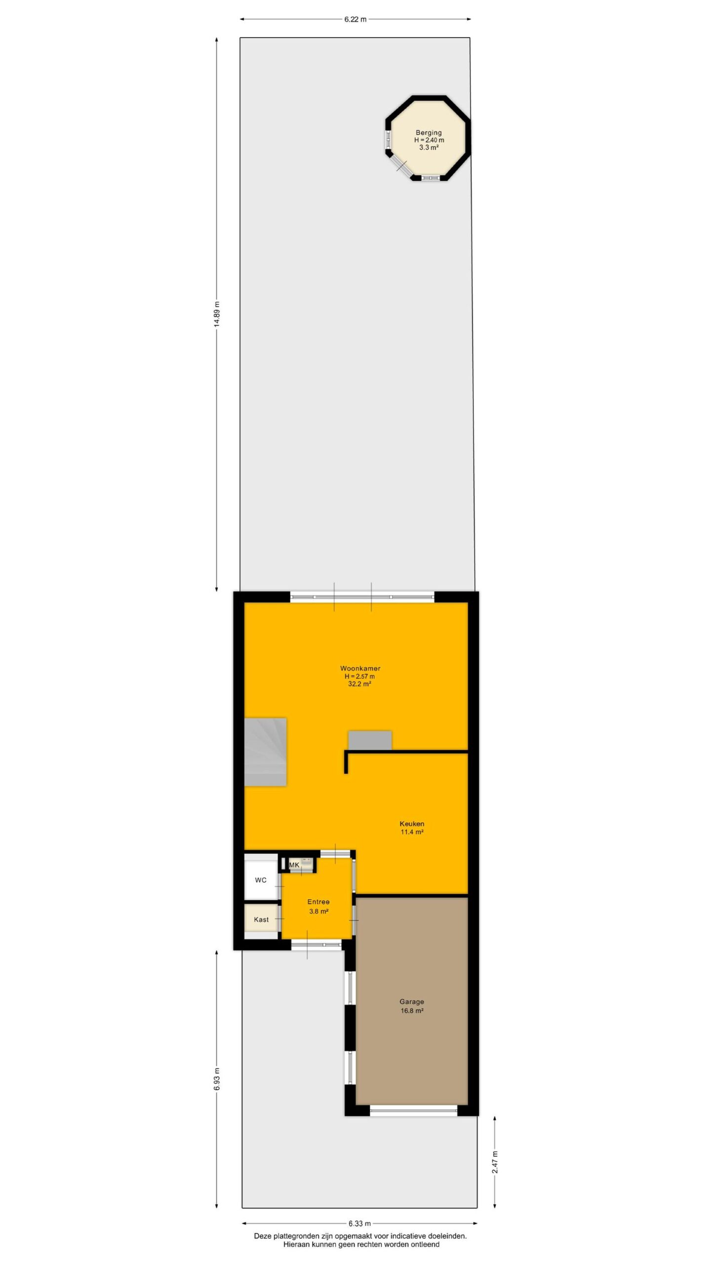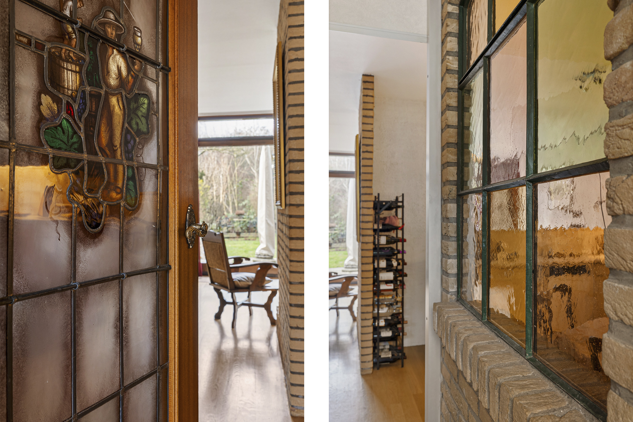 Binnenkomst in een ruime hal met trapopgang. De royale woonkamer van ca. 42 m² is licht en ruim dankzij de grote raampartijen en beschikt over een open haard. Open keuken van ca. 11 m². Vanuit de woonkamer toegang tot de tuin en de aangebouwde garage (ca. 16 m²).