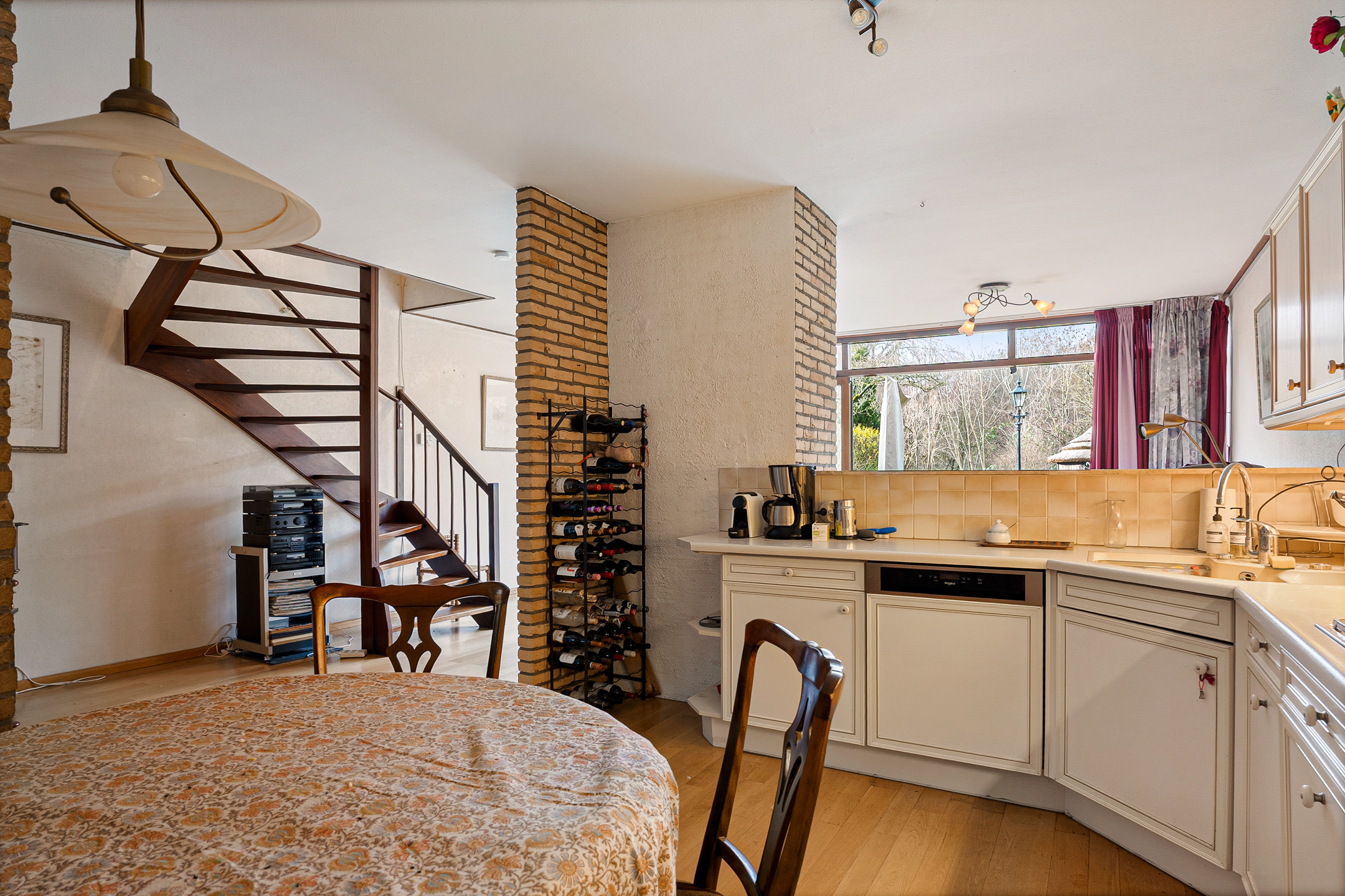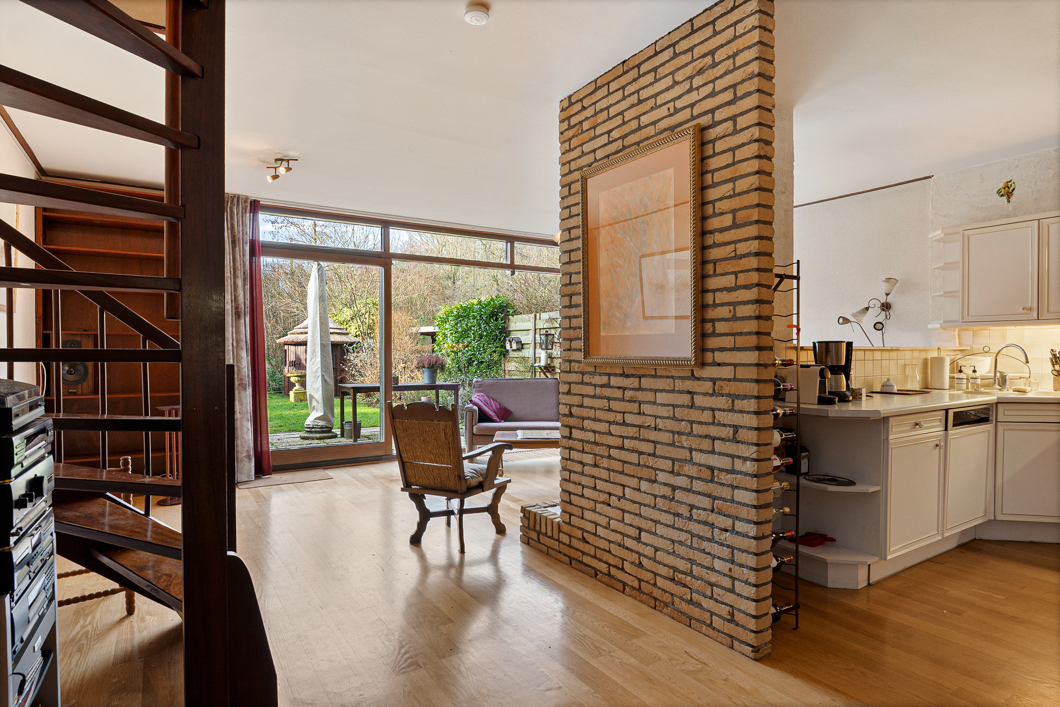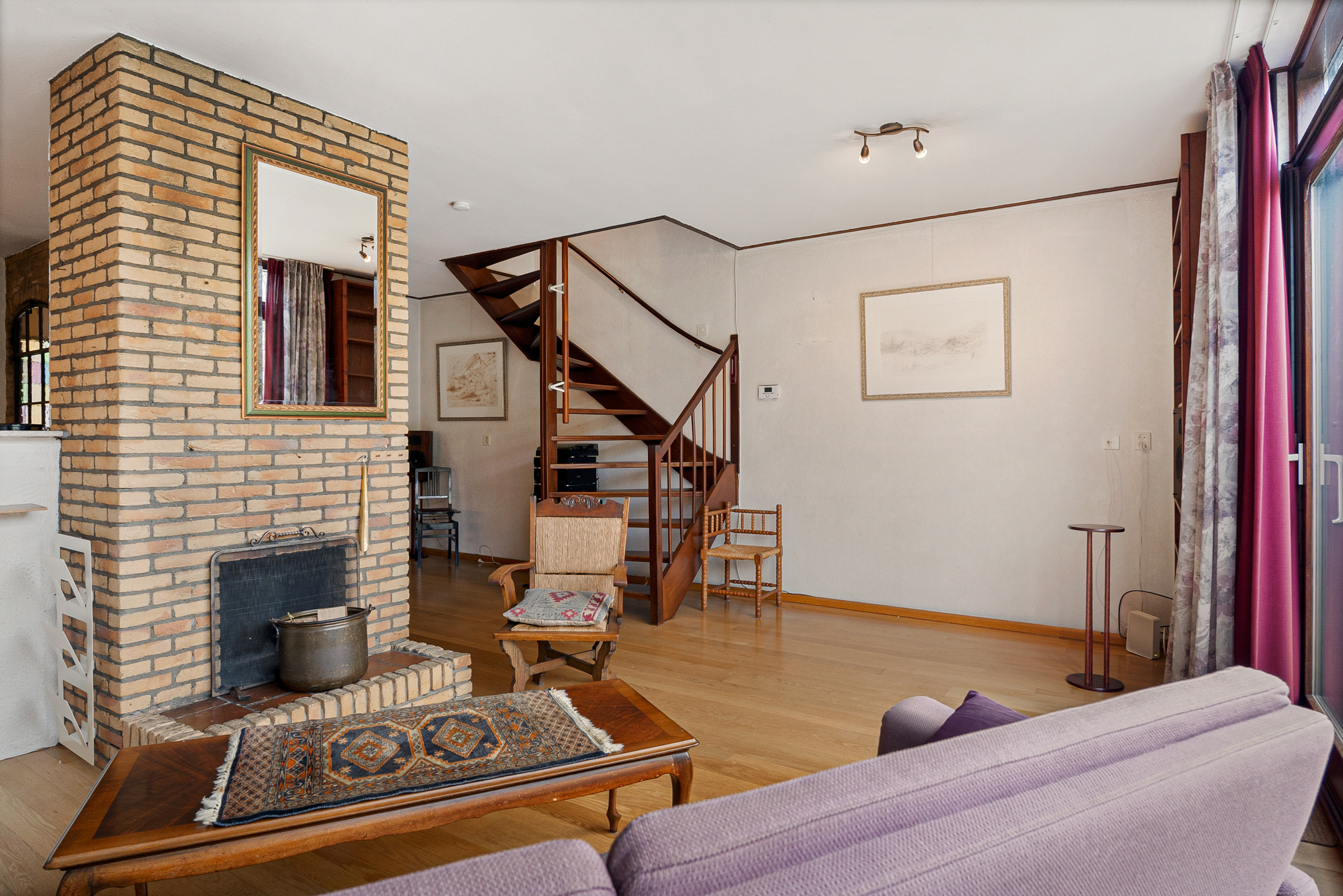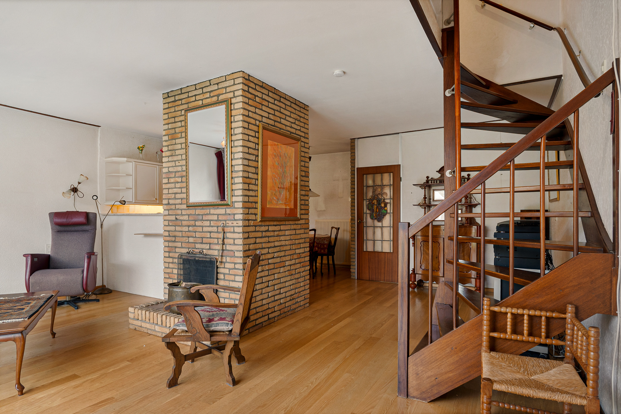 De begane grond biedt een lichte woonkamer met open haard en grote raampartijen die zorgen voor een prettige verbinding met buiten. Vanuit de woning geniet je van een vrij en groen uitzicht, wat zorgt voor een gevoel van ruimte en privacy. De open keuken maakt het geheel compleet.