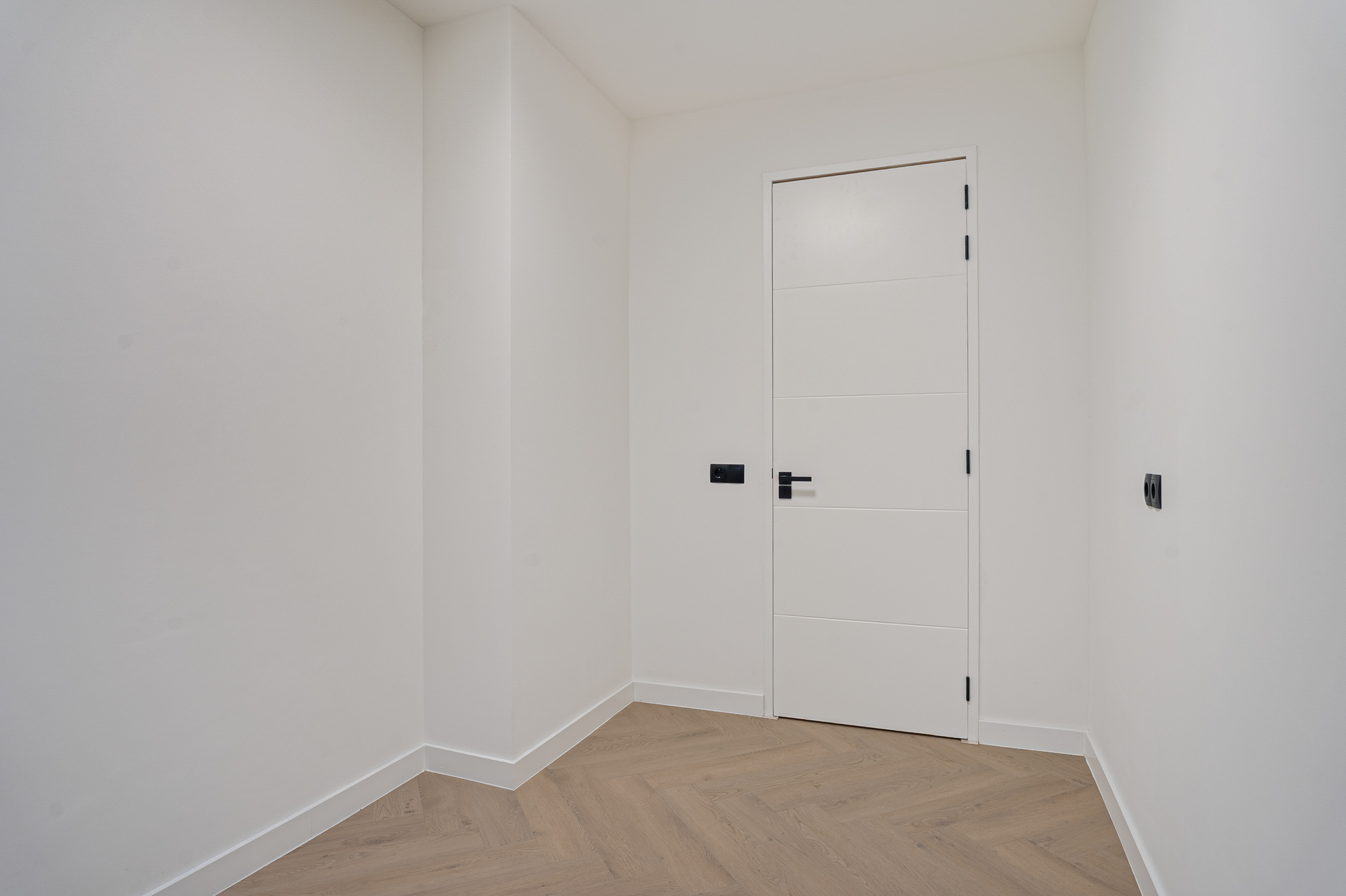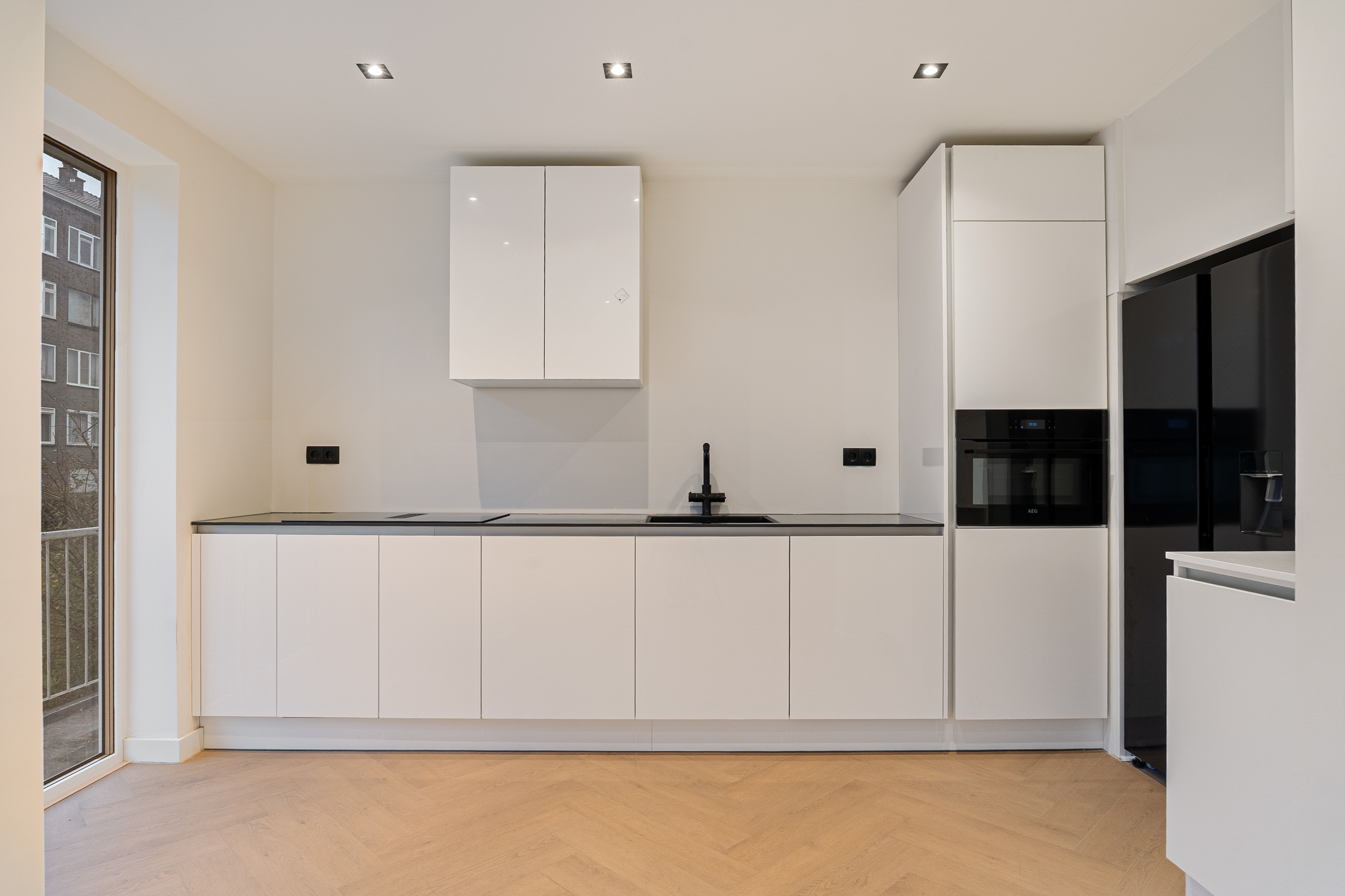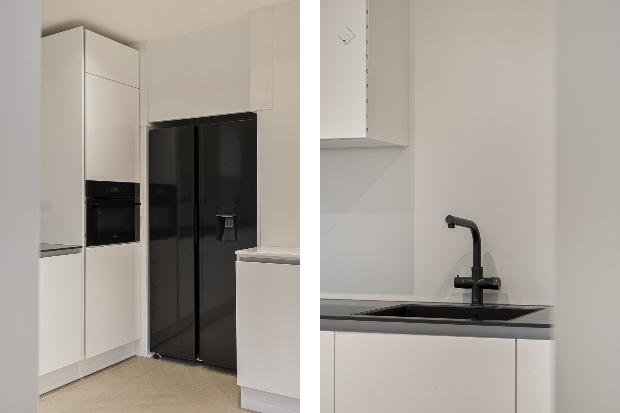 De lichte woonkamer voelt direct prettig aan door de moderne afwerking en de ruime indeling. De cinewall met elektrische haard vormt een sfeervol middelpunt en geeft de ruimte een luxe uitstraling. De open keuken sluit mooi aan op de woonkamer en is uitgerust met een strak keukenblok met inductiekookplaat met geïntegreerde afzuiging, oven en voldoende bergruimte. Vanuit de keuken stap je het balkon op (zuidoost), ideaal om van de ochtend- en middagzon te genieten.