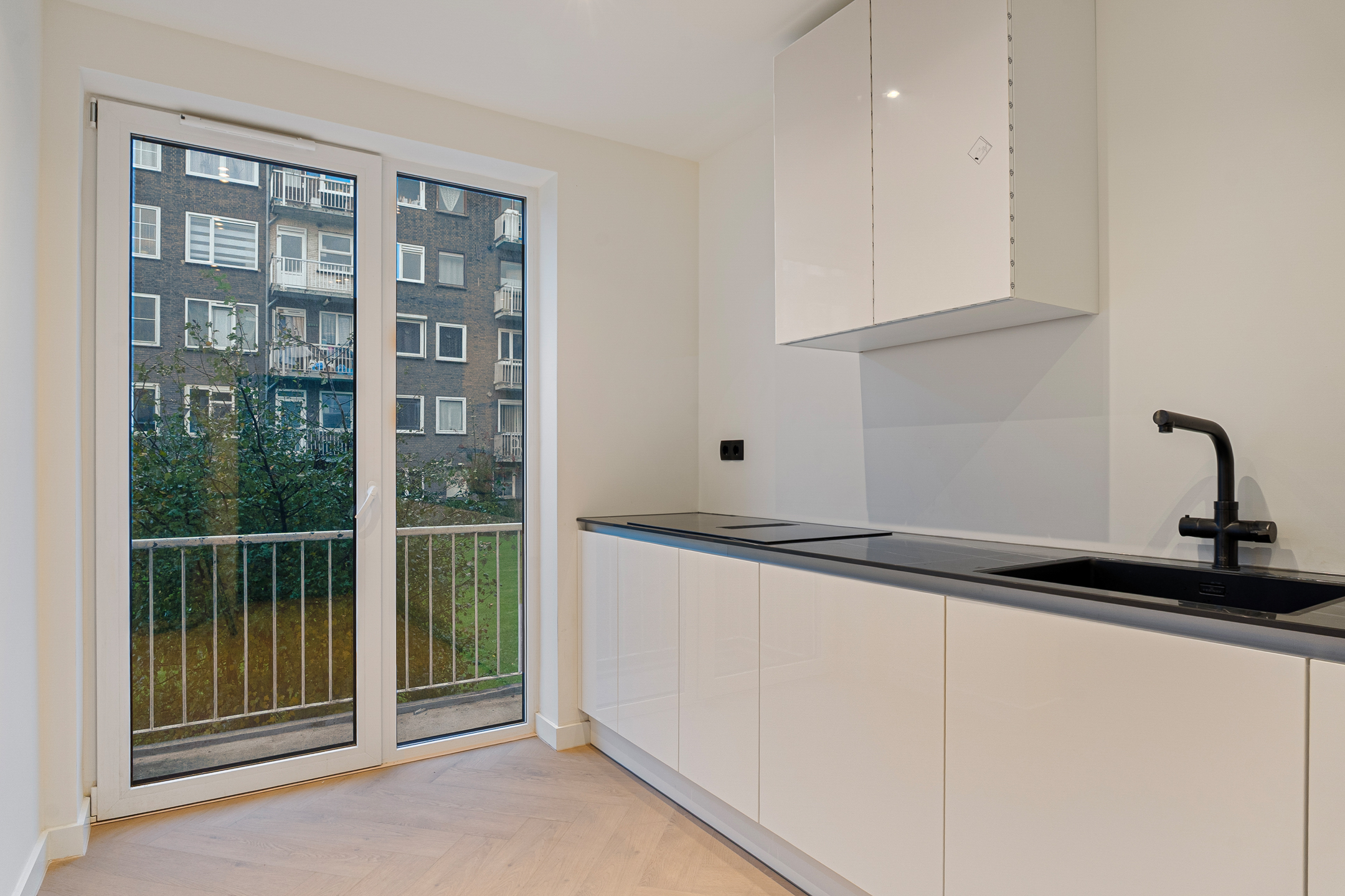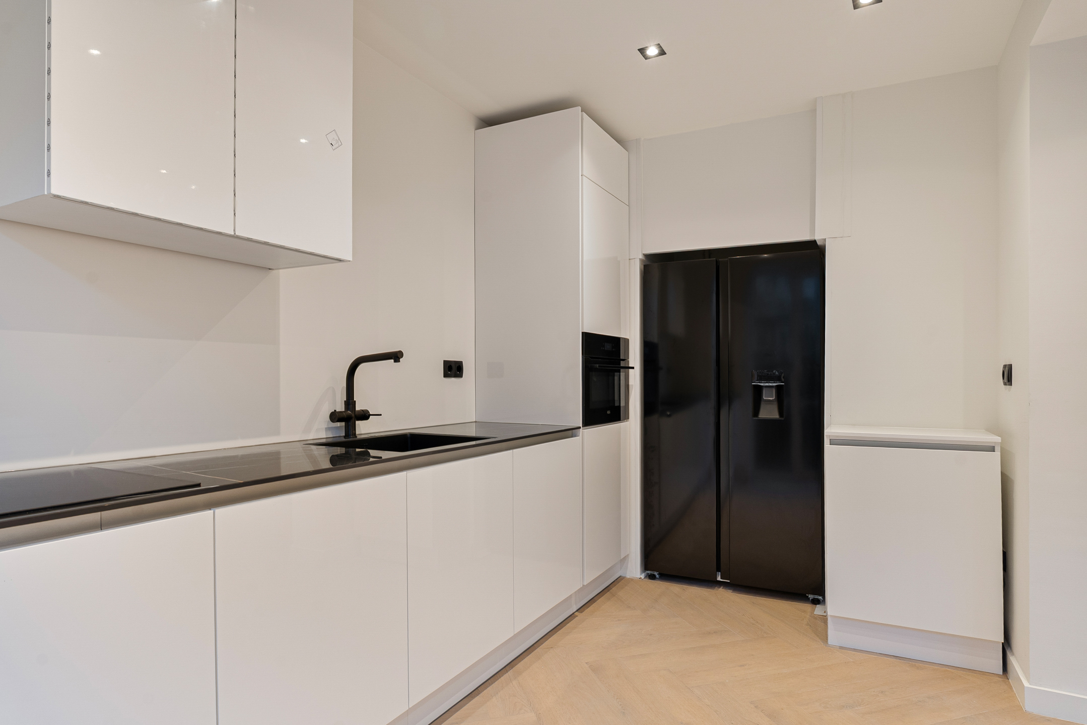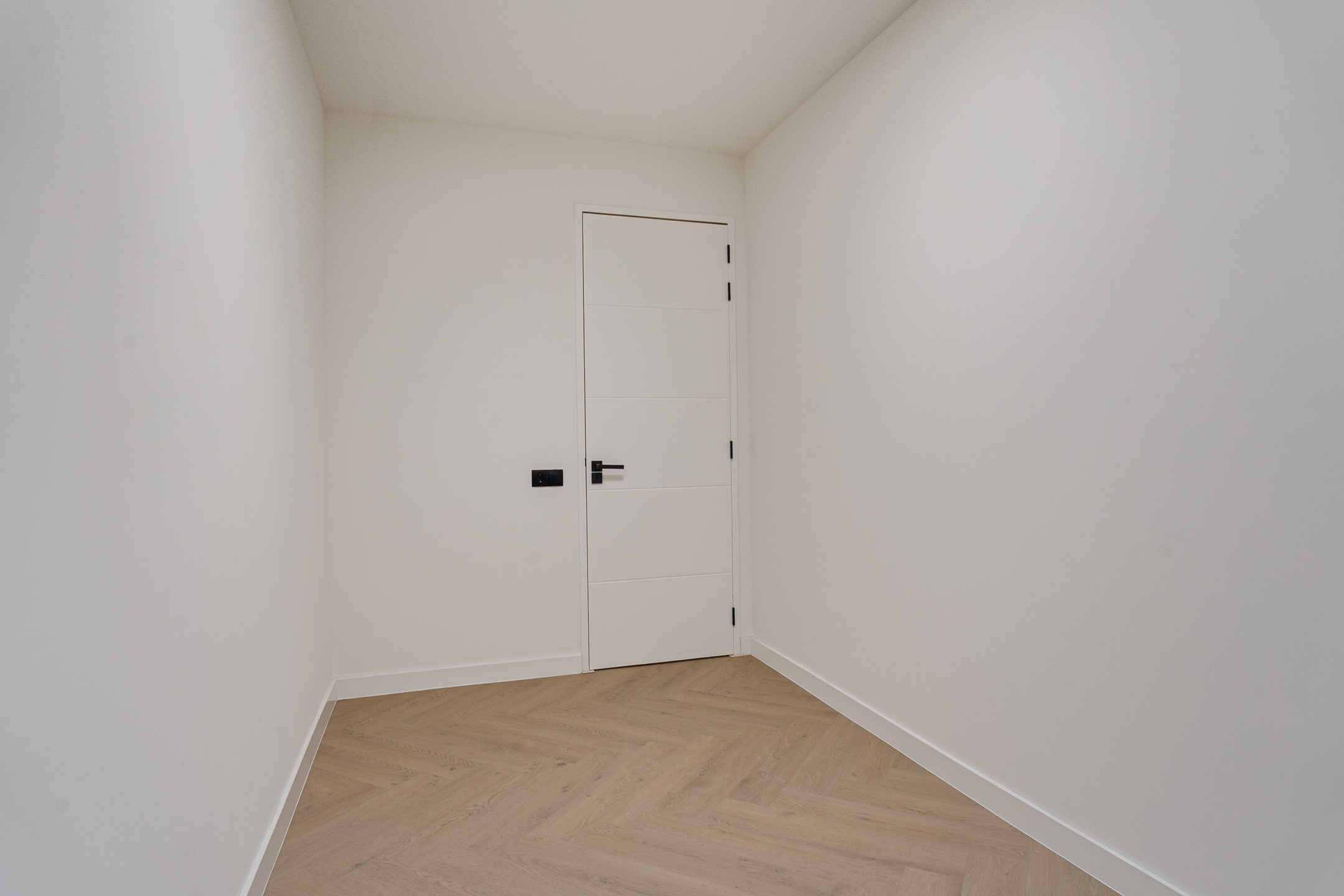 De lichte woonkamer voelt direct prettig aan door de moderne afwerking en de ruime indeling. De cinewall met elektrische haard vormt een sfeervol middelpunt en geeft de ruimte een luxe uitstraling. De open keuken sluit mooi aan op de woonkamer en is uitgerust met een strak keukenblok met inductiekookplaat met geïntegreerde afzuiging, oven en voldoende bergruimte. Vanuit de keuken stap je het balkon op (zuidoost), ideaal om van de ochtend- en middagzon te genieten.