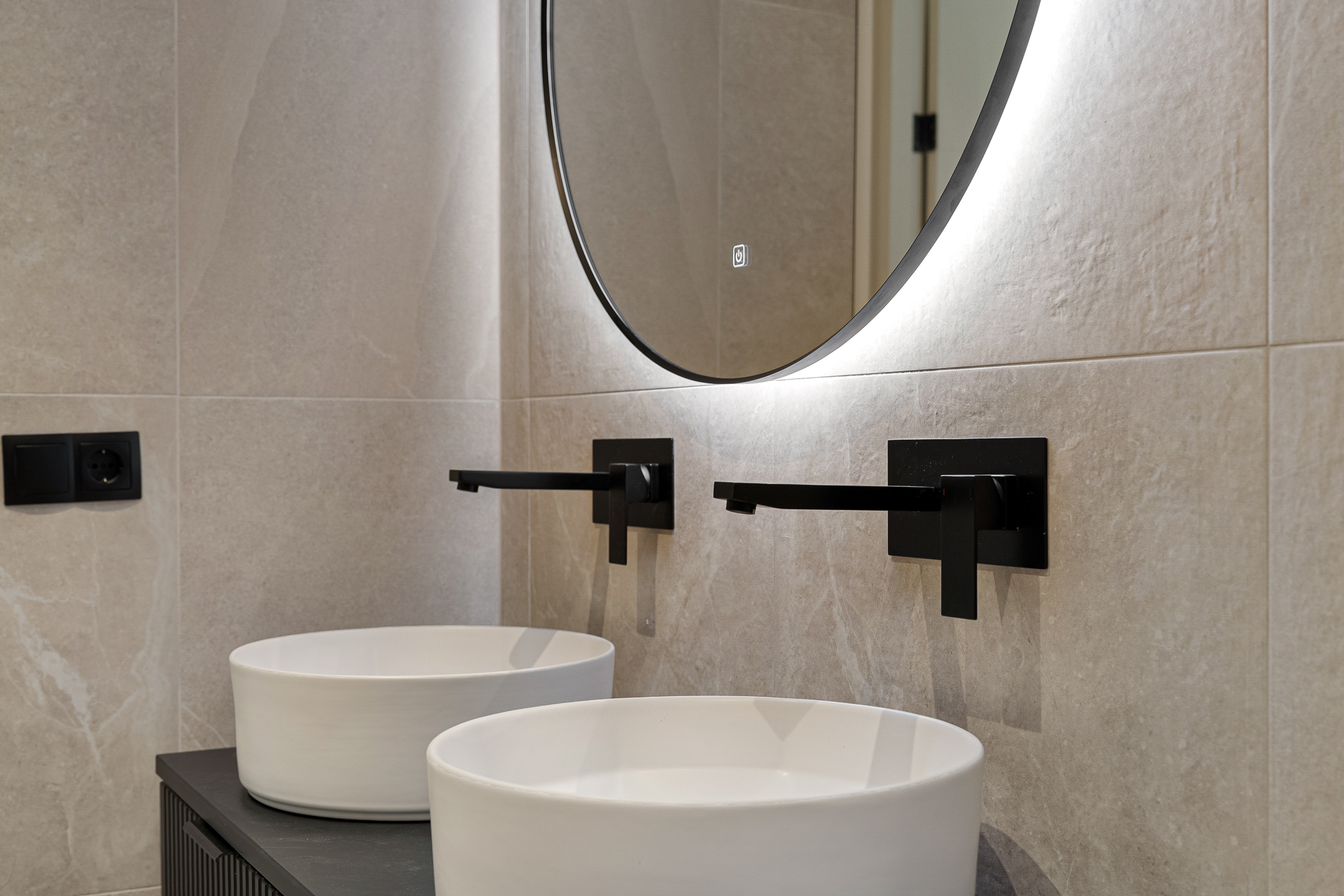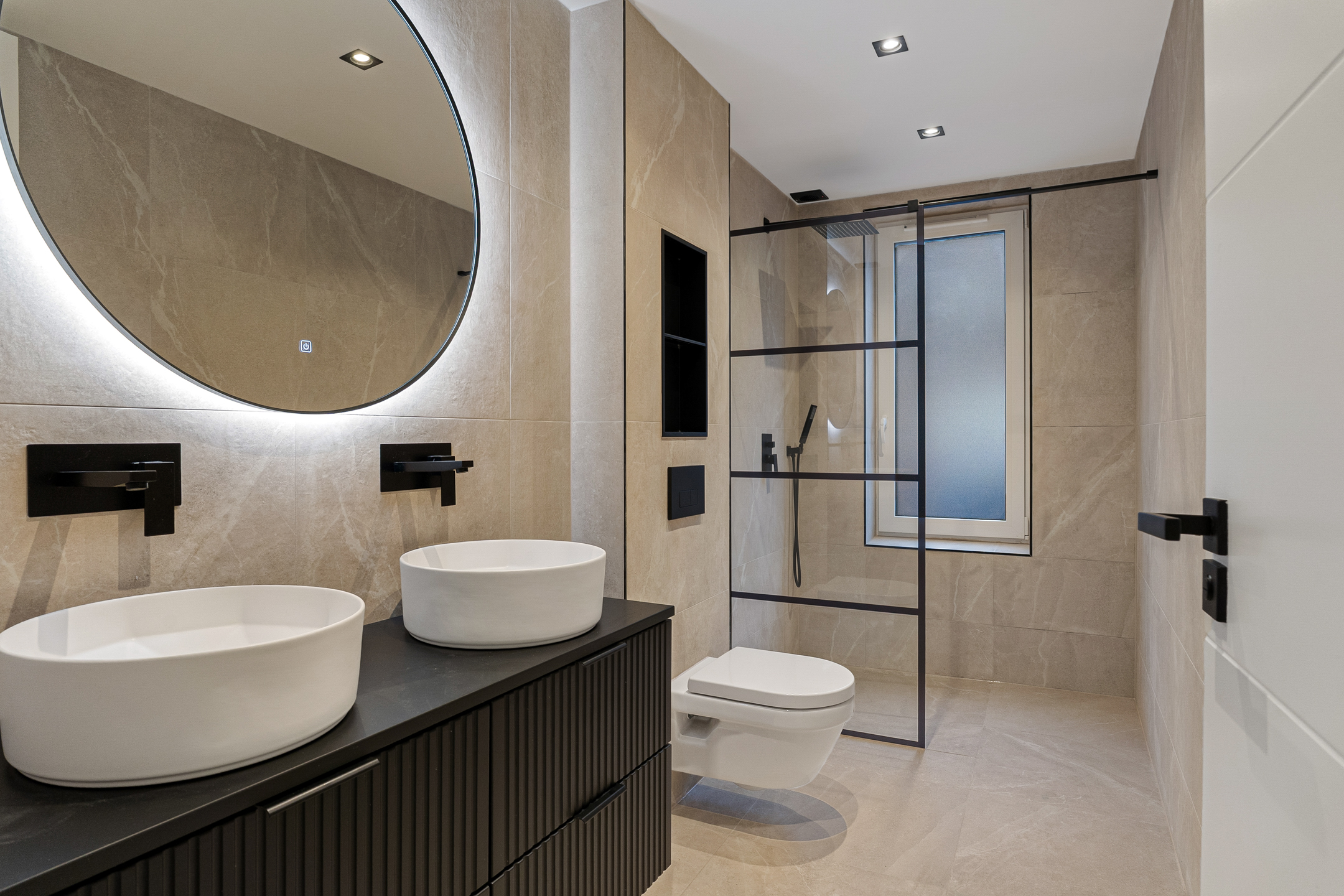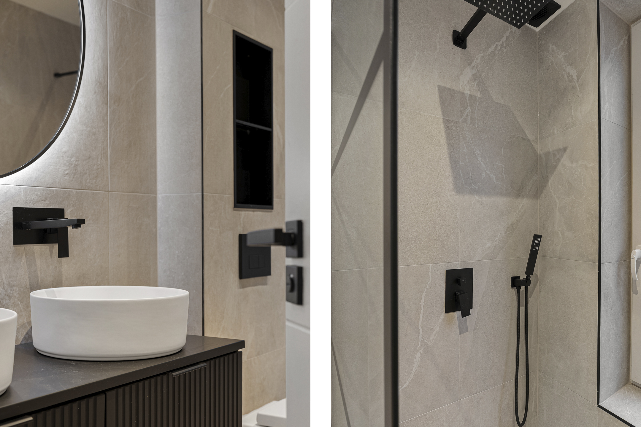 De volledig vernieuwde badkamer is modern uitgevoerd en voorzien van een inloopdouche, toilet en een ruim wastafelmeubel met dubbele kraan.