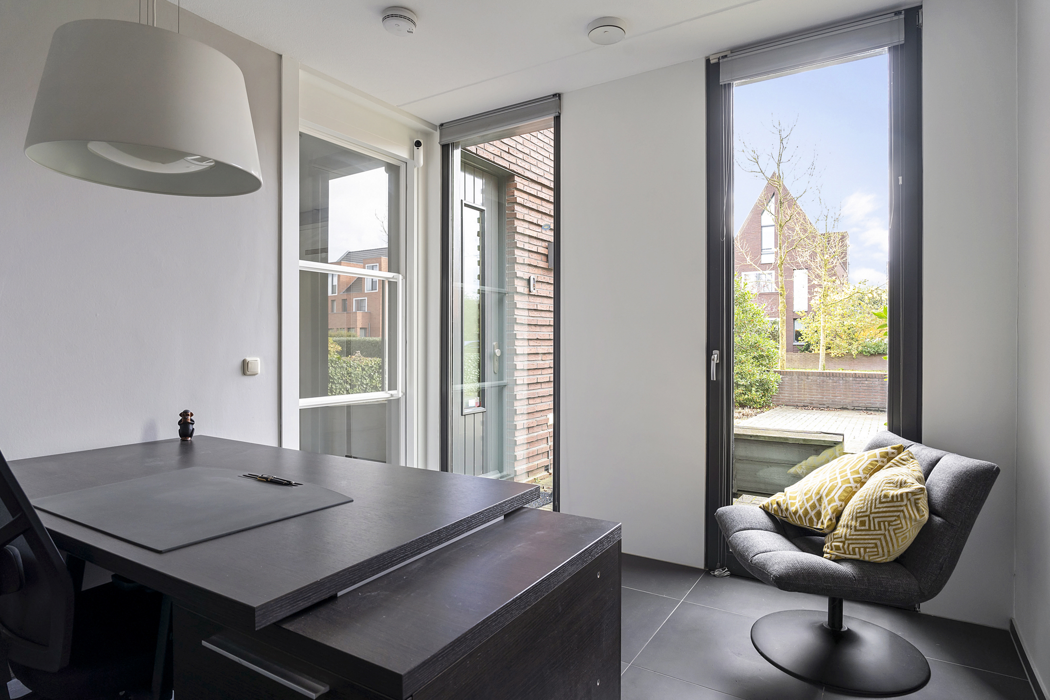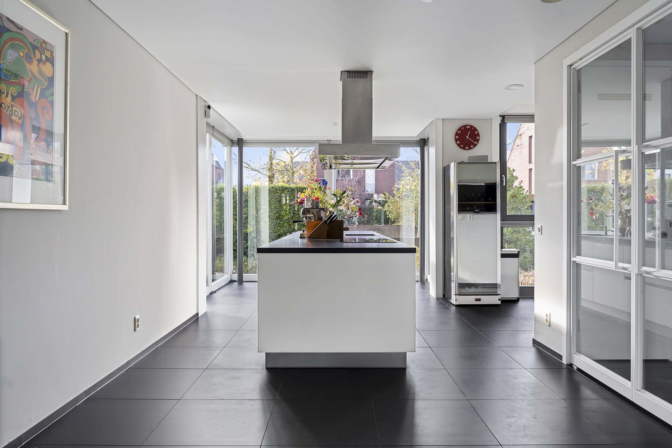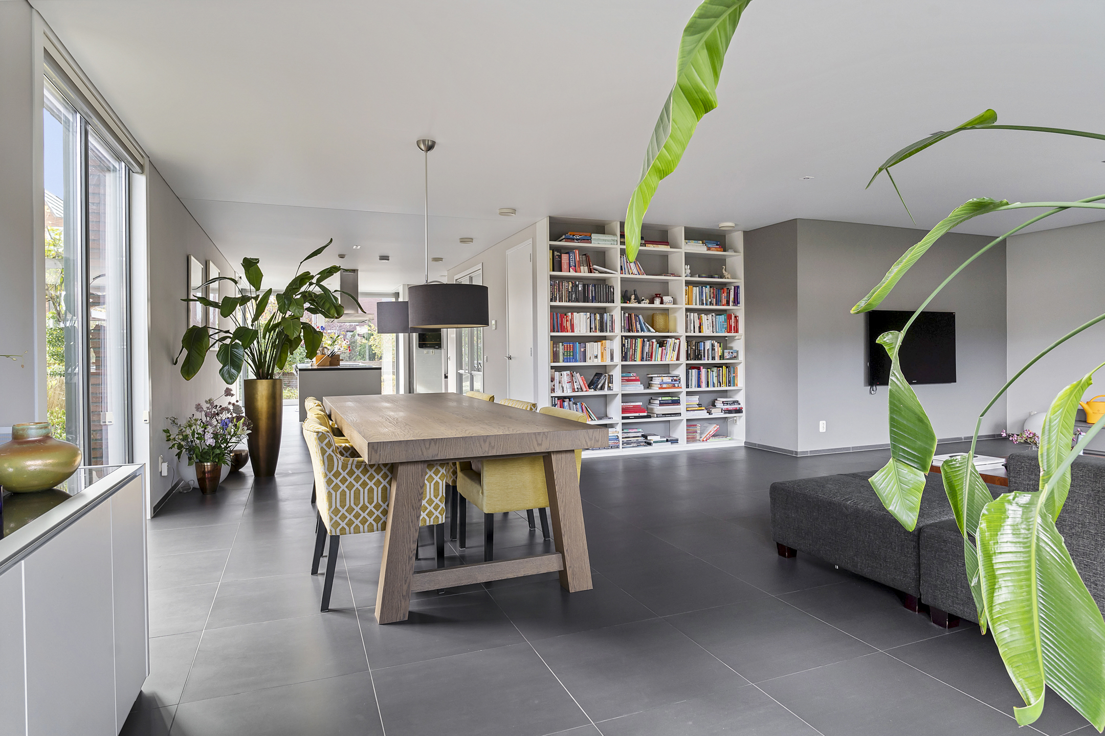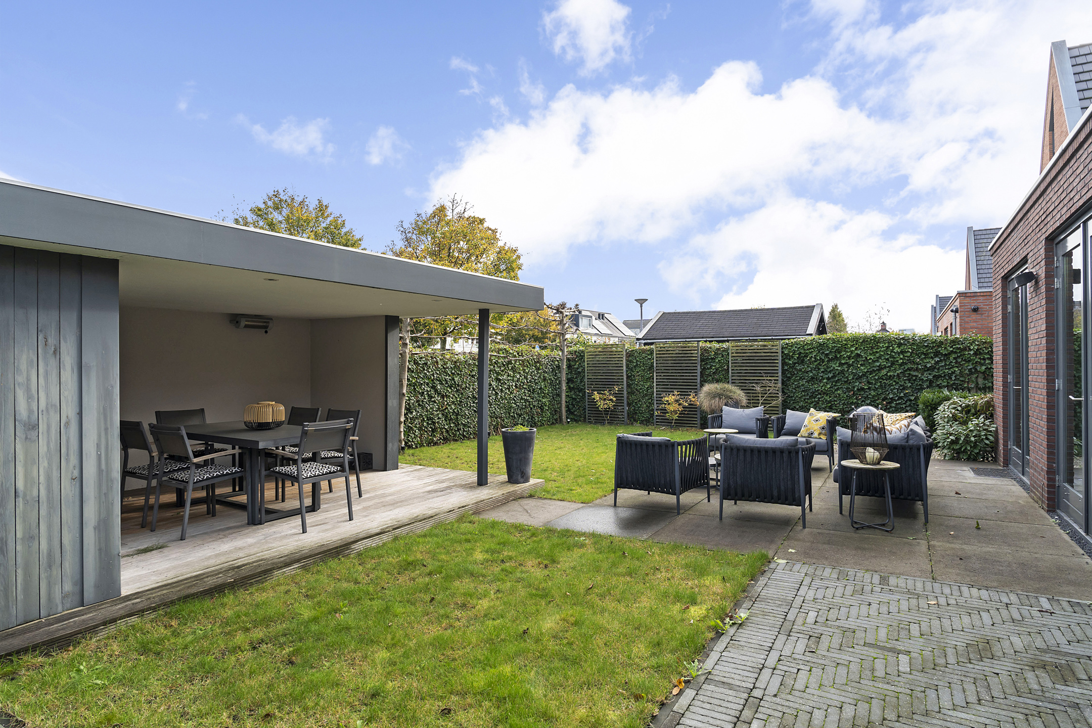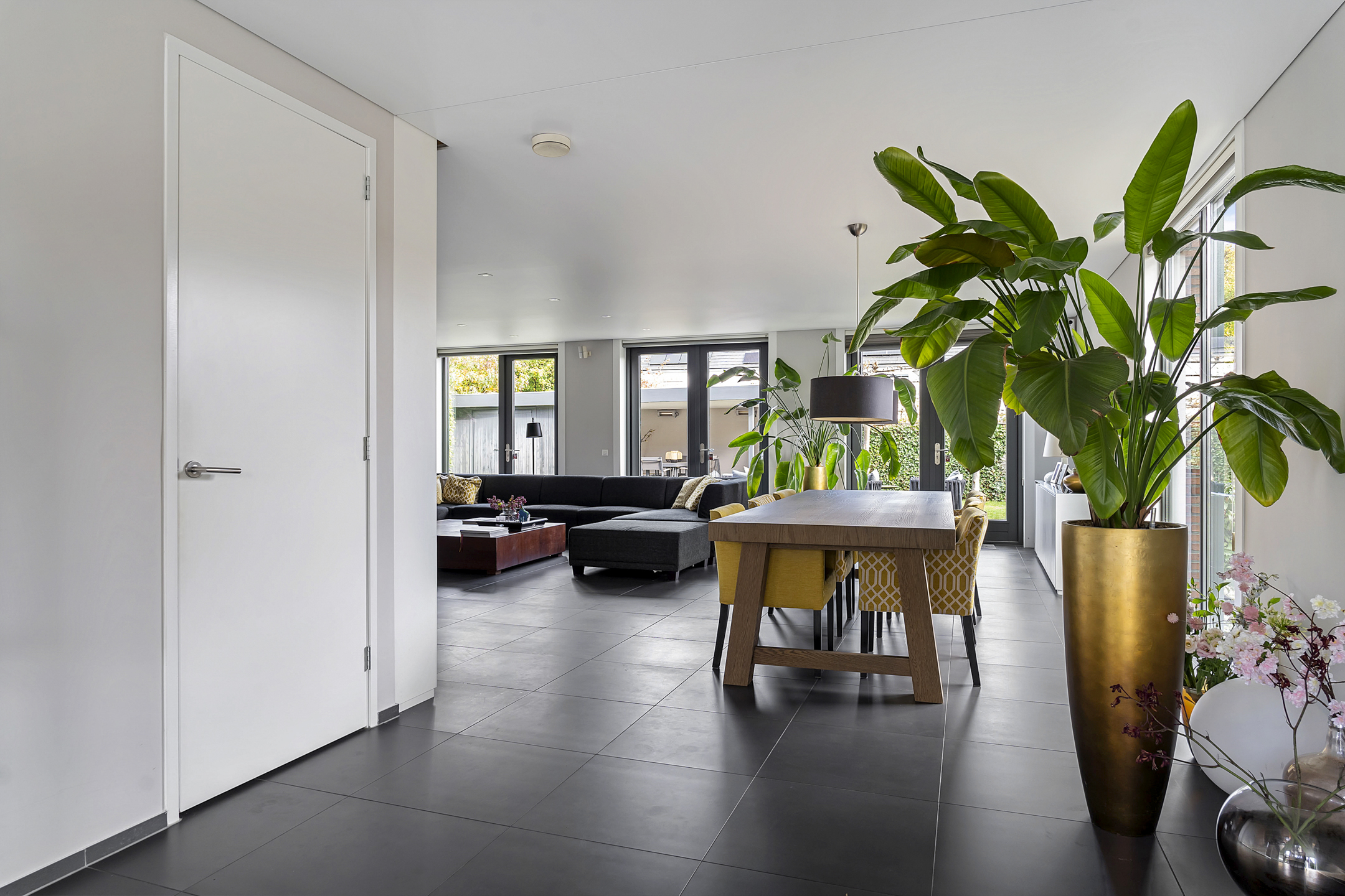 De voortuin biedt een ruime oprit met parkeerruimte voor minimaal 2 auto’s en toegang tot de woning. Bij binnenkomst betreed je een ruime hal die toegang biedt tot een meterkast, moderne toiletruimte met wandcloset en fonteintje, en een lichte werkkamer, perfect voor thuiswerken of als praktijkruimte. De ruime woonkamer van ca. 90 m² is voorzien van vloerverwarming en vloertegels, en door de grote raampartijen en openslaande deuren is er veel lichtinval. De open keuken aan de voorzijde is luxe ingericht met grote ramen en biedt een prachtig uitzicht op de lommerrijke laan. In de woonkamer is een royale ruimte voor een grote lange eettafel en een XL zithoek bij de sfeervolle gashaard. Vanuit de woonkamer geven drie openslaande deuren toegang tot de zonnige, fraai aangelegde tuin met een gezellig tuinhuis en een praktische overkapping aan de zijkant, ideaal voor fietsen of een buitenkeuken.
