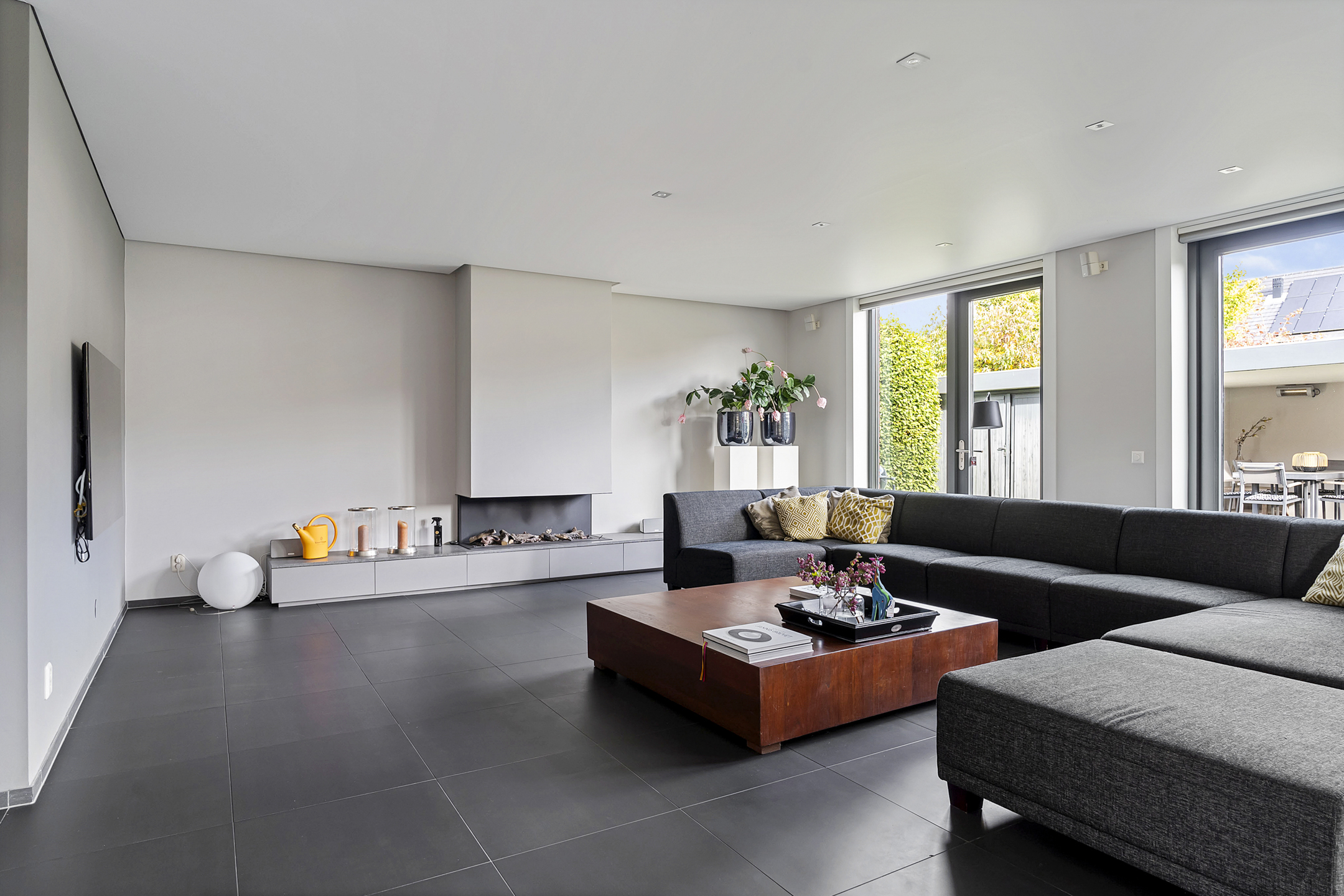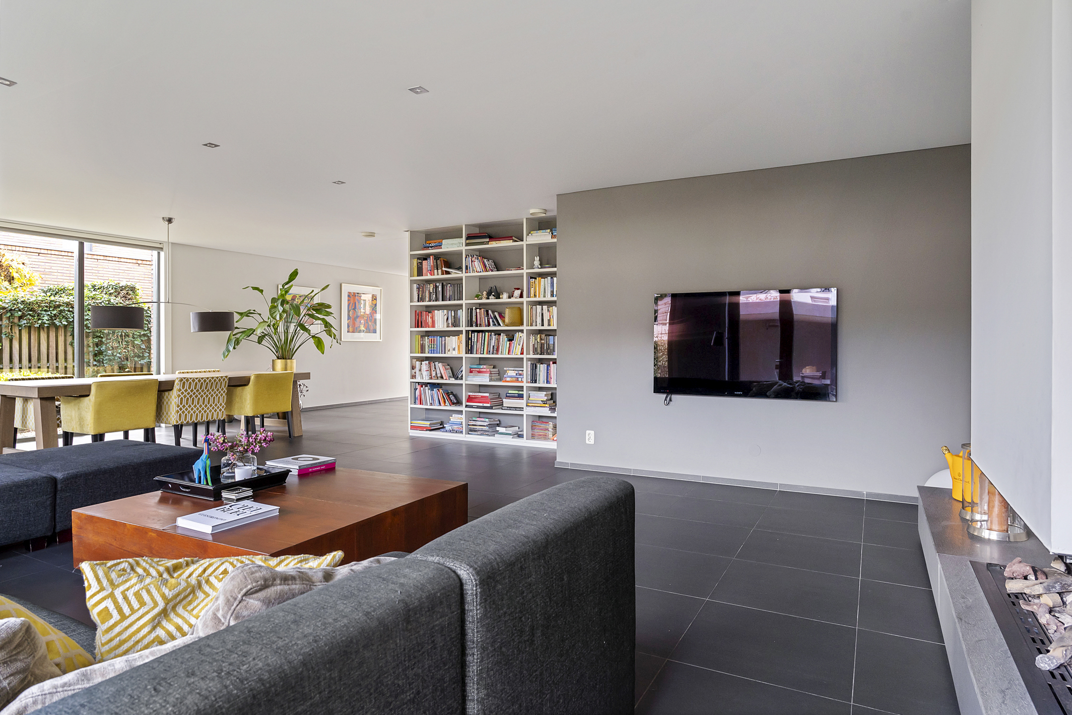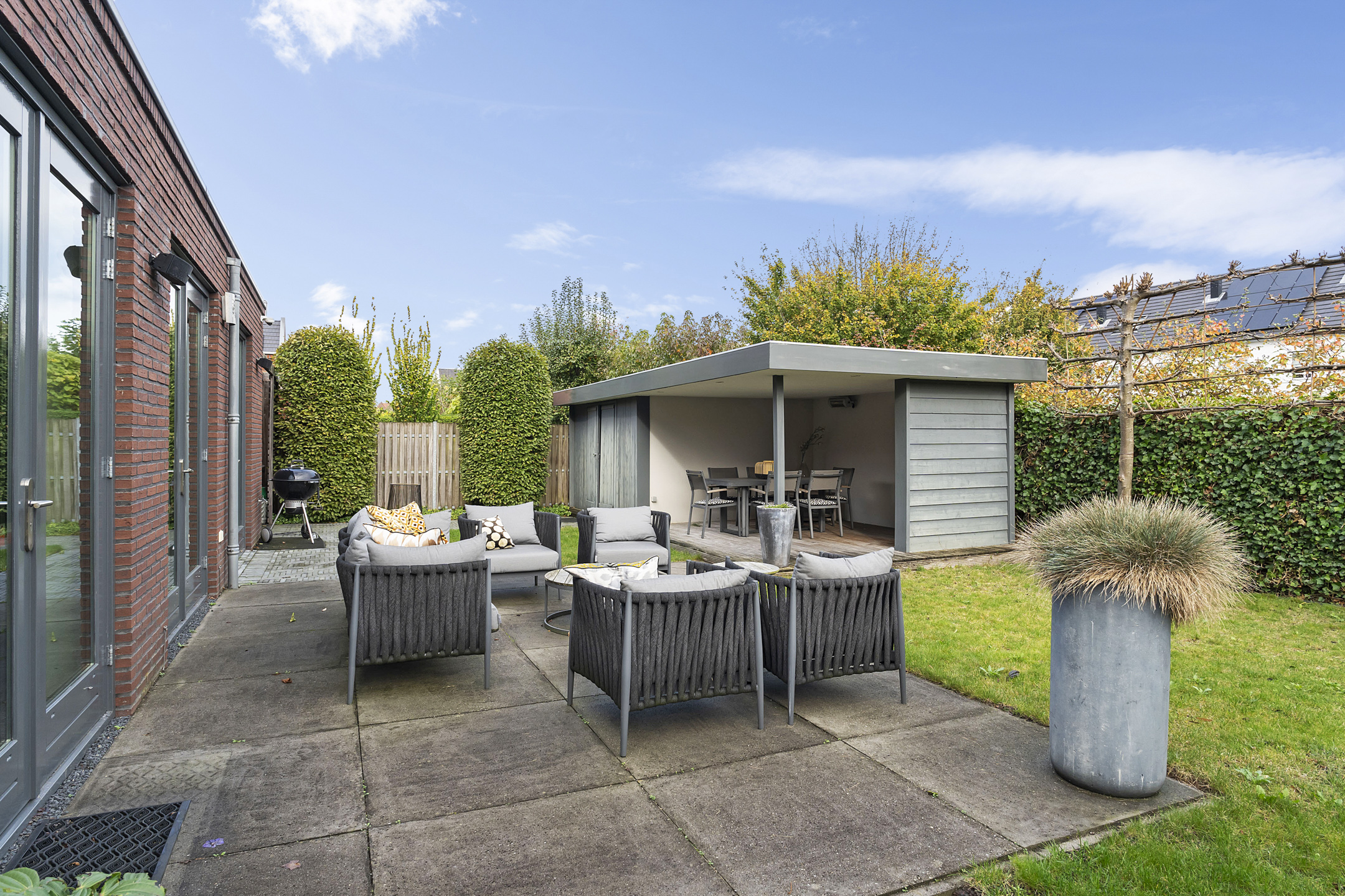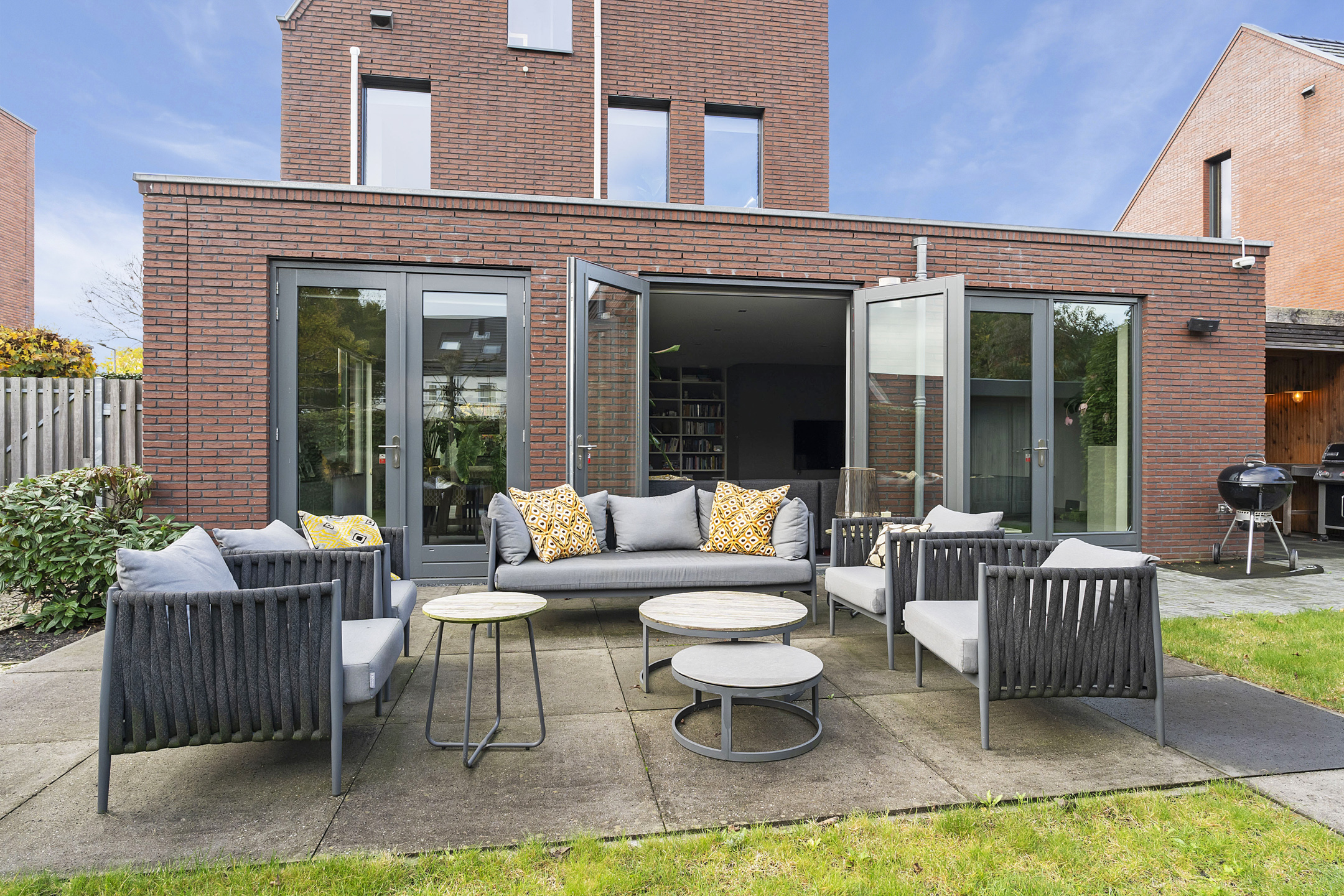De voortuin biedt een ruime oprit met parkeerruimte voor minimaal 2 auto’s en toegang tot de woning. Bij binnenkomst betreed je een ruime hal die toegang biedt tot een meterkast, moderne toiletruimte met wandcloset en fonteintje, en een lichte werkkamer, perfect voor thuiswerken of als praktijkruimte. De ruime woonkamer van ca. 90 m² is voorzien van vloerverwarming en vloertegels, en door de grote raampartijen en openslaande deuren is er veel lichtinval. De open keuken aan de voorzijde is luxe ingericht met grote ramen en biedt een prachtig uitzicht op de lommerrijke laan. In de woonkamer is een royale ruimte voor een grote lange eettafel en een XL zithoek bij de sfeervolle gashaard. Vanuit de woonkamer geven drie openslaande deuren toegang tot de zonnige, fraai aangelegde tuin met een gezellig tuinhuis en een praktische overkapping aan de zijkant, ideaal voor fietsen of een buitenkeuken.