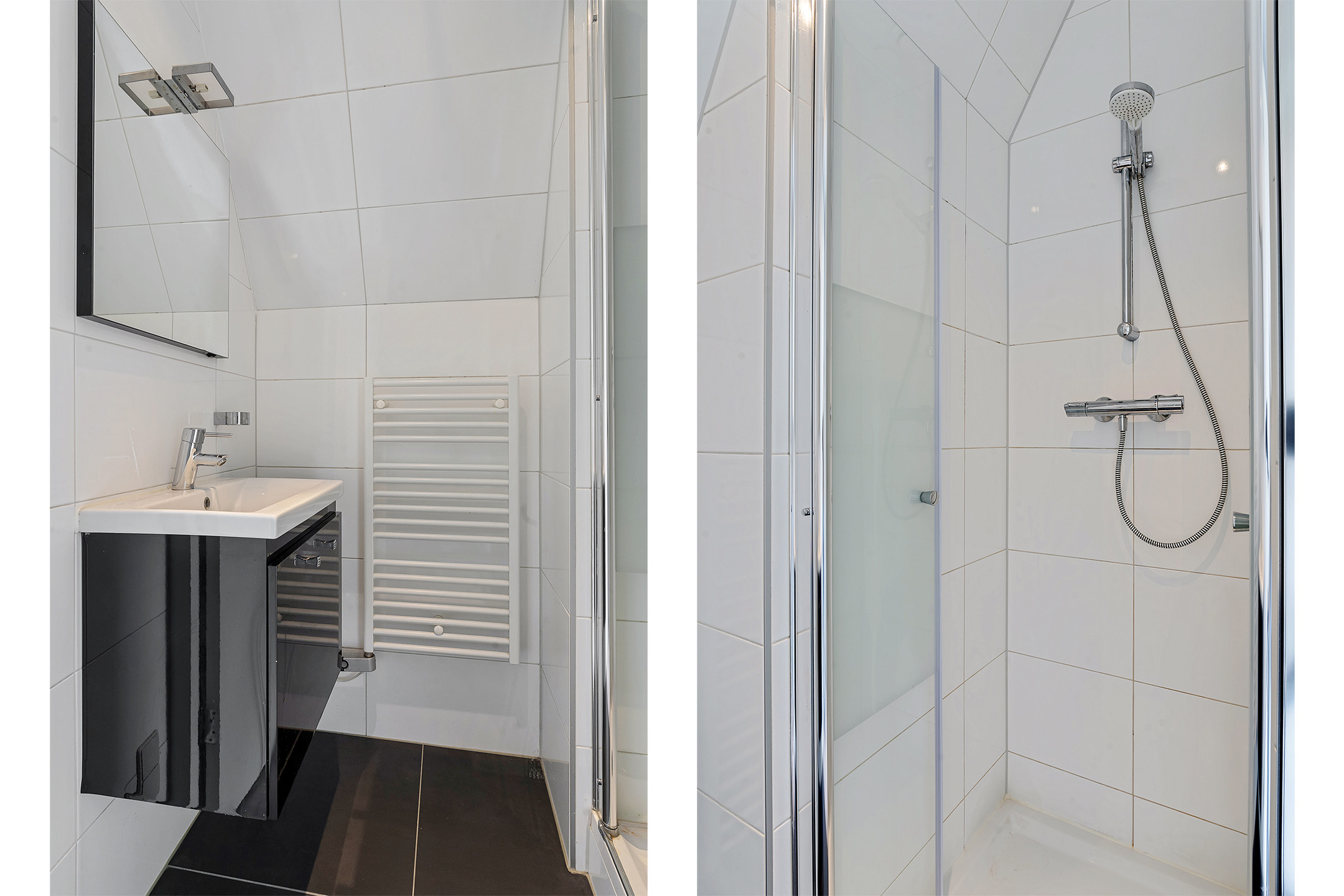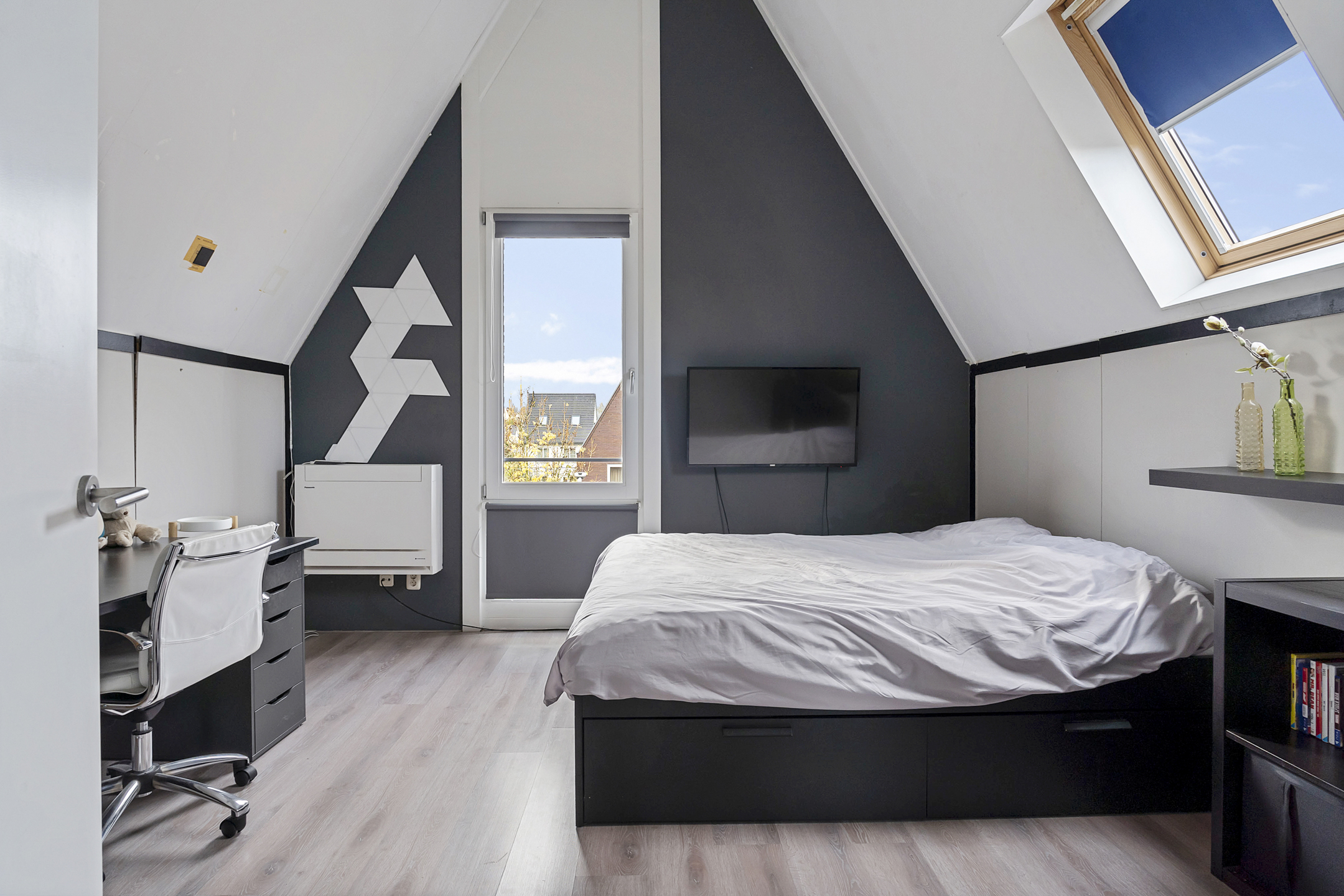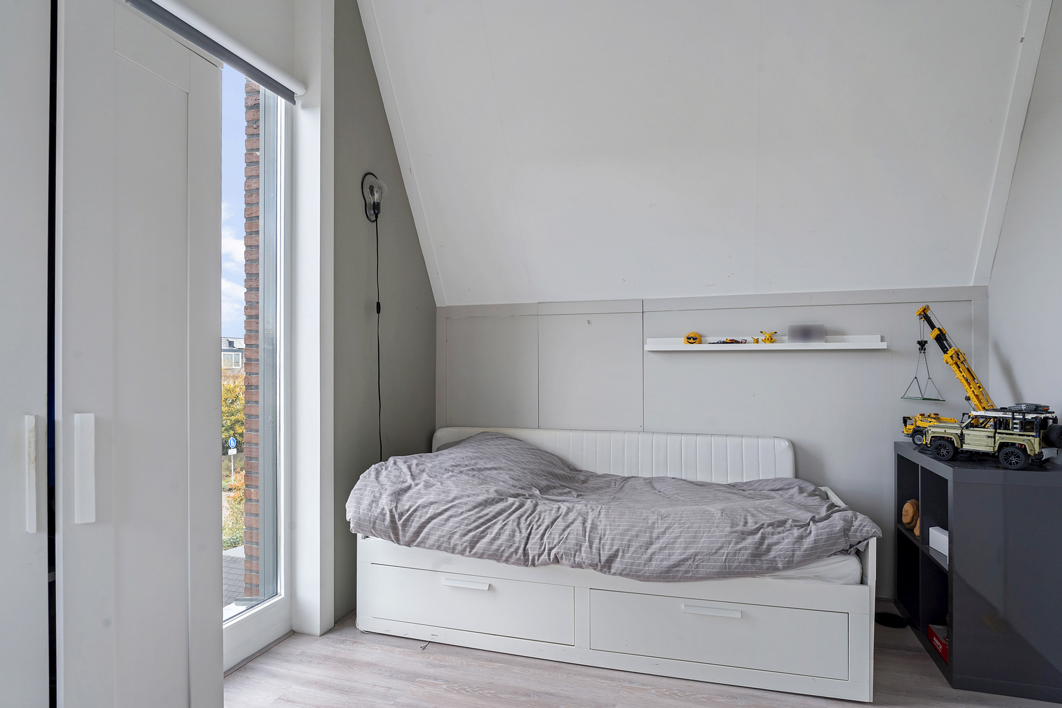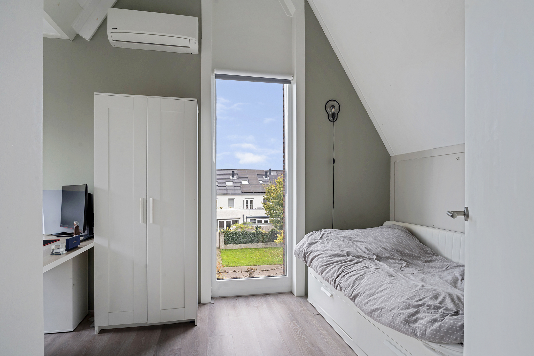 Op de zolderverdieping bevinden zich nog twee ruime slaapkamers, een tweede badkamer en een afgesloten was-/stookruimte met een hybride warmtepomp, WTW-installatie en een wasmachineaansluiting. De volledig betegelde badkamer beschikt over een wastafelmeubel en inloopdouche. Onder de schuine dakdelen zijn knieschotten geplaatst voor extra bergruimte.