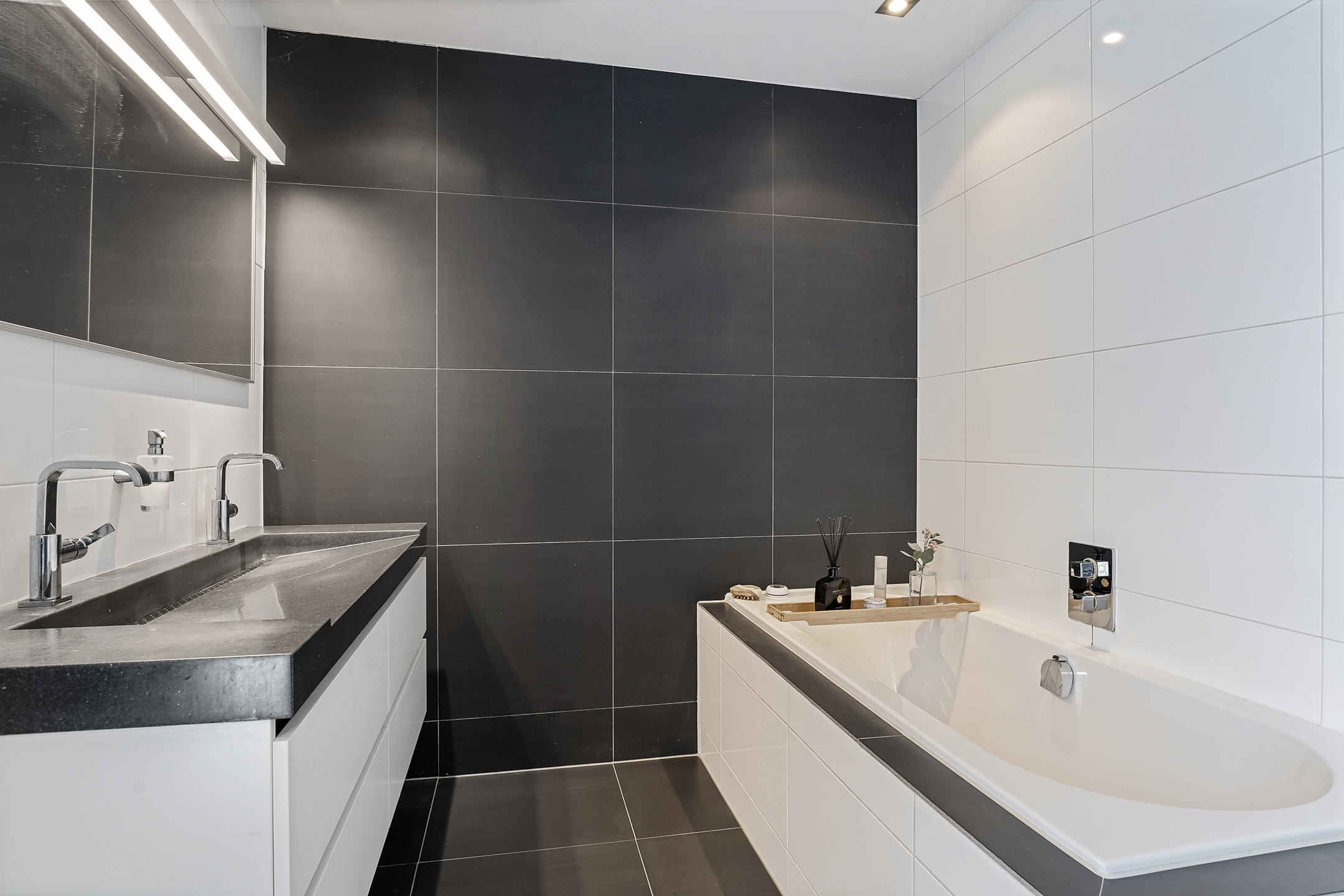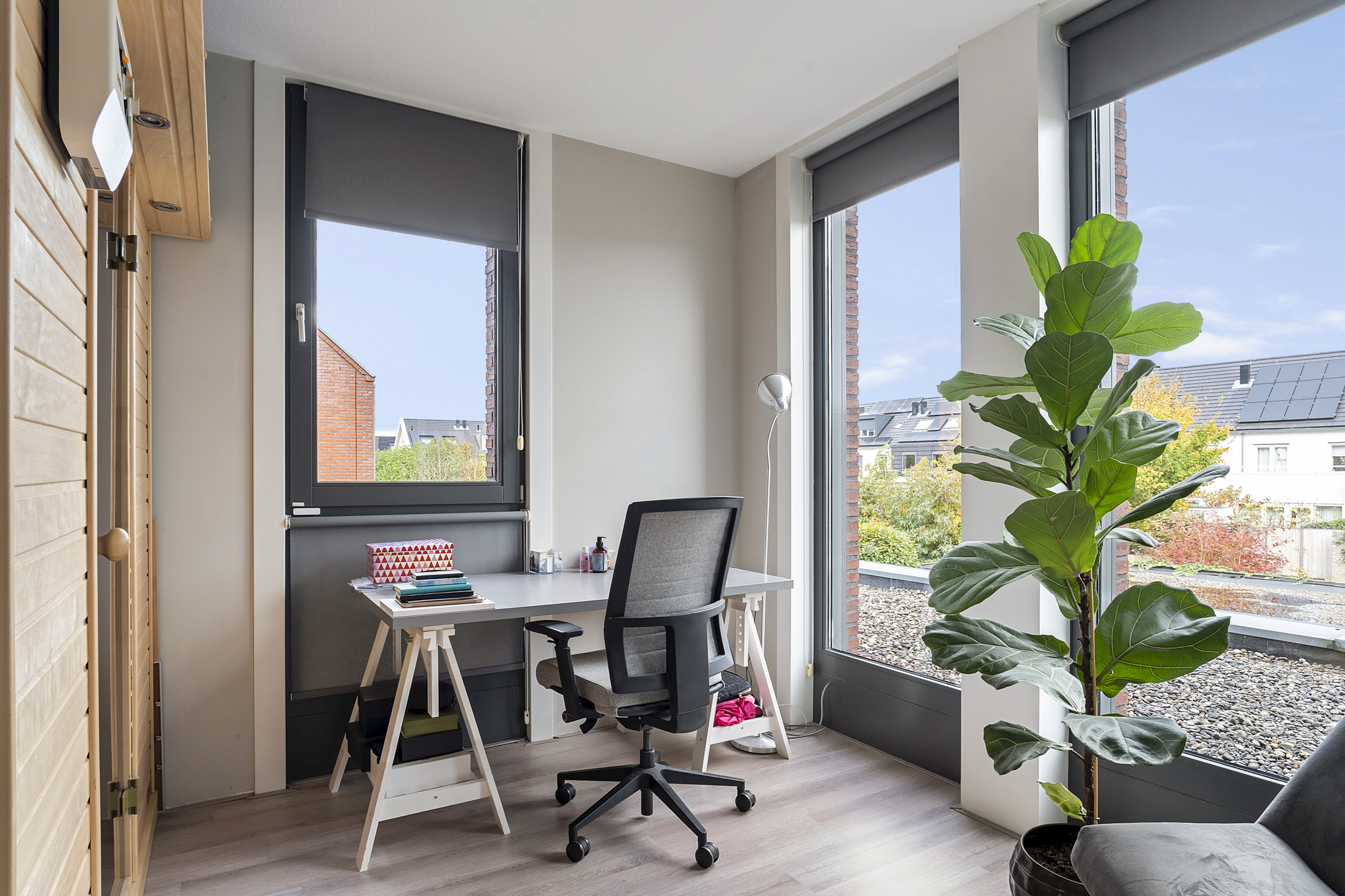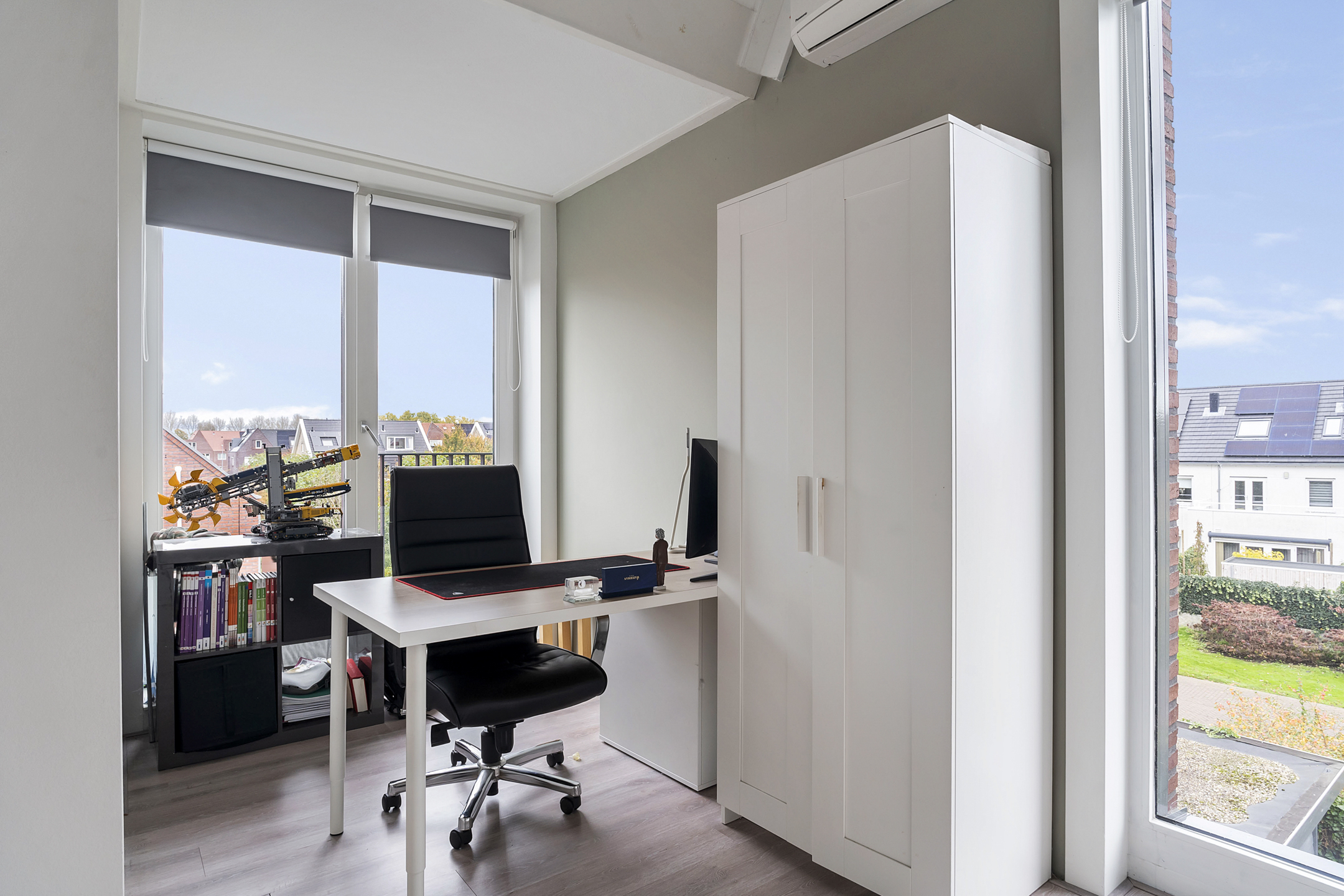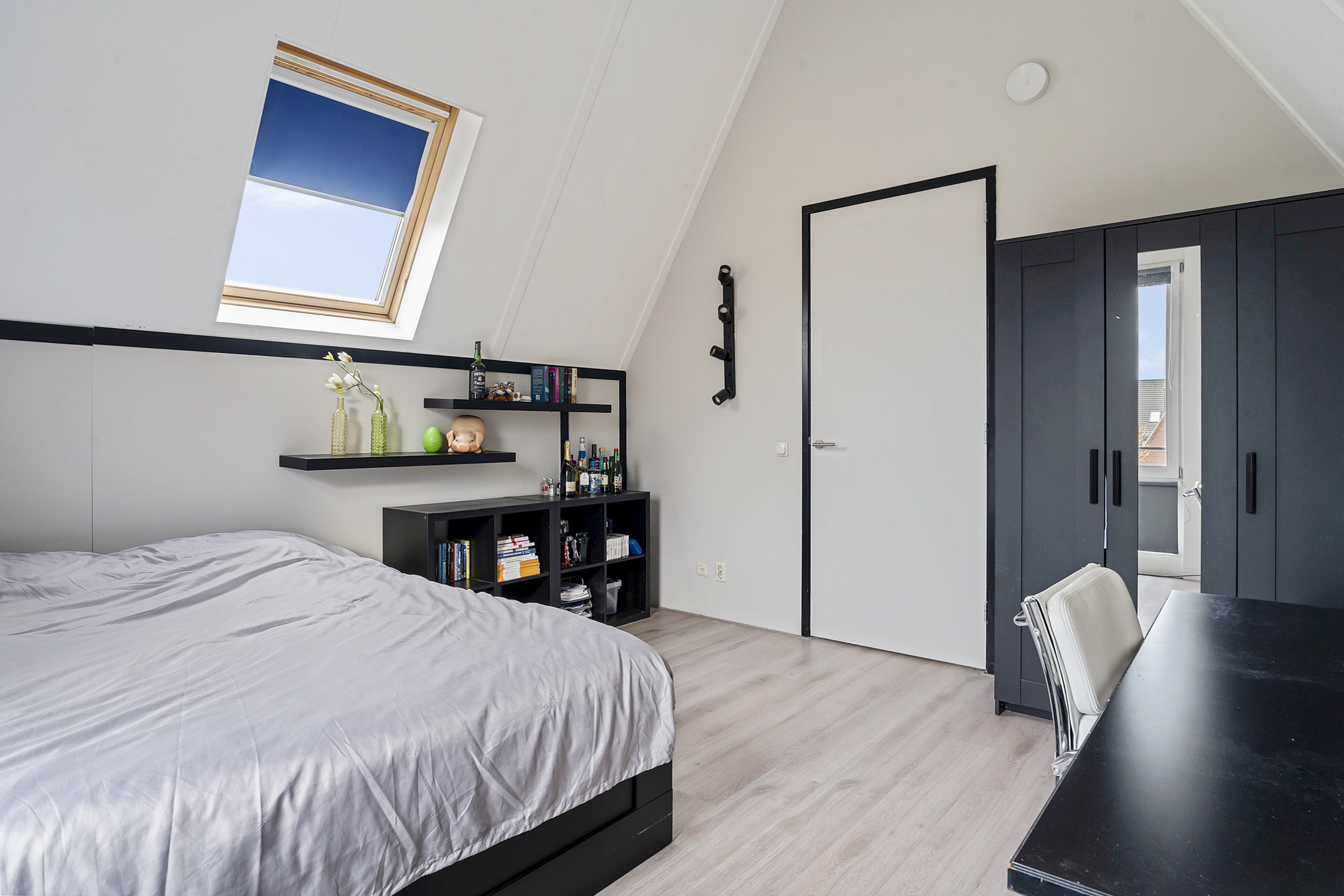 Op de zolderverdieping bevinden zich nog twee ruime slaapkamers, een tweede badkamer en een afgesloten was-/stookruimte met een hybride warmtepomp, WTW-installatie en een wasmachineaansluiting. De volledig betegelde badkamer beschikt over een wastafelmeubel en inloopdouche. Onder de schuine dakdelen zijn knieschotten geplaatst voor extra bergruimte.