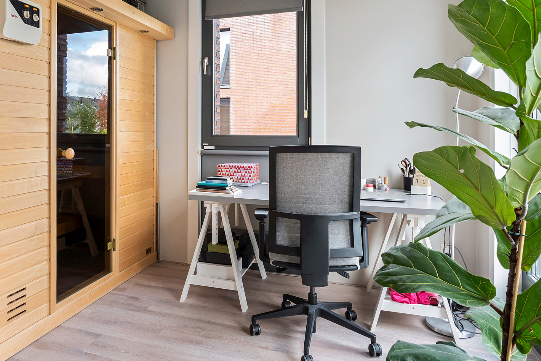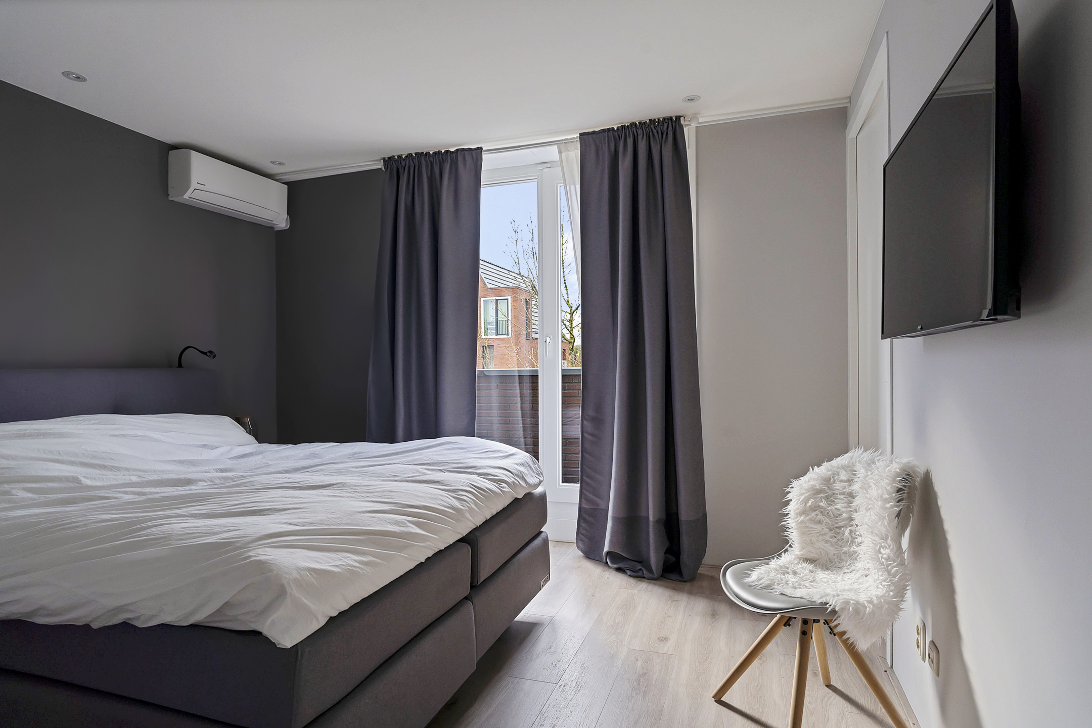 De eerste verdieping is ruim en voorzien van vloerverwarming en licht gestucte wanden. De overloop biedt toegang tot drie ruime slaapkamers en een moderne toiletruimte. De grootste slaapkamer bevindt zich aan de voorzijde en beschikt over een inloopgarderobe, airconditioning en een balkon. De luxe badkamer is modern, volledig betegeld en heeft een ligbad, wastafel, designradiator en een inloopdouche, beide uitgerust met thermostaatkranen en handdouches. Aan de achterzijde zijn twee slaapkamers samengevoegd tot een royale kamer, uitgerust met een sauna en extra garderoberuimte, voor een luxe wellness-ervaring in huis.