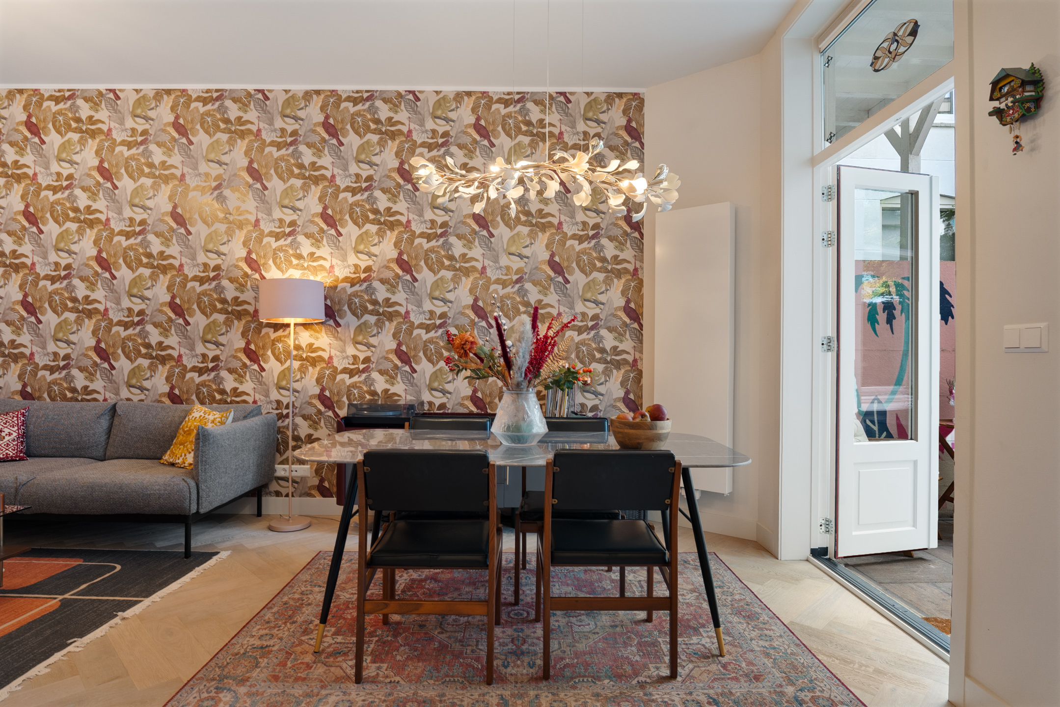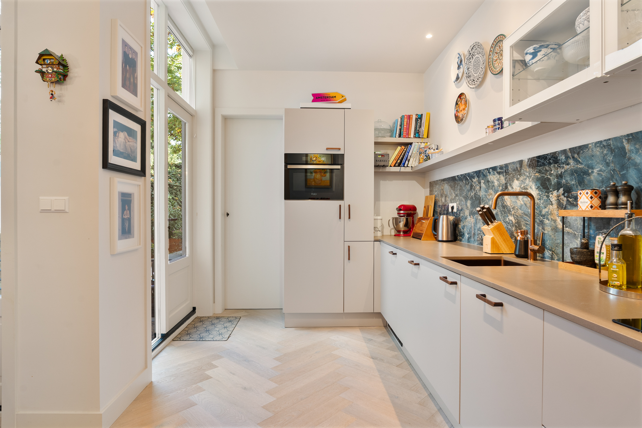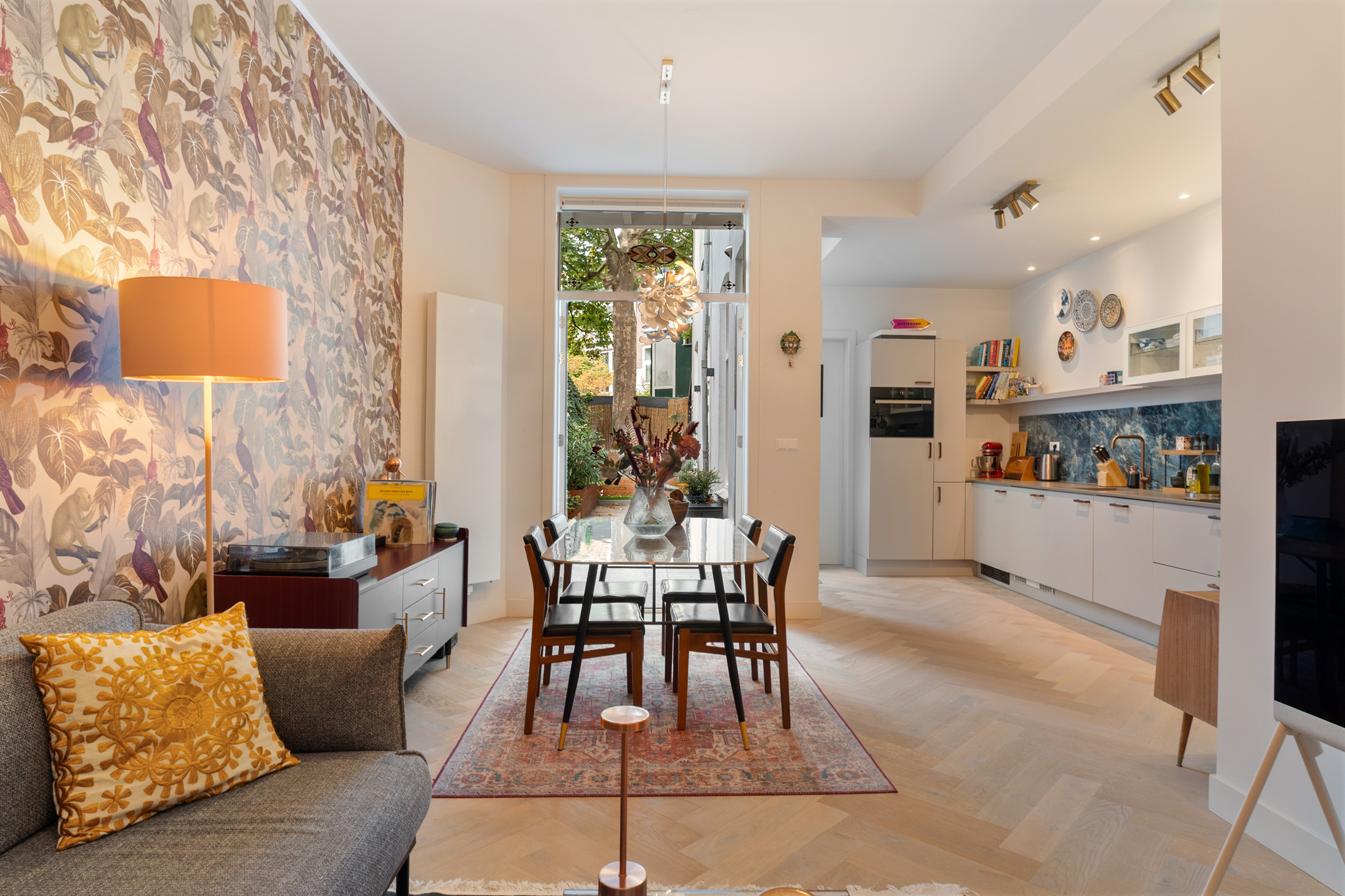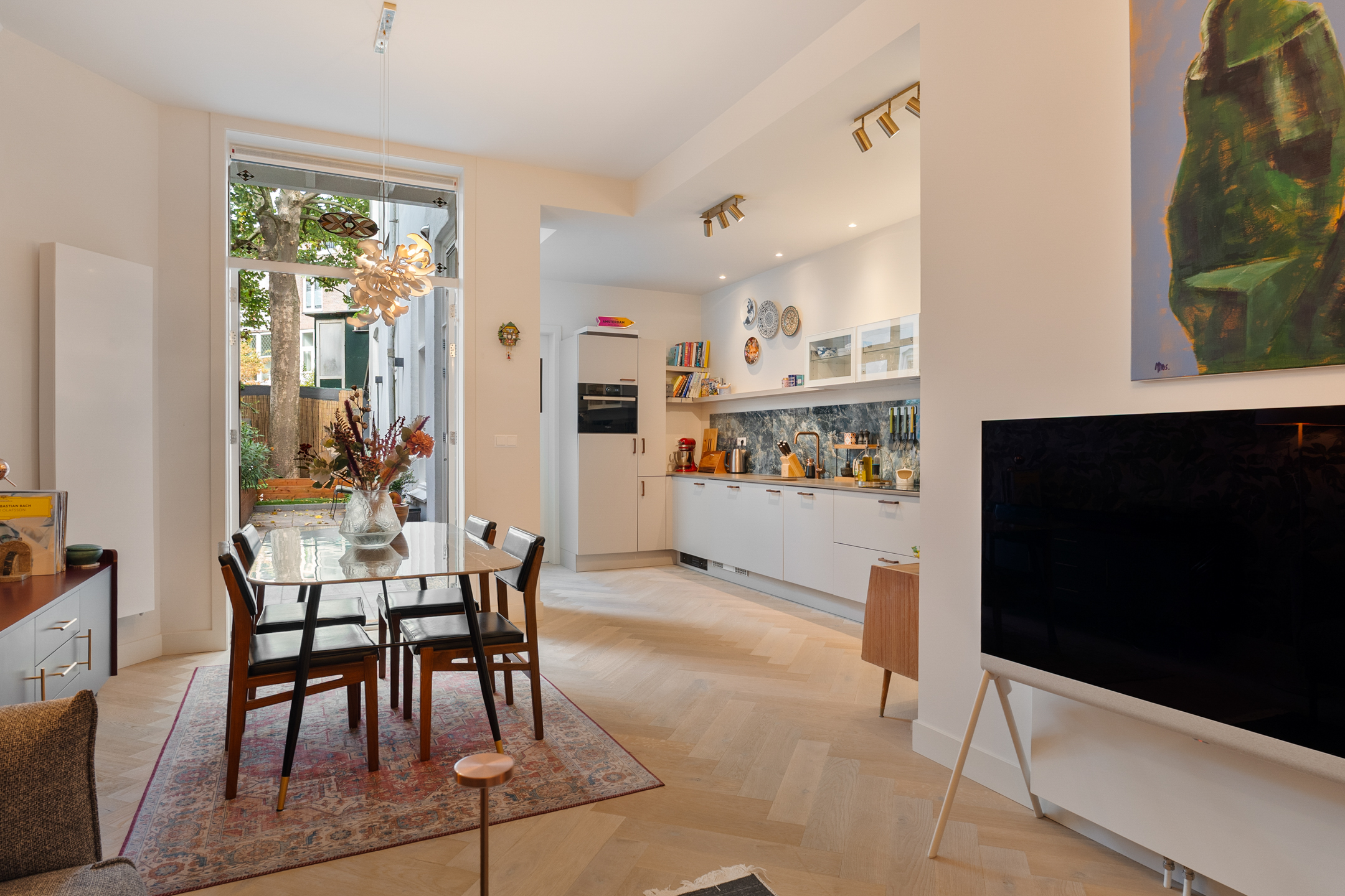 De tuingerichte woonkamer voelt licht, open en uitnodigend aan dankzij de openslaande deuren naar de achtertuin. De eiken visgraatvloer, luxe wandafwerking en kleurrijk behang geven de ruimte een warme, eigentijdse uitstraling. De moderne open keuken is uitgevoerd met een composiet werkblad, veel kastruimte en diverse inbouwapparatuur. De stijlvolle koperen kranen zorgen voor een harmonieus geheel.