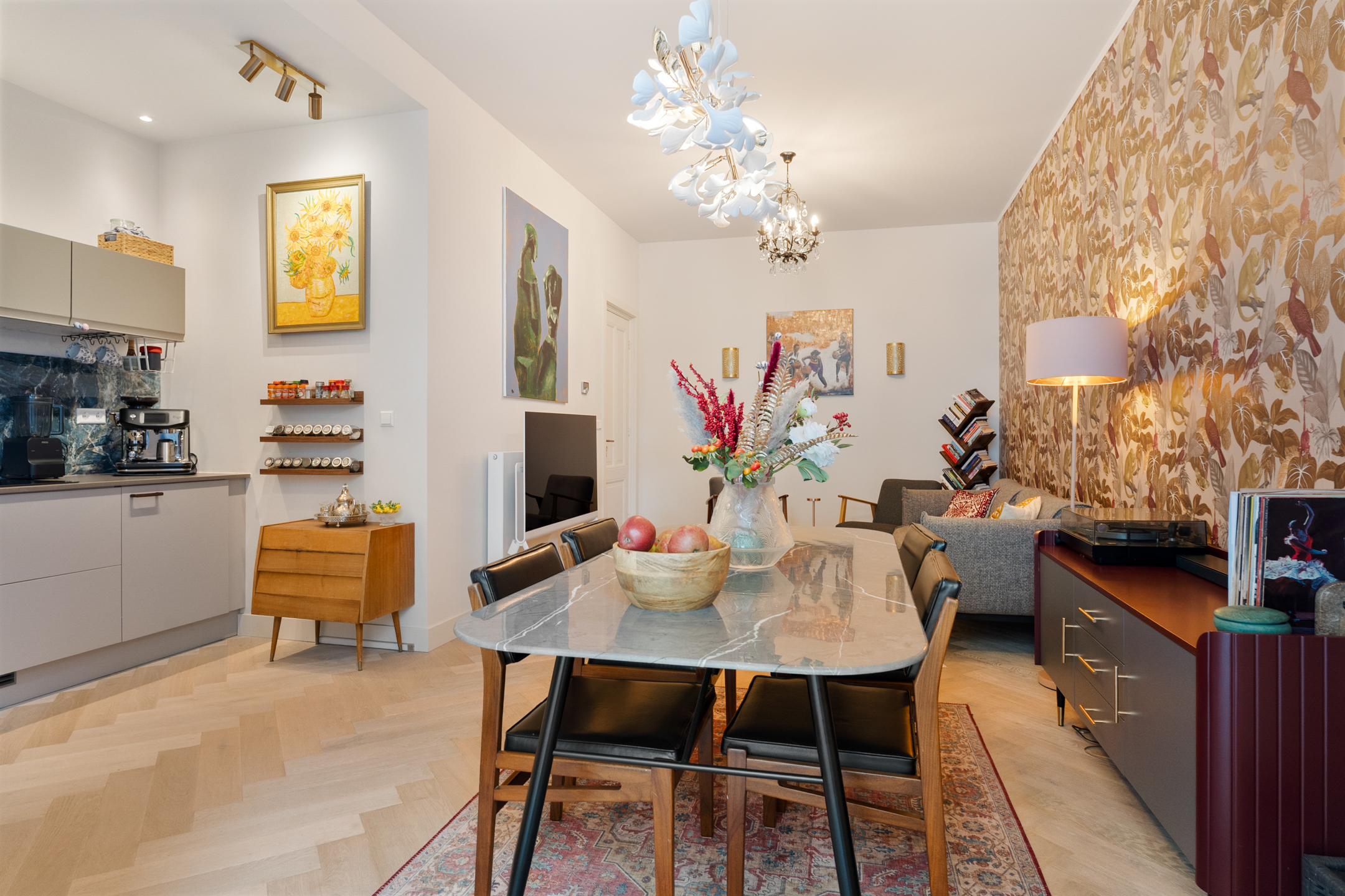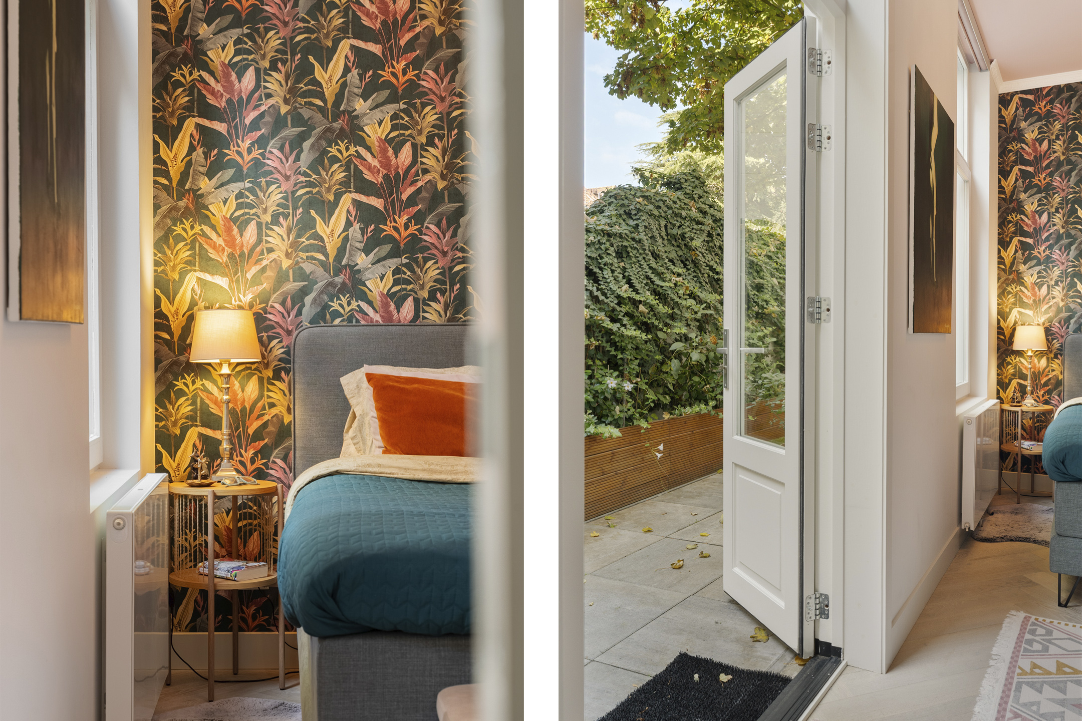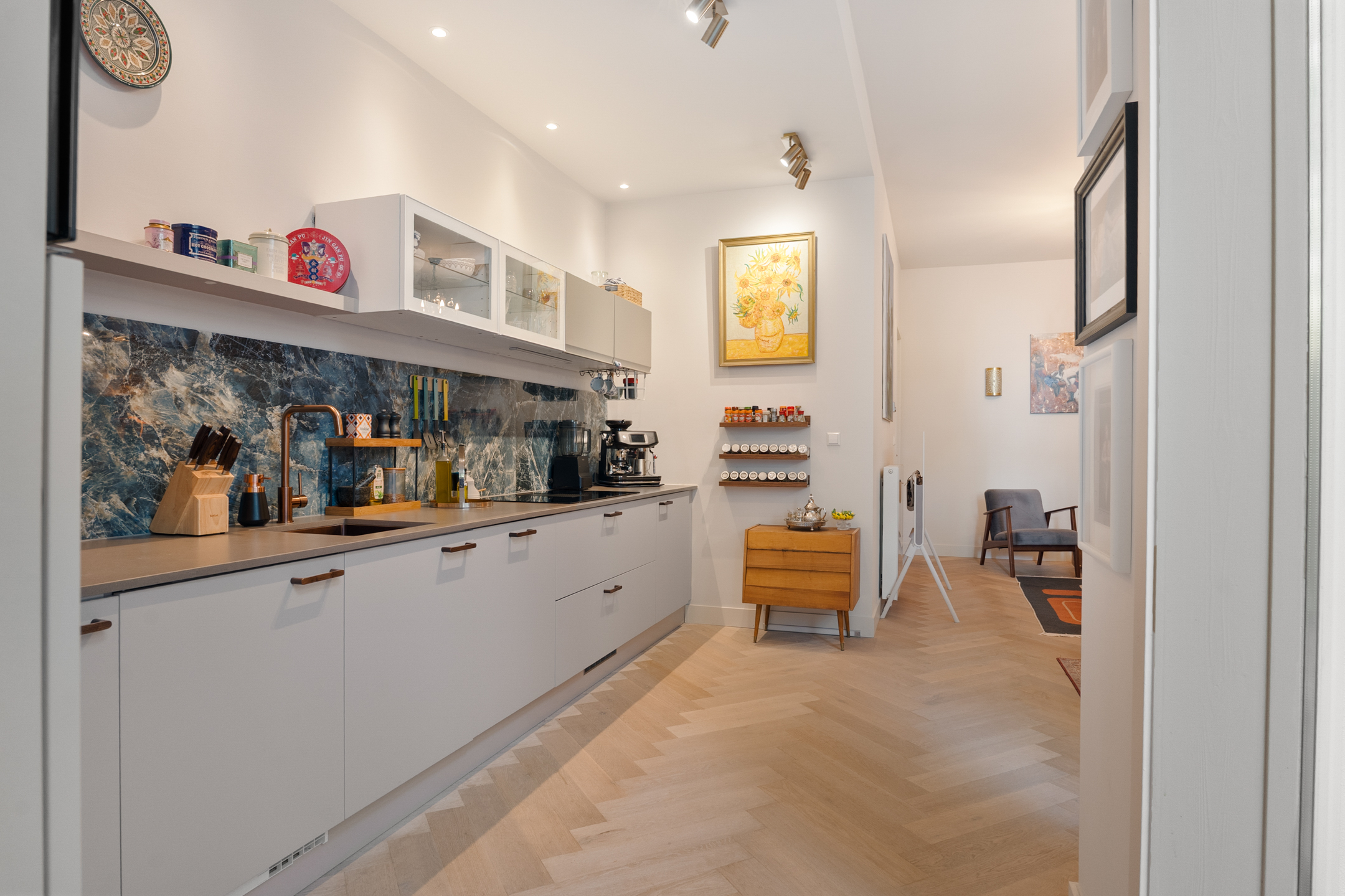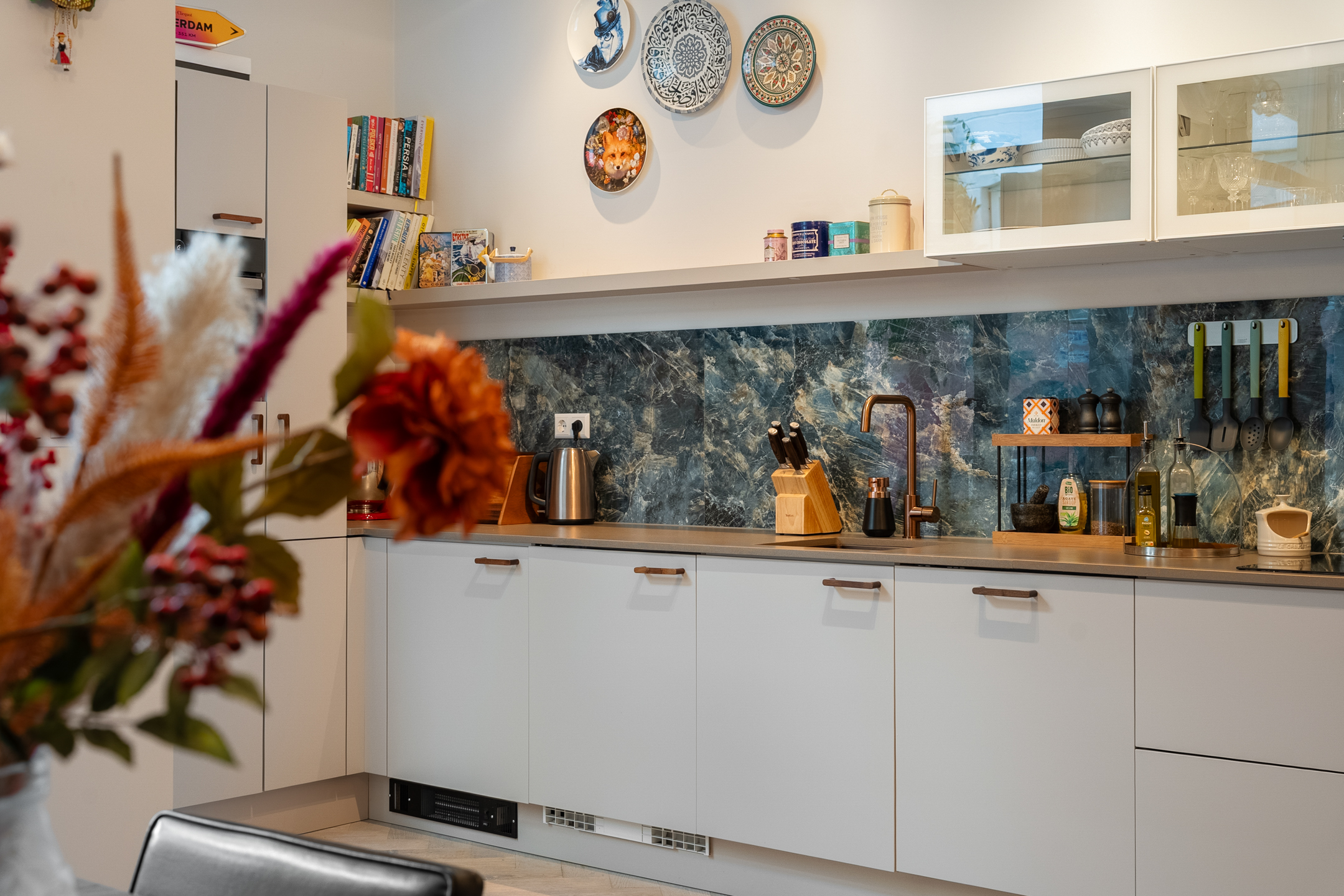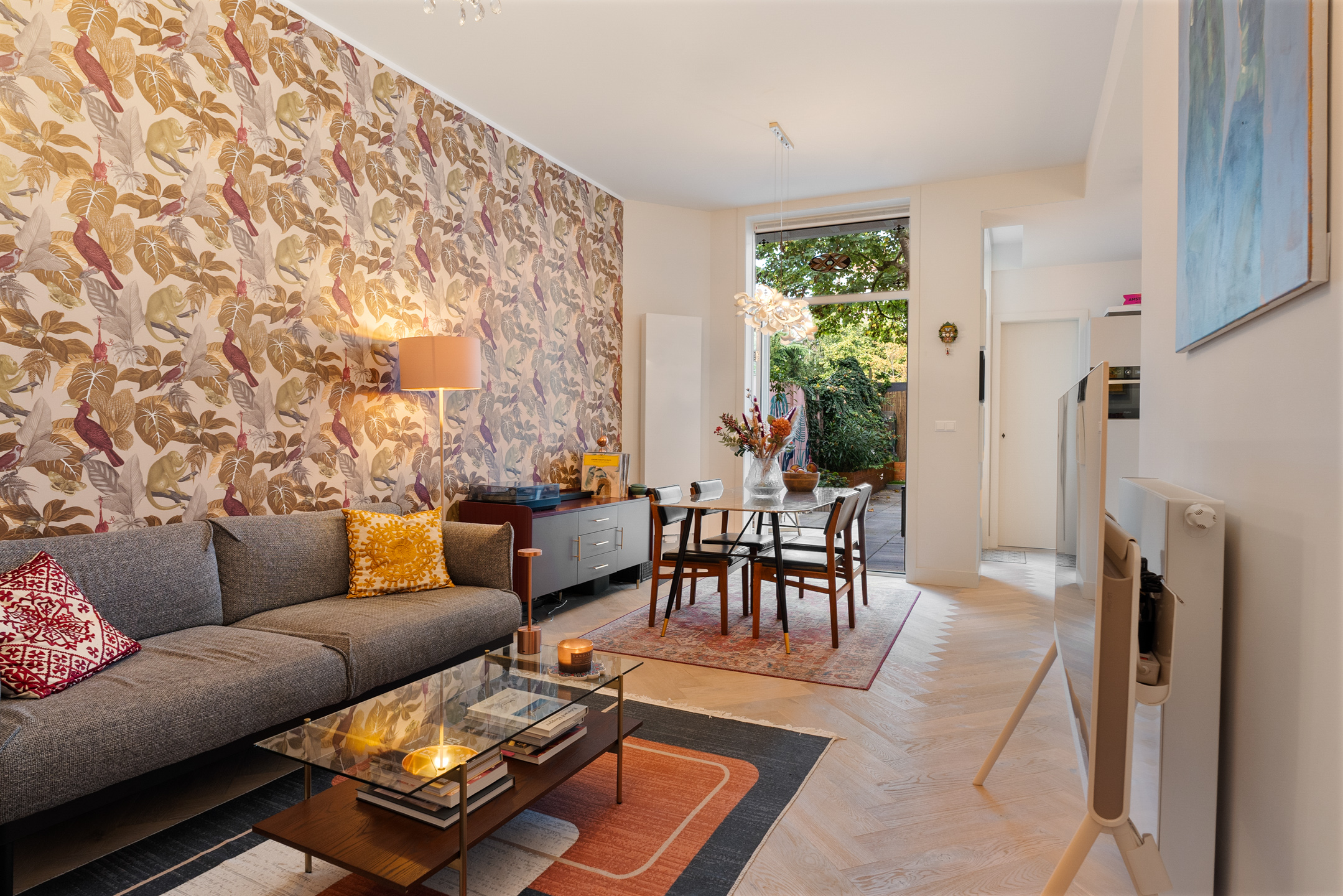 De tuingerichte woonkamer voelt licht, open en uitnodigend aan dankzij de openslaande deuren naar de achtertuin. De eiken visgraatvloer, luxe wandafwerking en kleurrijk behang geven de ruimte een warme, eigentijdse uitstraling. De moderne open keuken is uitgevoerd met een composiet werkblad, veel kastruimte en diverse inbouwapparatuur. De stijlvolle koperen kranen zorgen voor een harmonieus geheel.