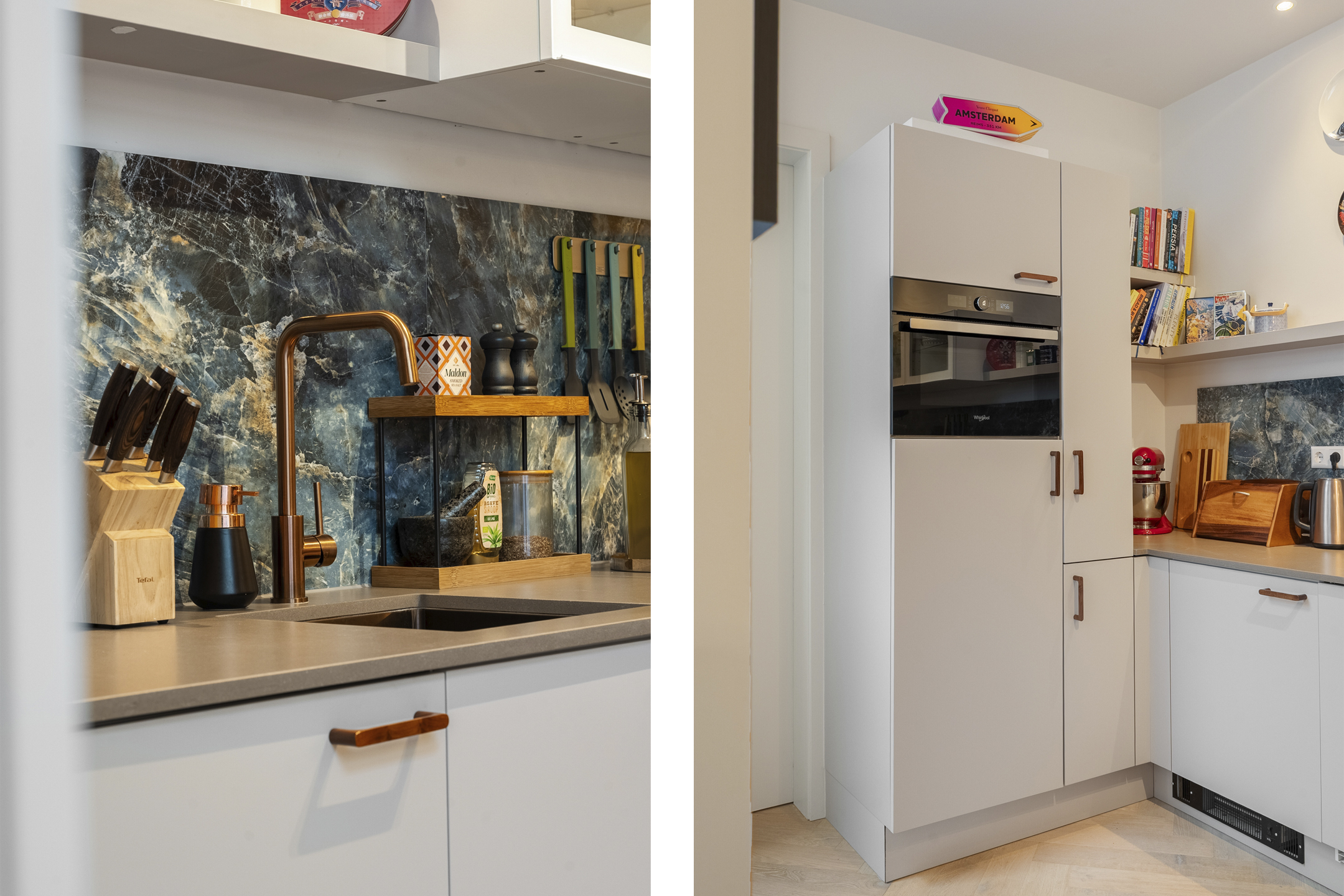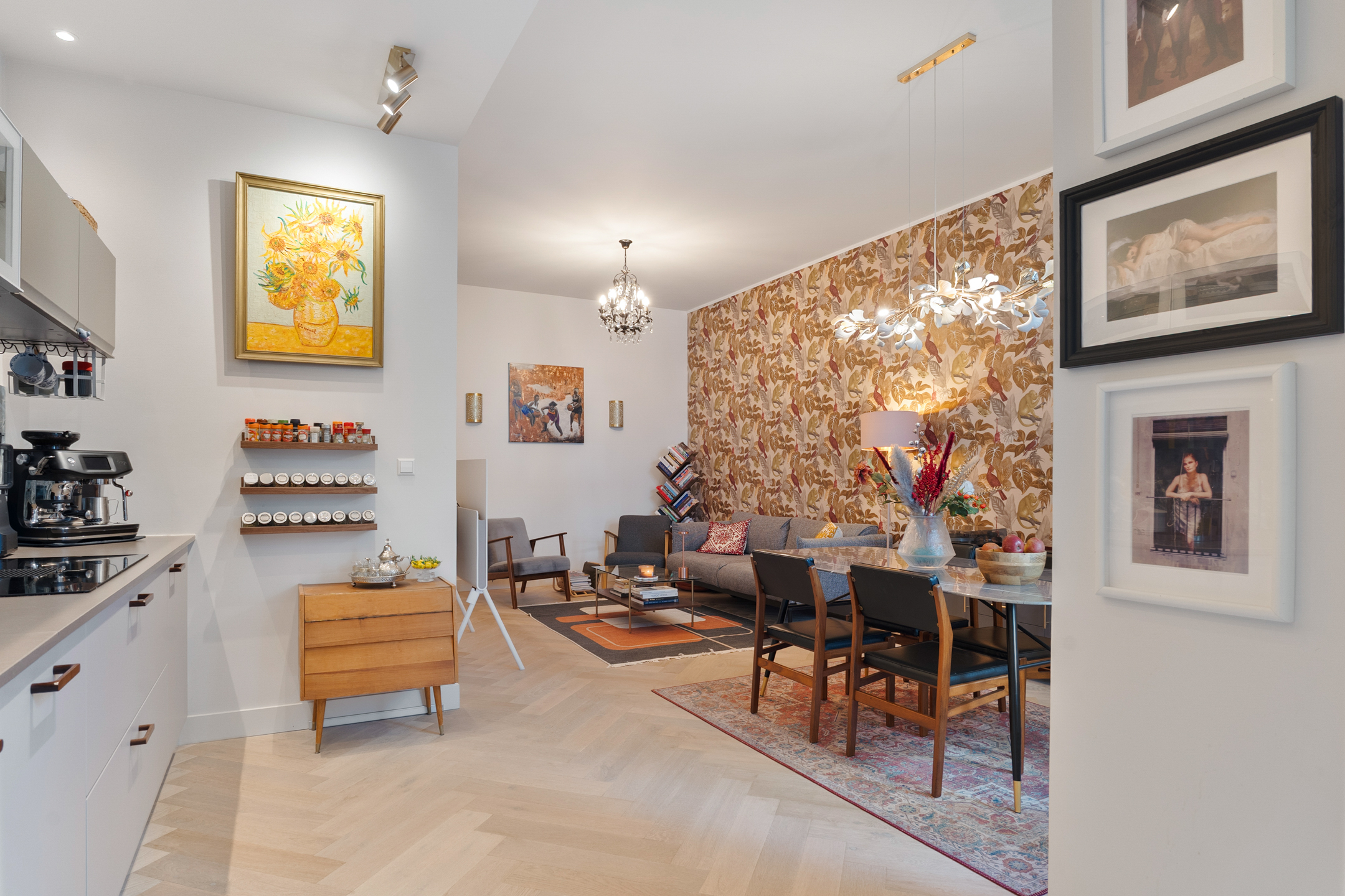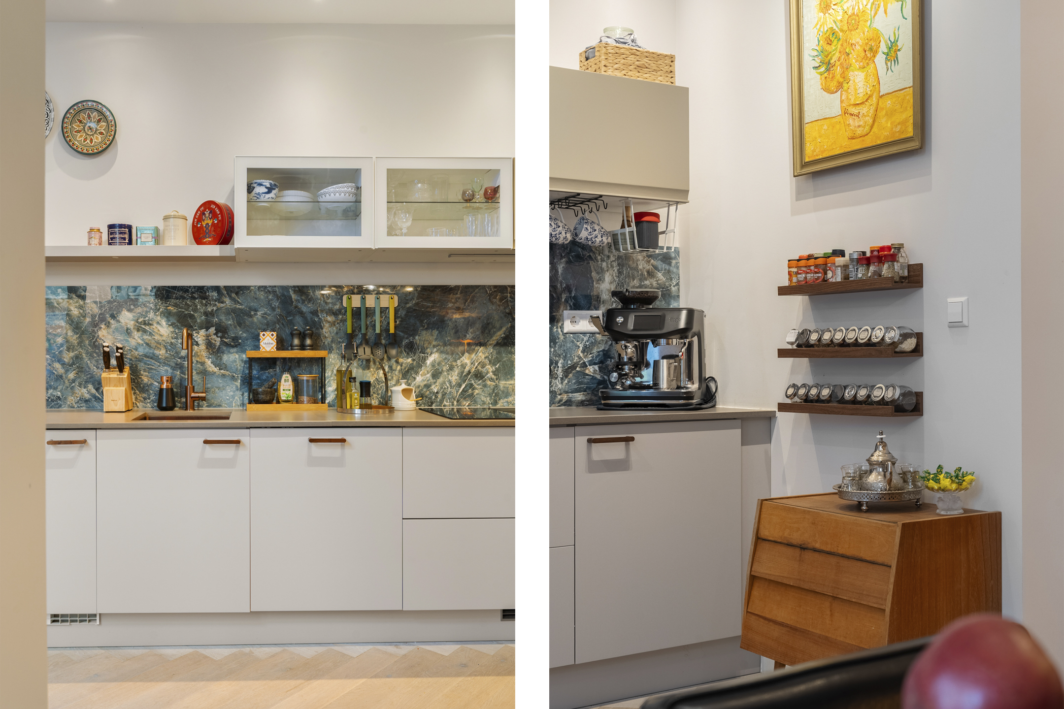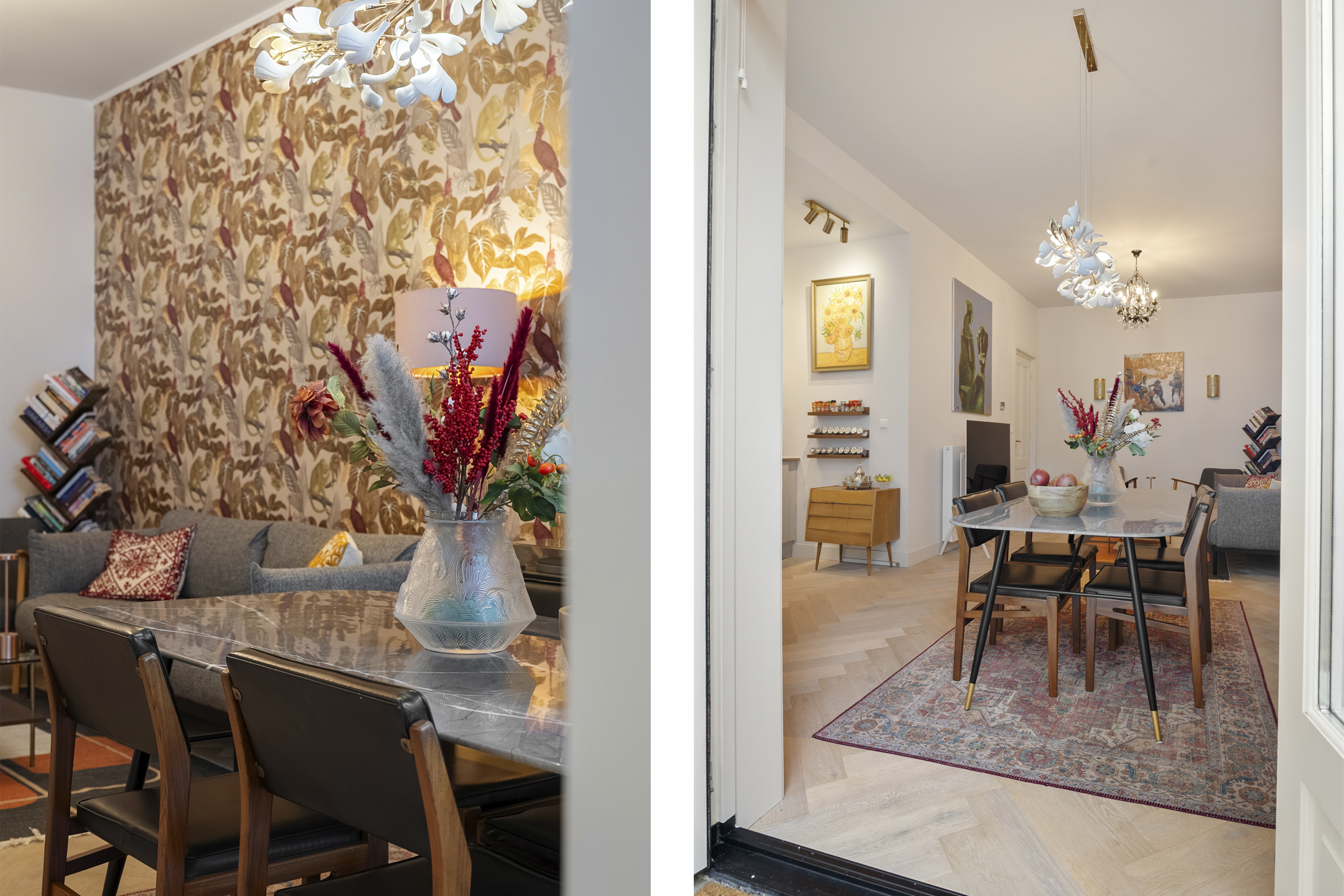 De tuingerichte woonkamer voelt licht, open en uitnodigend aan dankzij de openslaande deuren naar de achtertuin. De eiken visgraatvloer, luxe wandafwerking en kleurrijk behang geven de ruimte een warme, eigentijdse uitstraling. De moderne open keuken is uitgevoerd met een composiet werkblad, veel kastruimte en diverse inbouwapparatuur. De stijlvolle koperen kranen zorgen voor een harmonieus geheel.