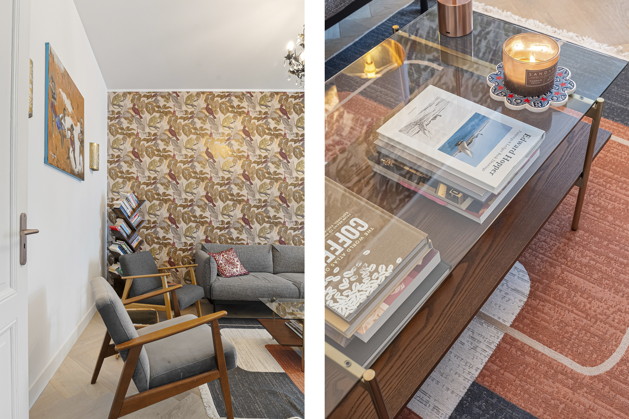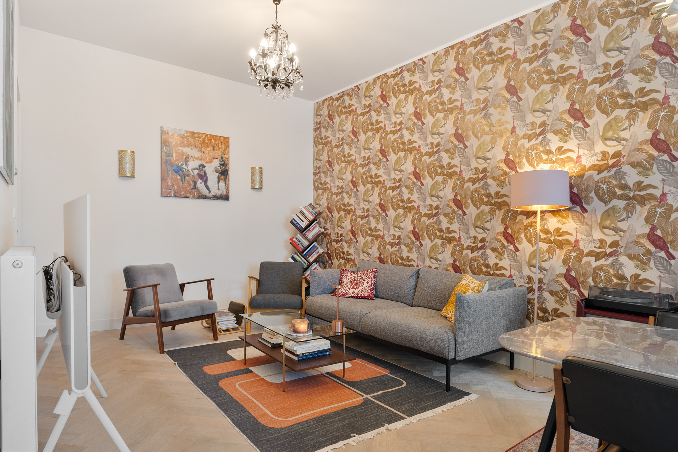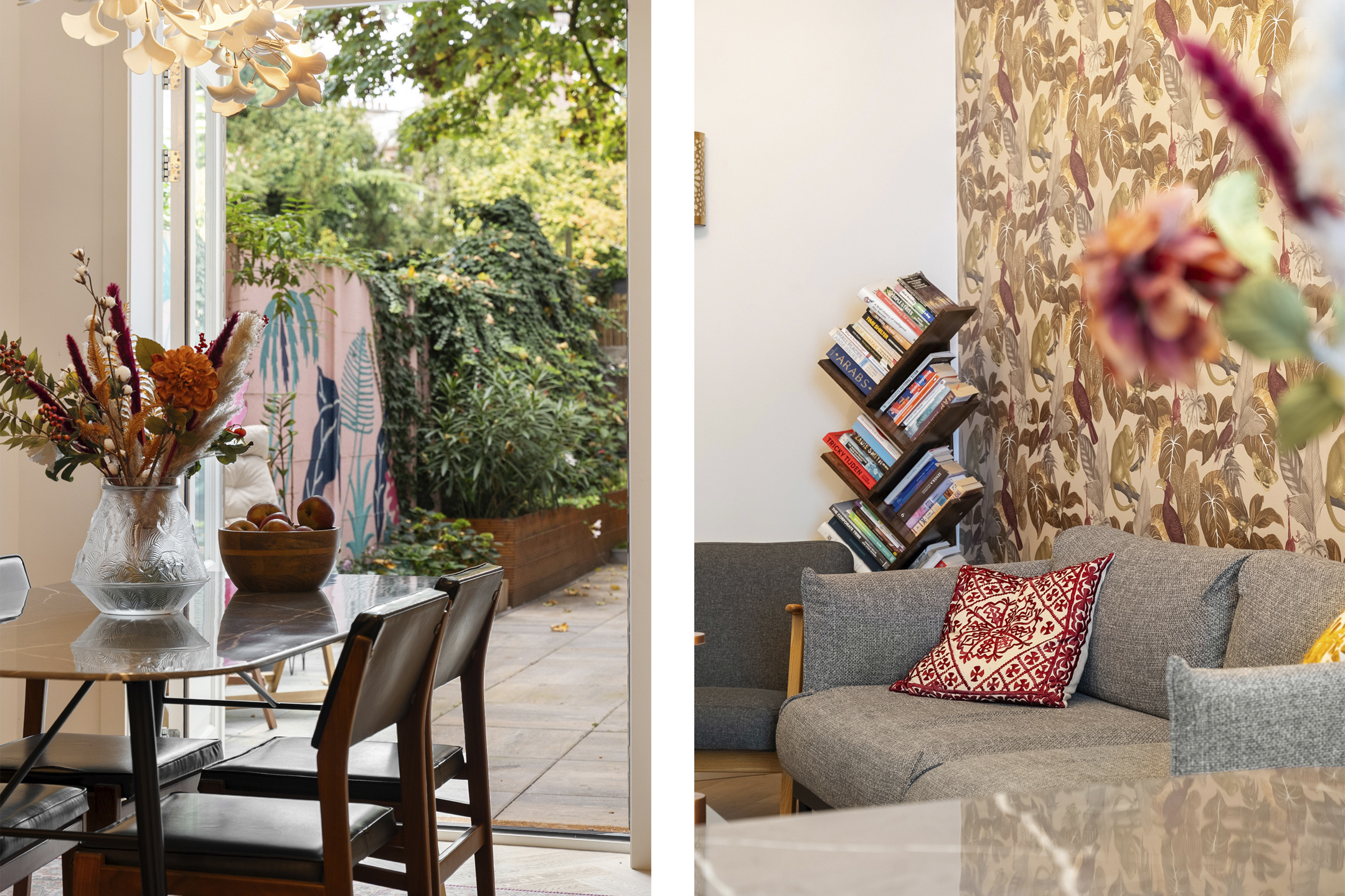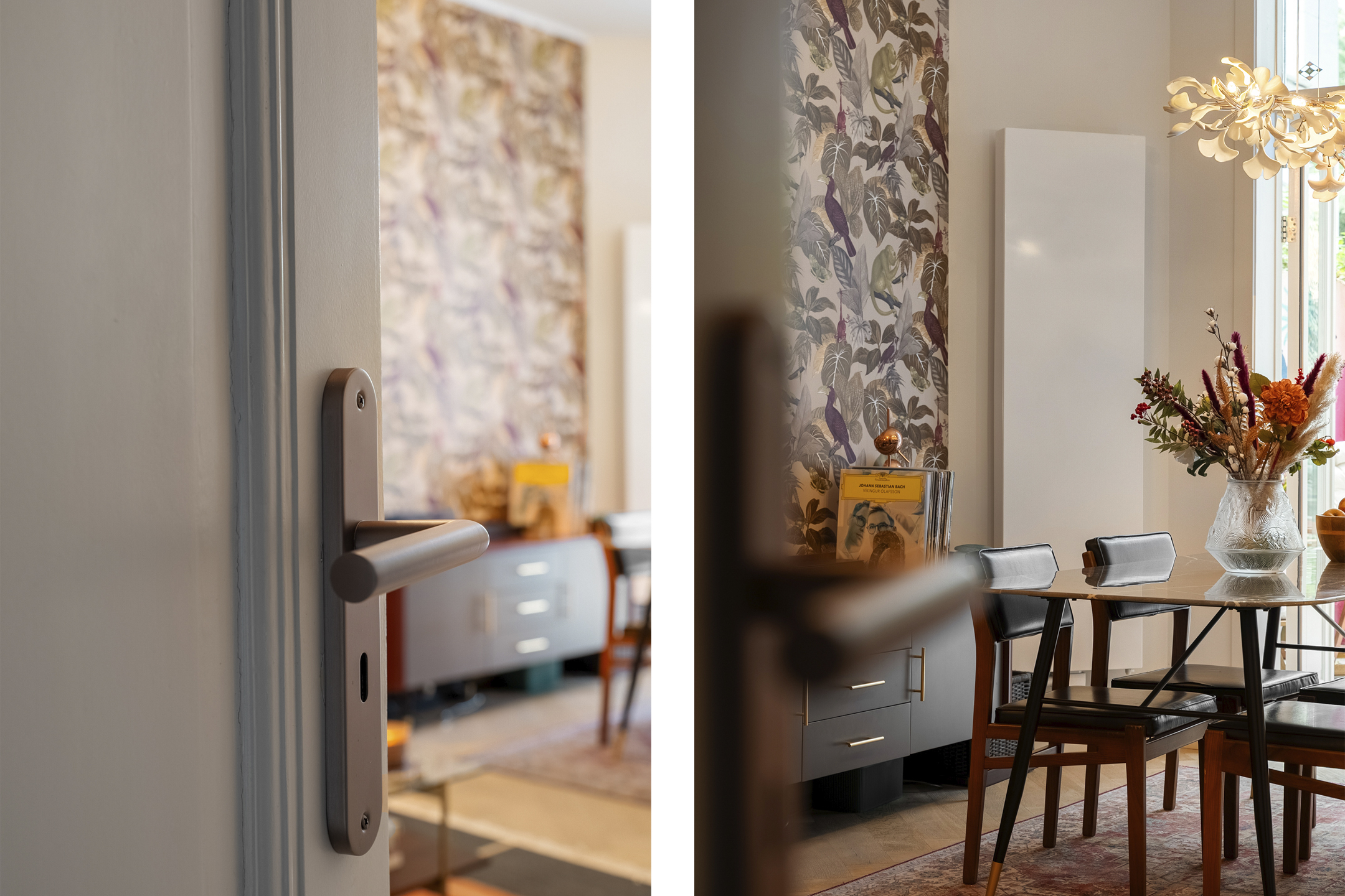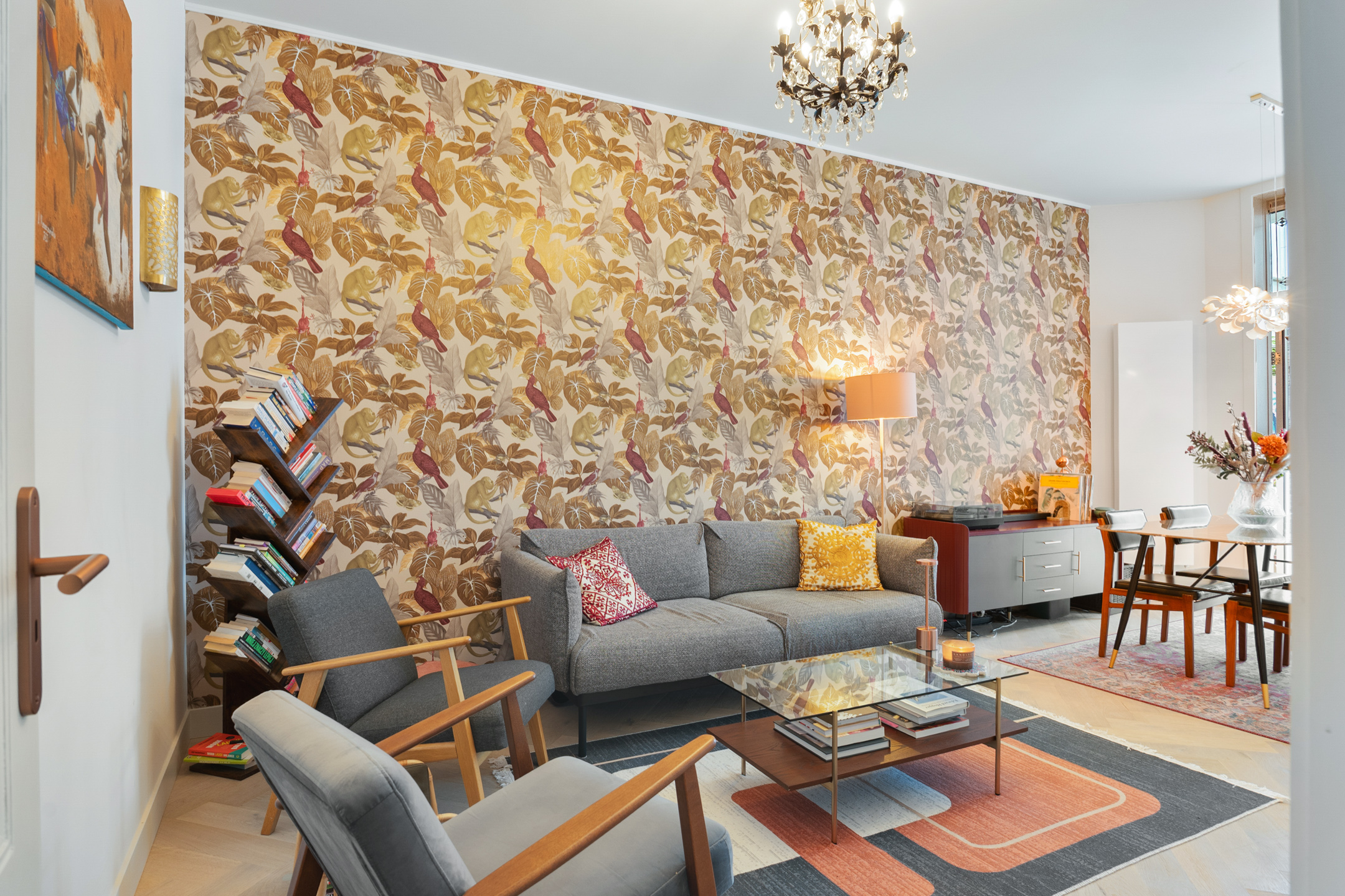 De tuingerichte woonkamer voelt licht, open en uitnodigend aan dankzij de openslaande deuren naar de achtertuin. De eiken visgraatvloer, luxe wandafwerking en kleurrijk behang geven de ruimte een warme, eigentijdse uitstraling. De moderne open keuken is uitgevoerd met een composiet werkblad, veel kastruimte en diverse inbouwapparatuur. De stijlvolle koperen kranen zorgen voor een harmonieus geheel.