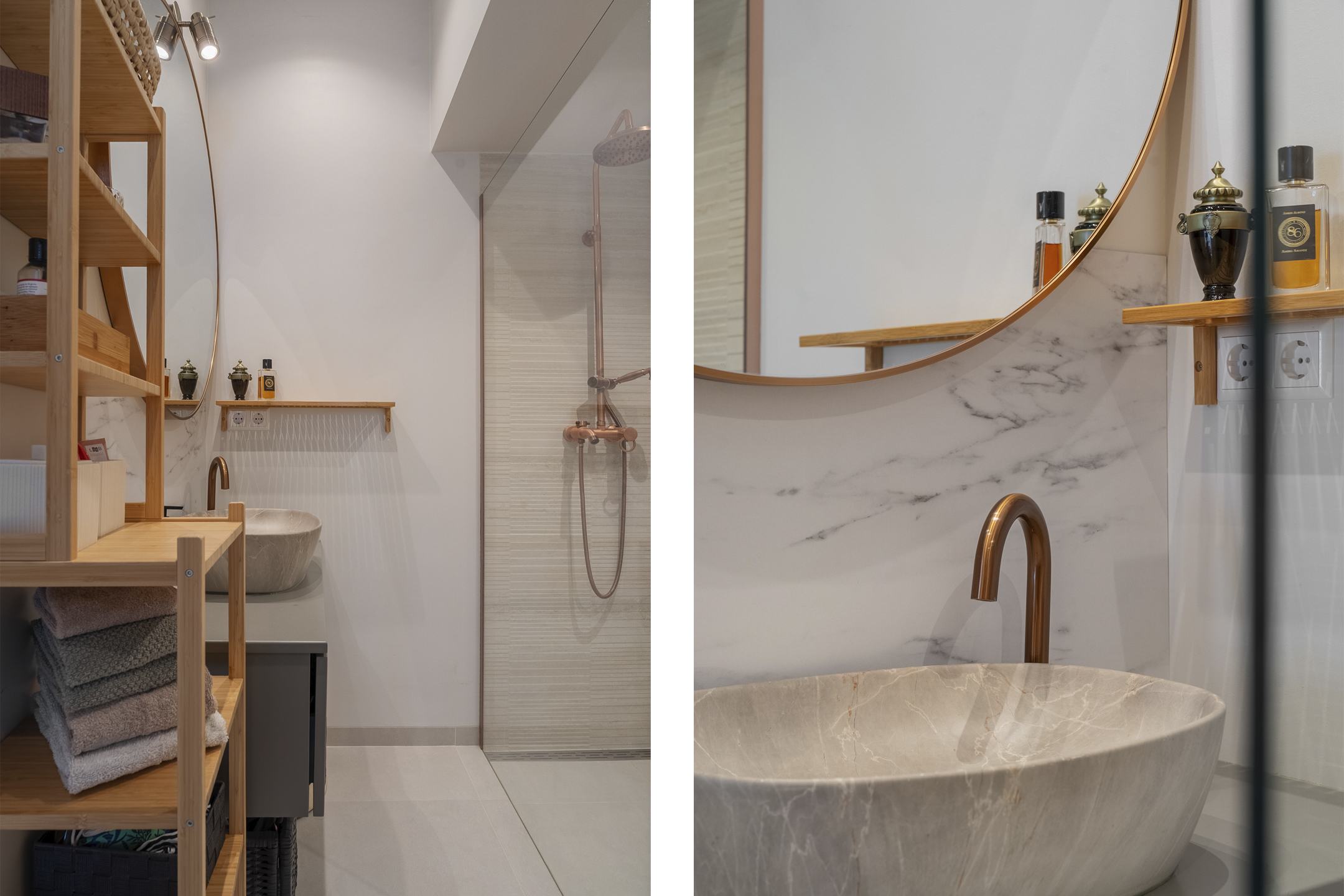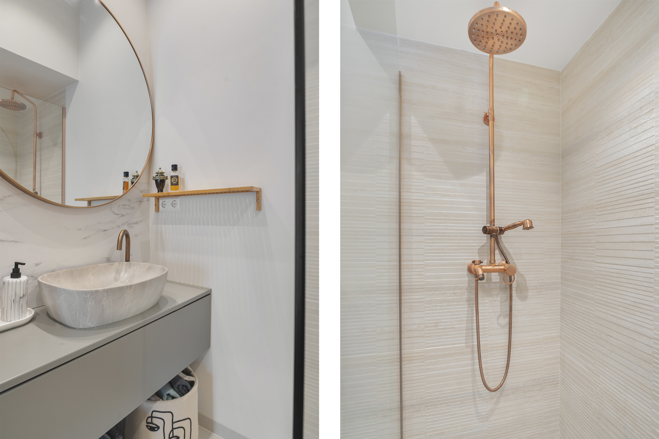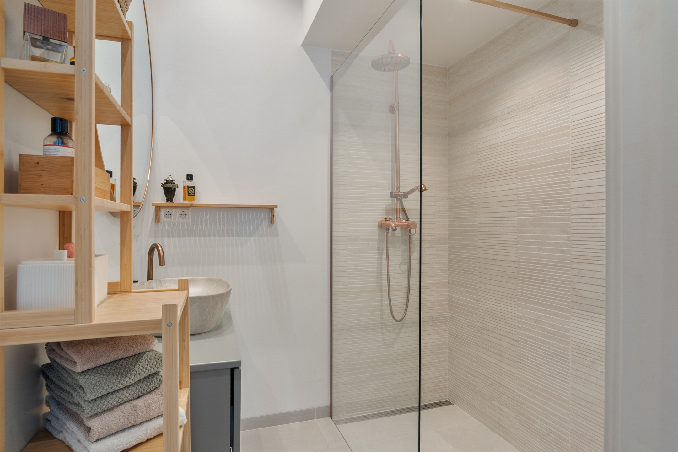 Aan de voorzijde ligt een ruime slaapkamer met groot raam en veel lichtinval. De centraal gelegen badkamer is compact maar luxe, met vloerverwarming, inloopdouche, stijlvol wastafelmeubel en hoogwaardige afwerking.