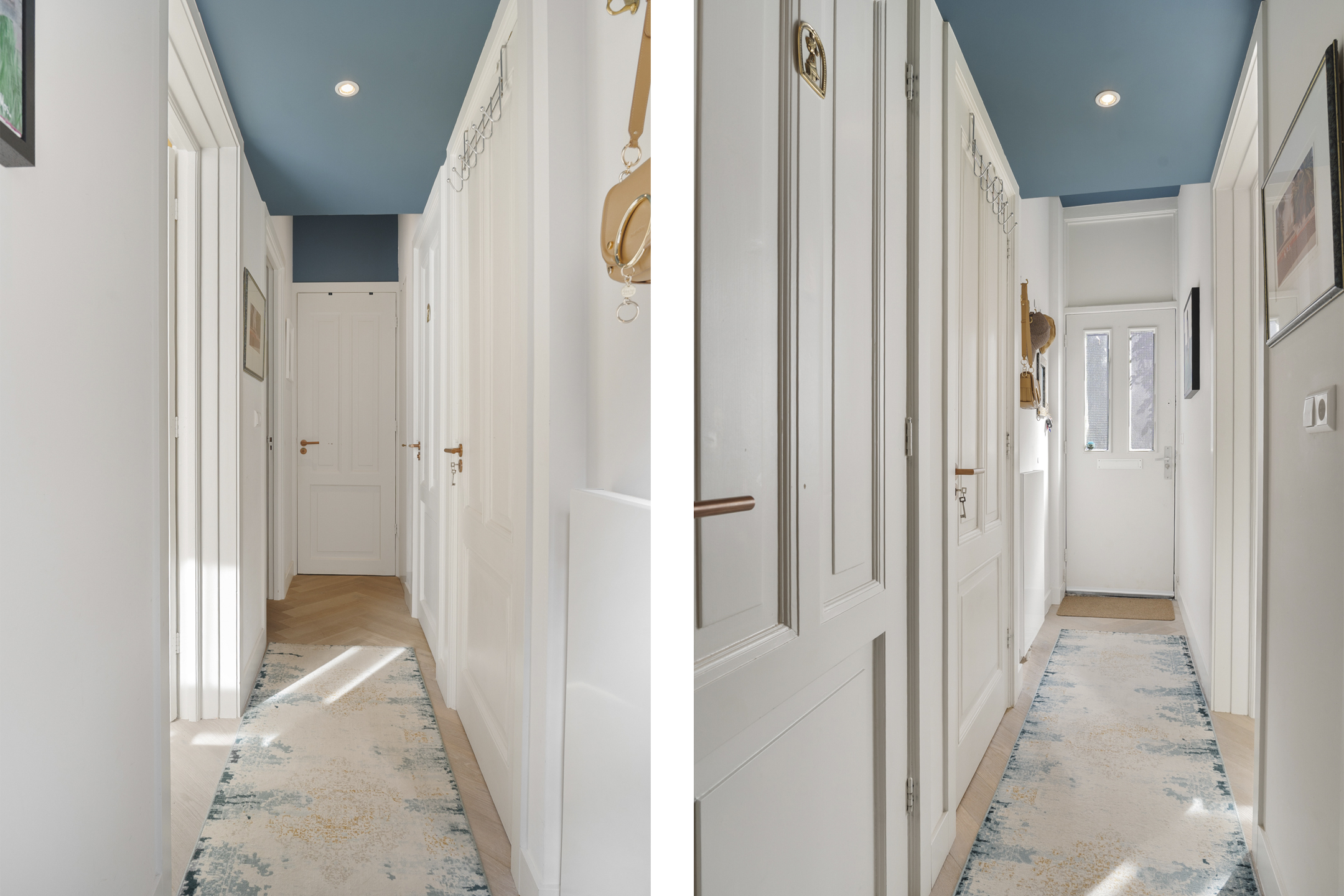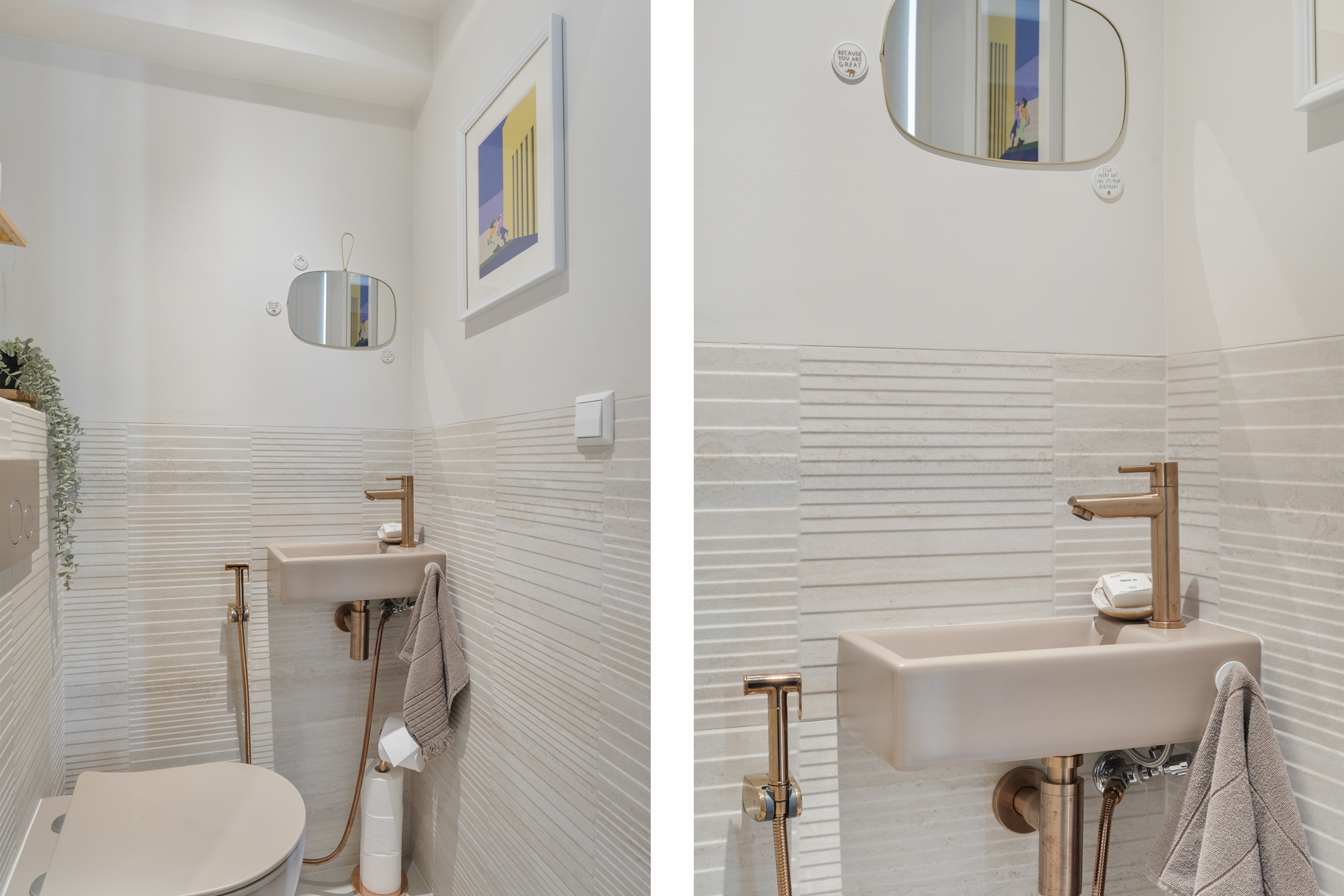 Via je eigen voordeur stap je binnen in een sfeervolle hal met handige bergruimte onder de trap, een meterkast/garderobekast en opstelplek voor wasmachine en droger. Het separate toilet is modern uitgevoerd met fonteintje en fraaie koperen details die meteen de toon zetten voor de rest van de woning.