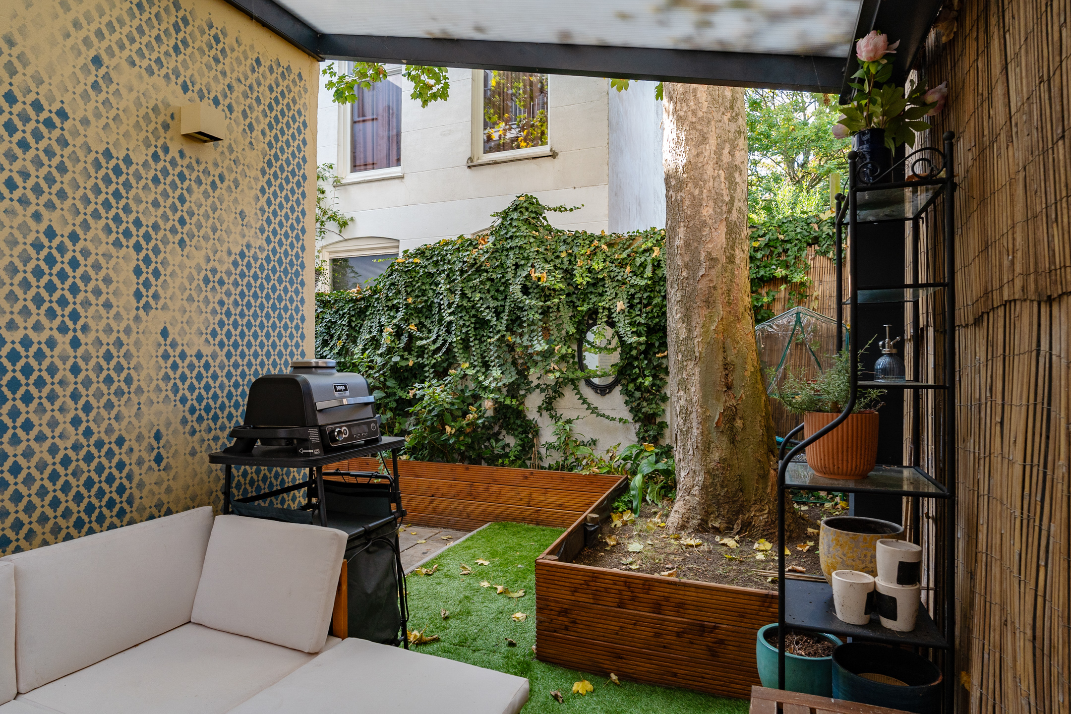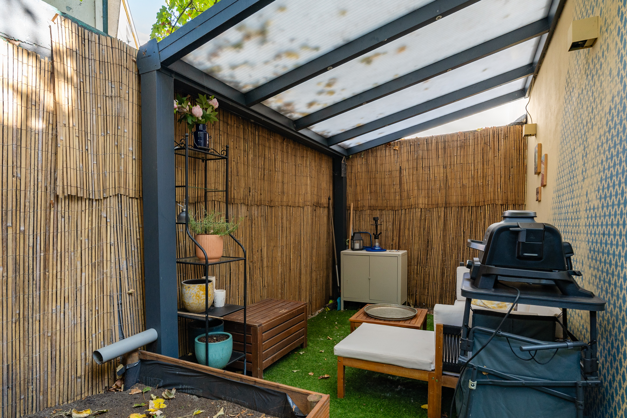 De achtertuin is verzorgd aangelegd, grotendeels betegeld en voorzien van grote plantenbakken en een overkapping (2024) – ideaal voor lange zomeravonden of een barbecue met vrienden. Dankzij de westligging geniet je hier van de middag- en avondzon.