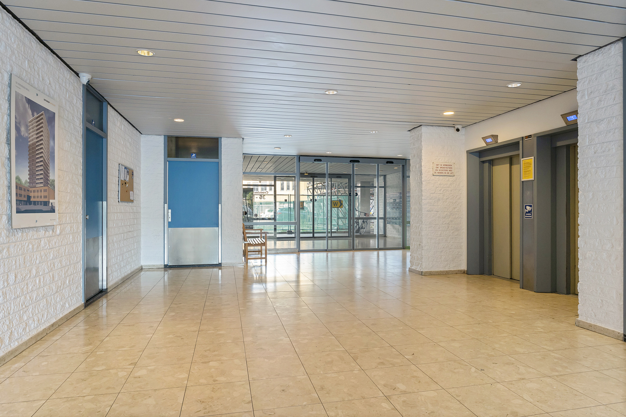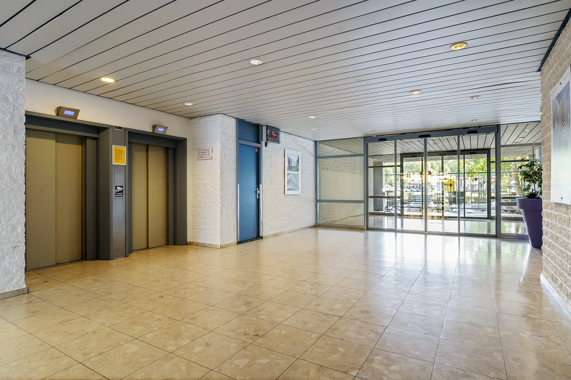 Bij binnenkomst word je verwelkomd door een ruime entree met brievenbussen, intercomsysteem, afgesloten hal met modern bellentableau en toegang tot twee nieuwe liften voor optimaal comfort. Het complex beschikt tevens over een gemeenschappelijke fietsenberging met per verdieping afgesloten stallingsruimte.