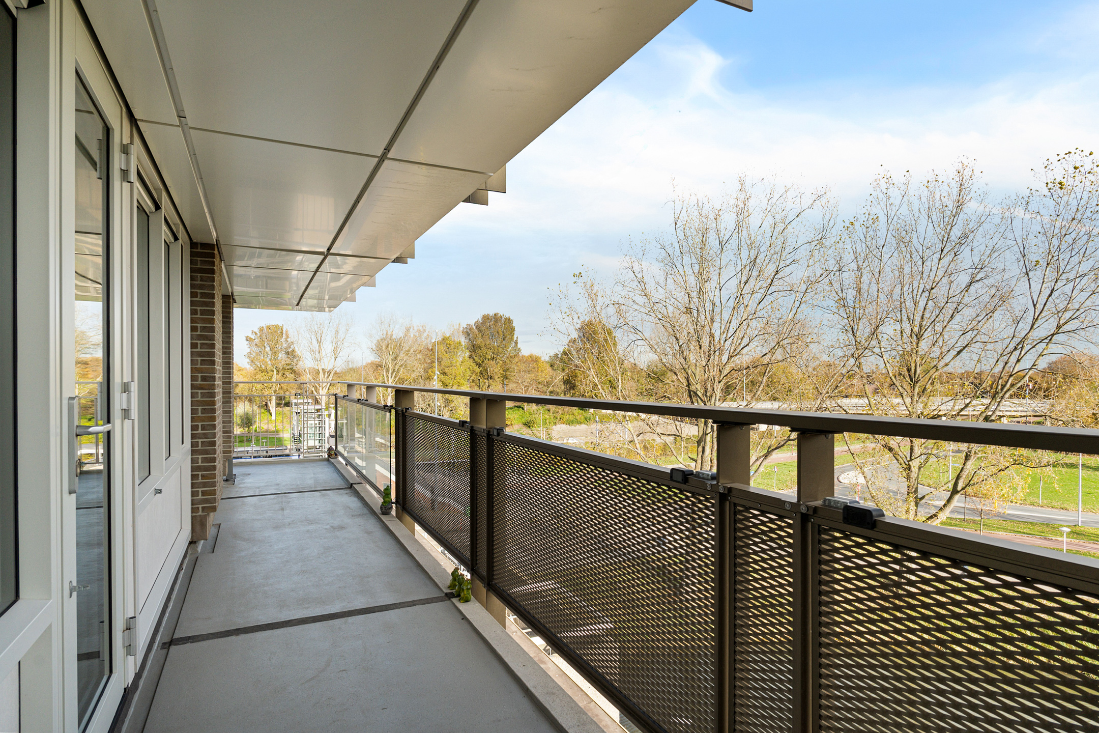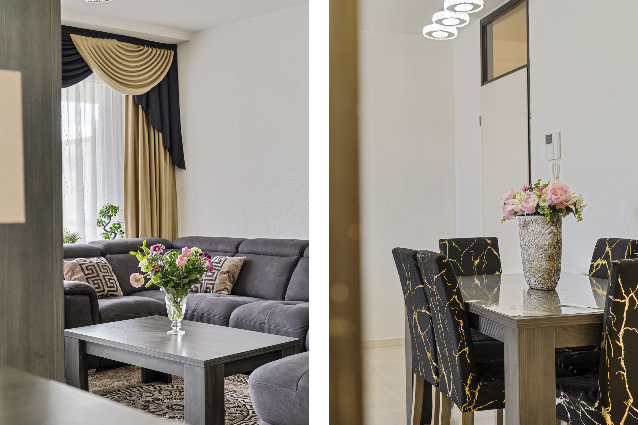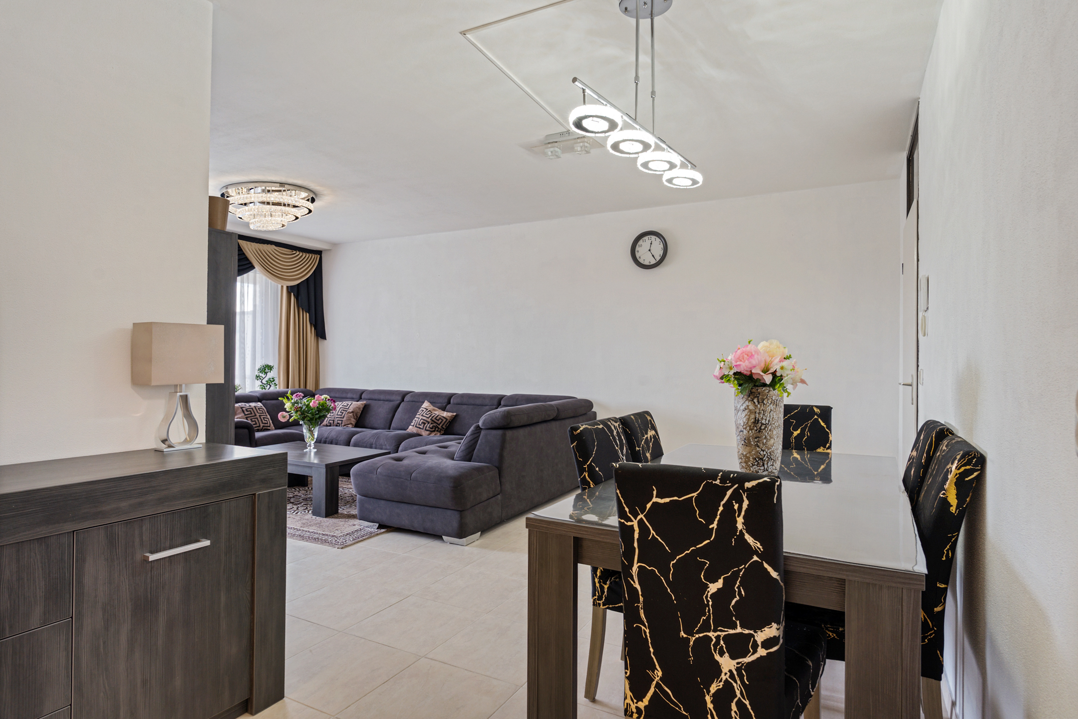 De royale woonkamer (ca. 30 m²) is heerlijk licht dankzij de grote ramen en biedt toegang tot het balkon dat zich rondom het appartement uitstrekt.