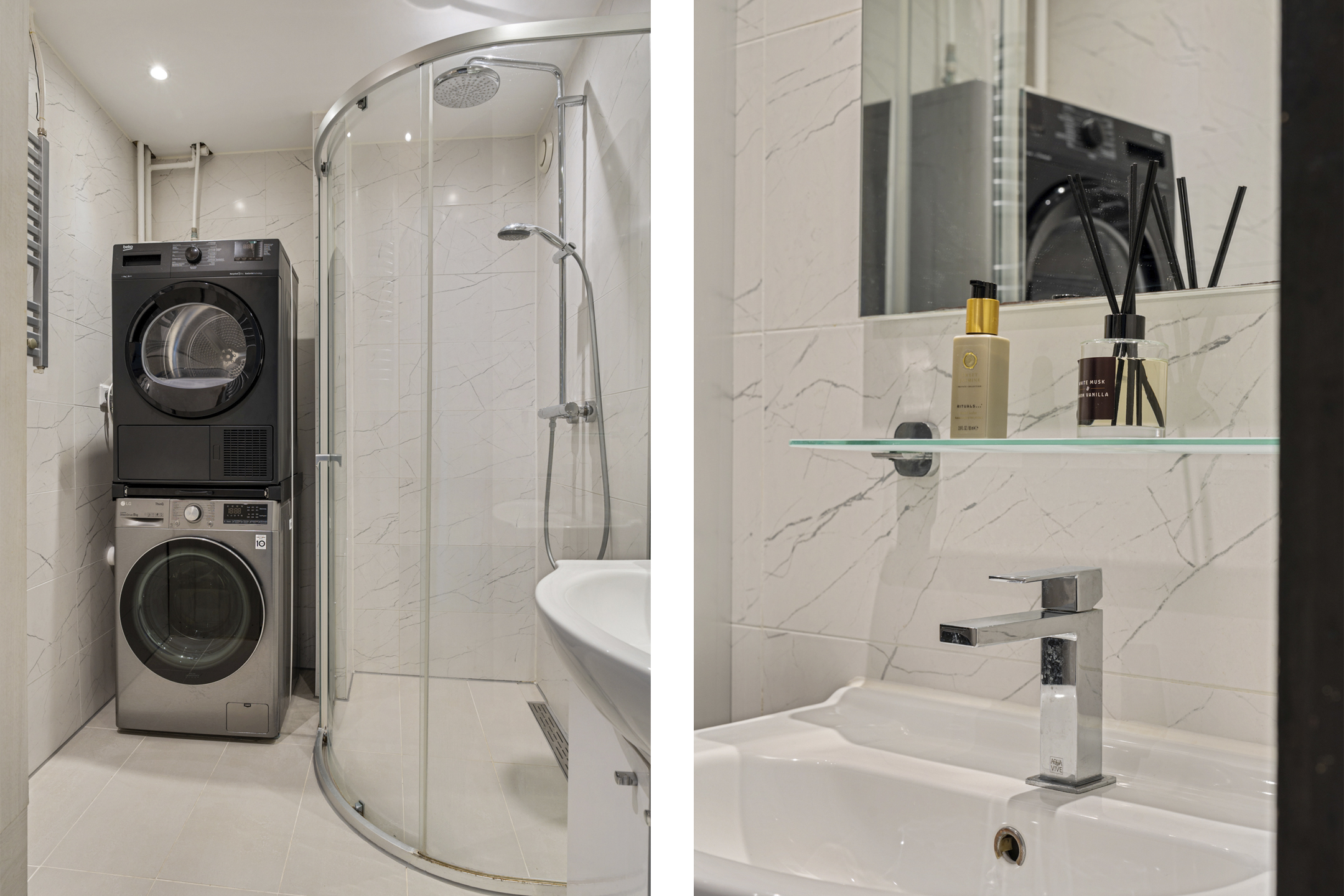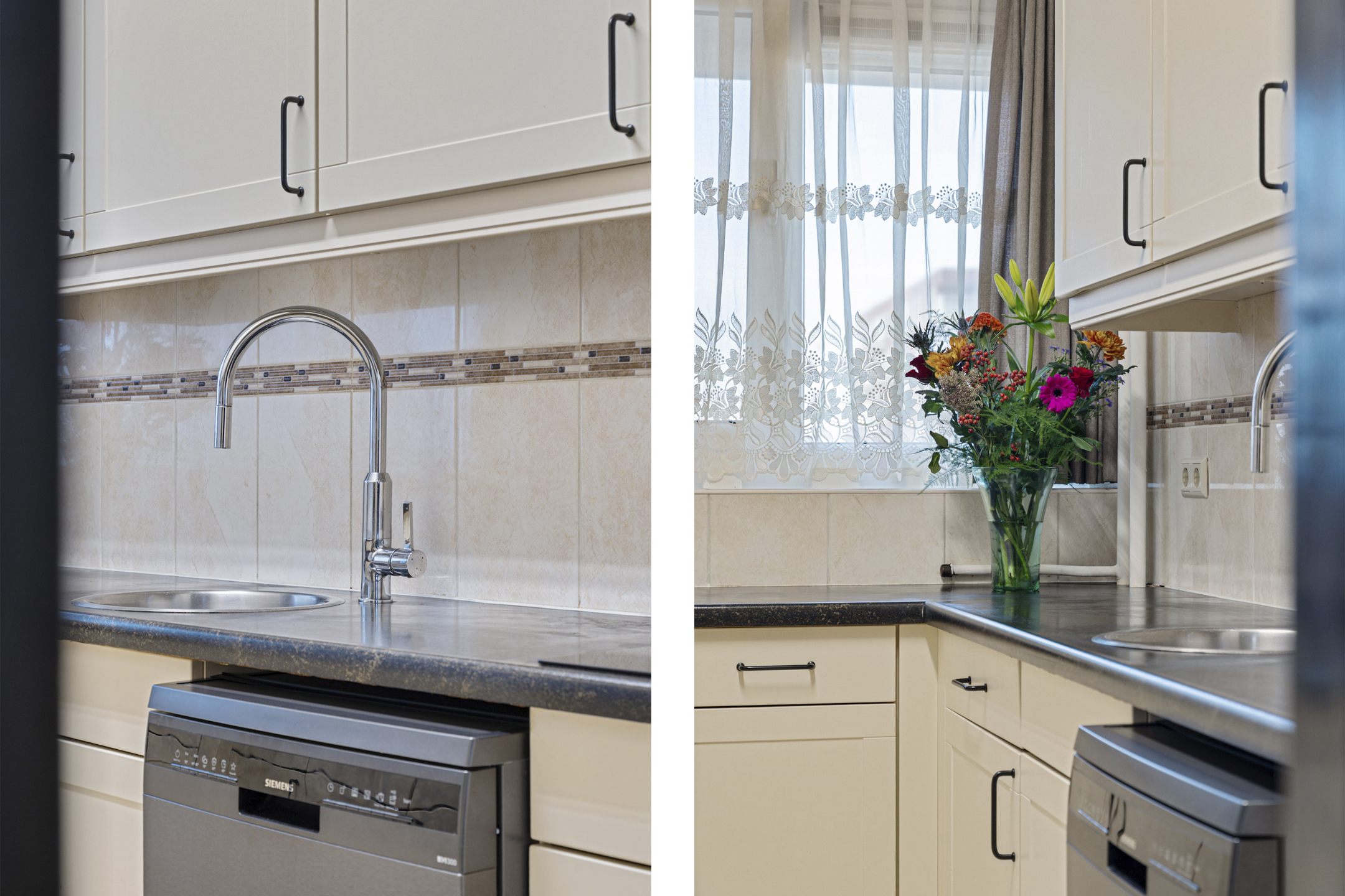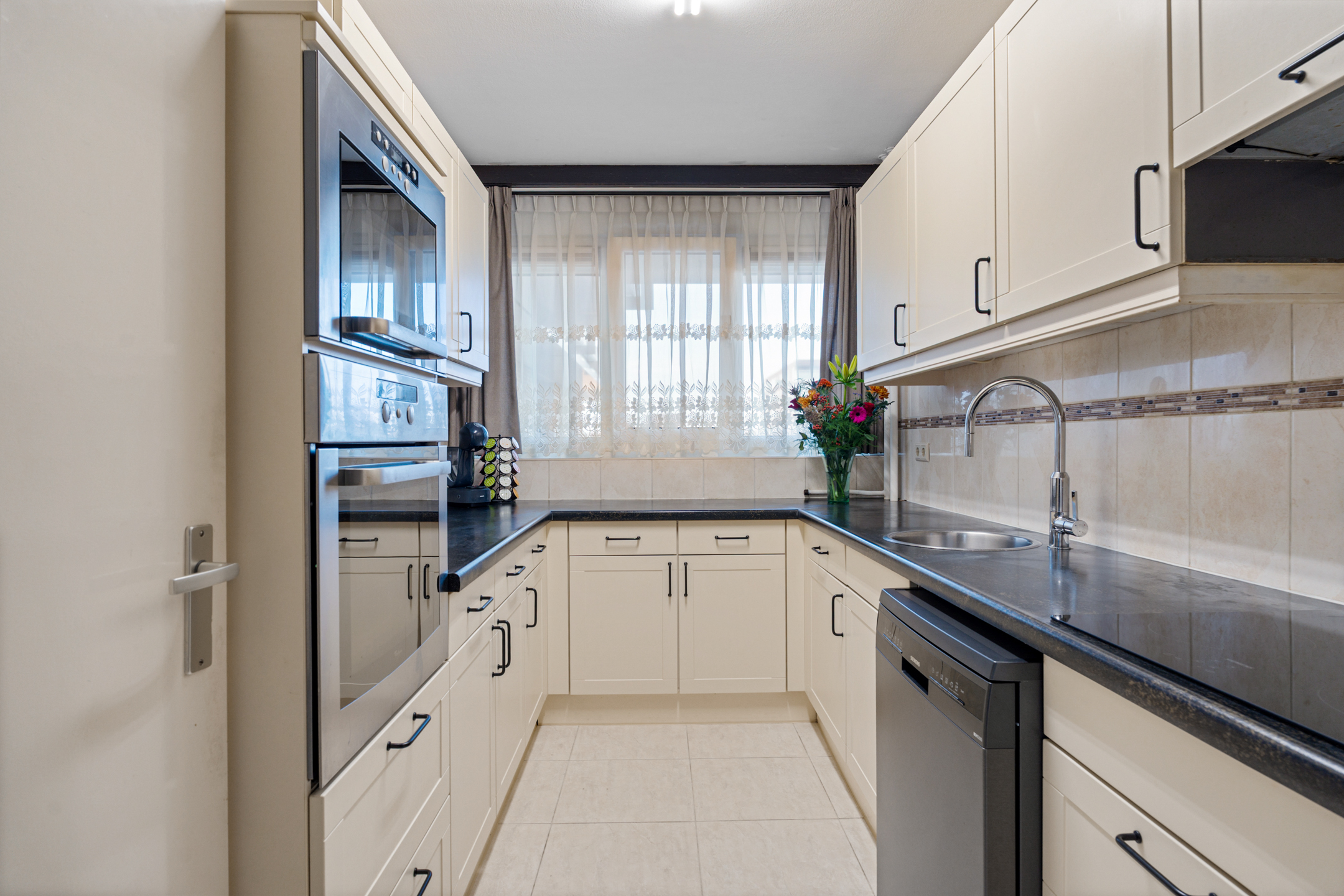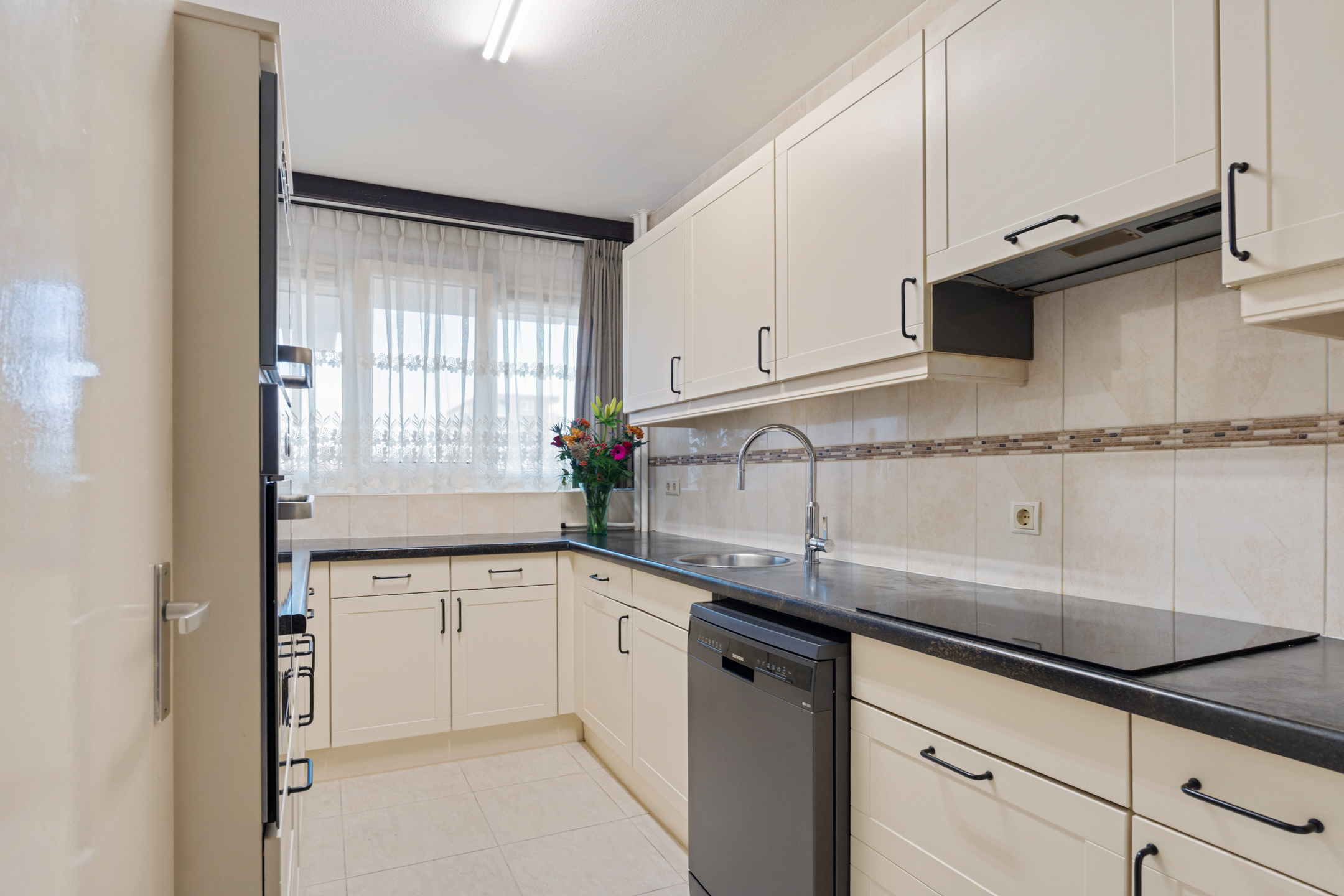 De keuken is keurig en voorzien van inbouwapparatuur, veel werkruimte en kastruimte. Er is een apart toilet en een badkamer met douche, wastafelmeubel en aansluitingen voor wasmachine en droger.