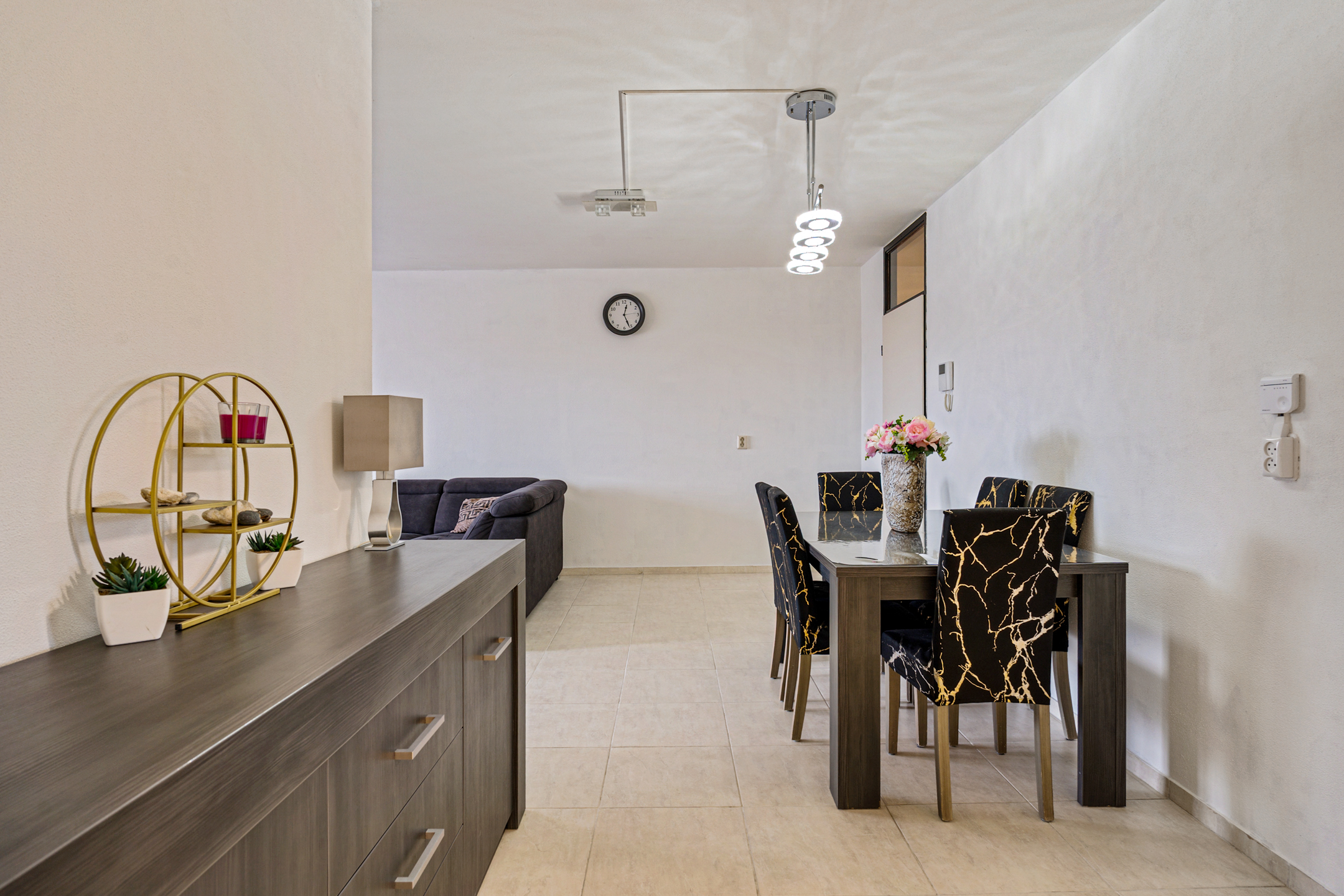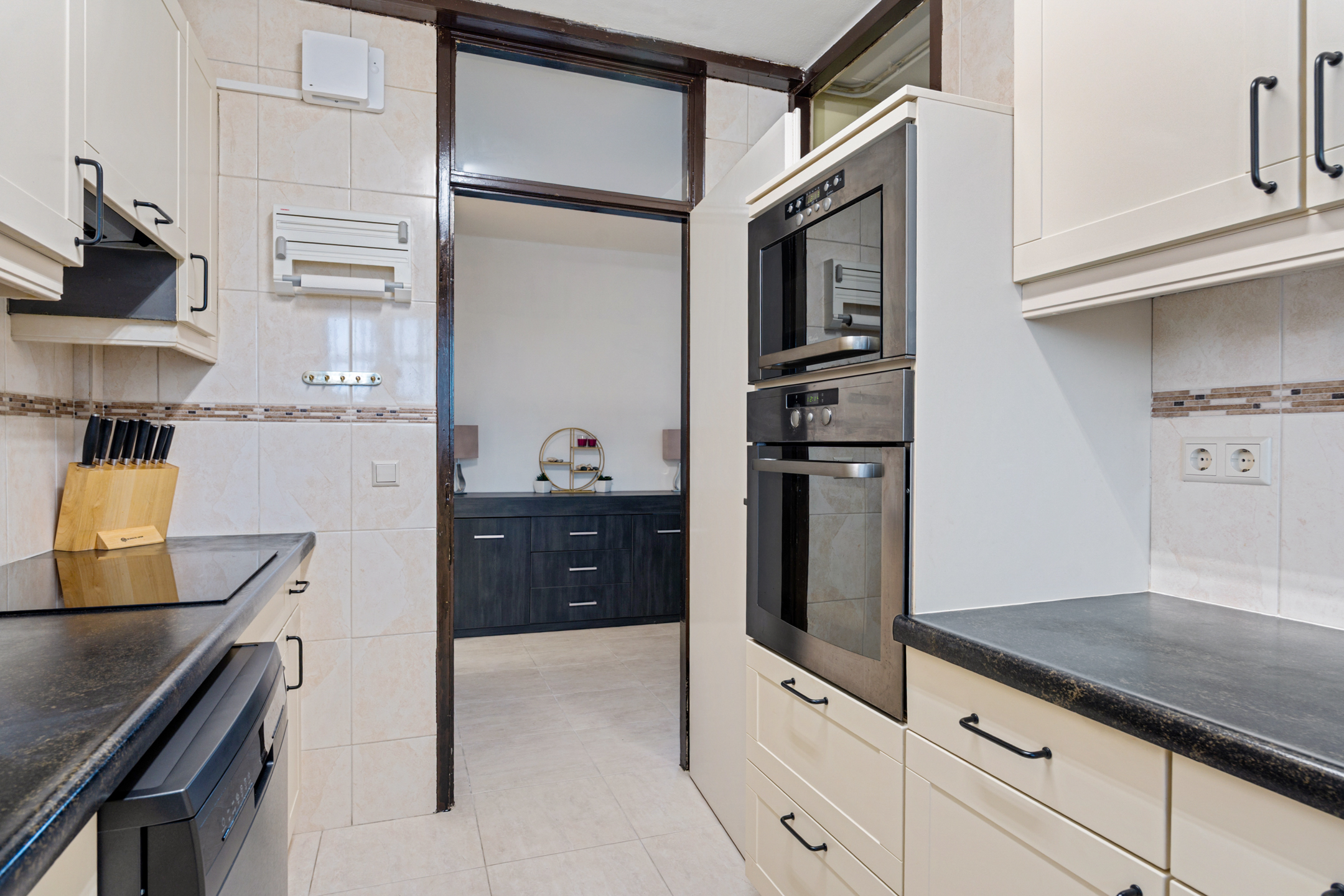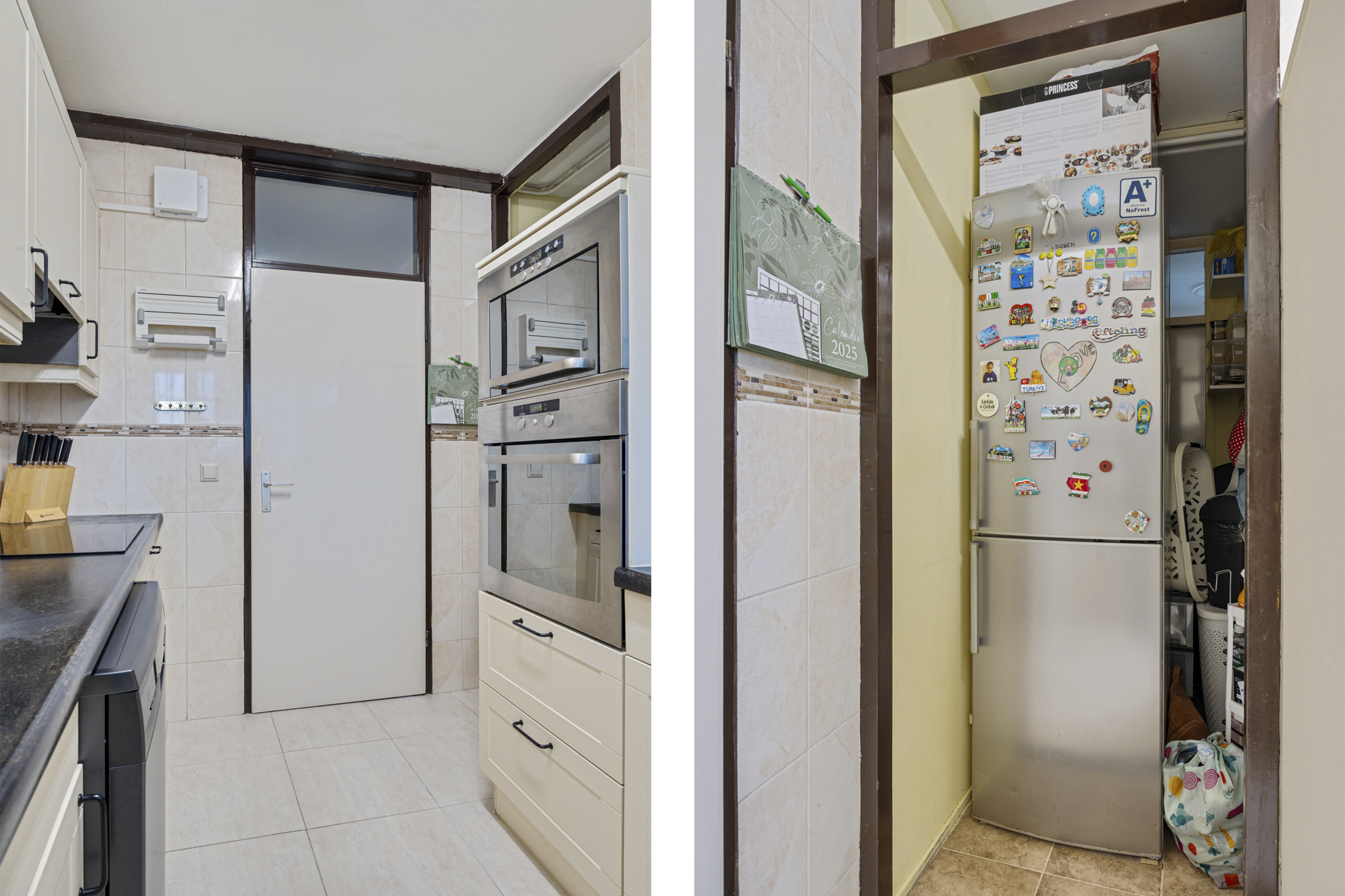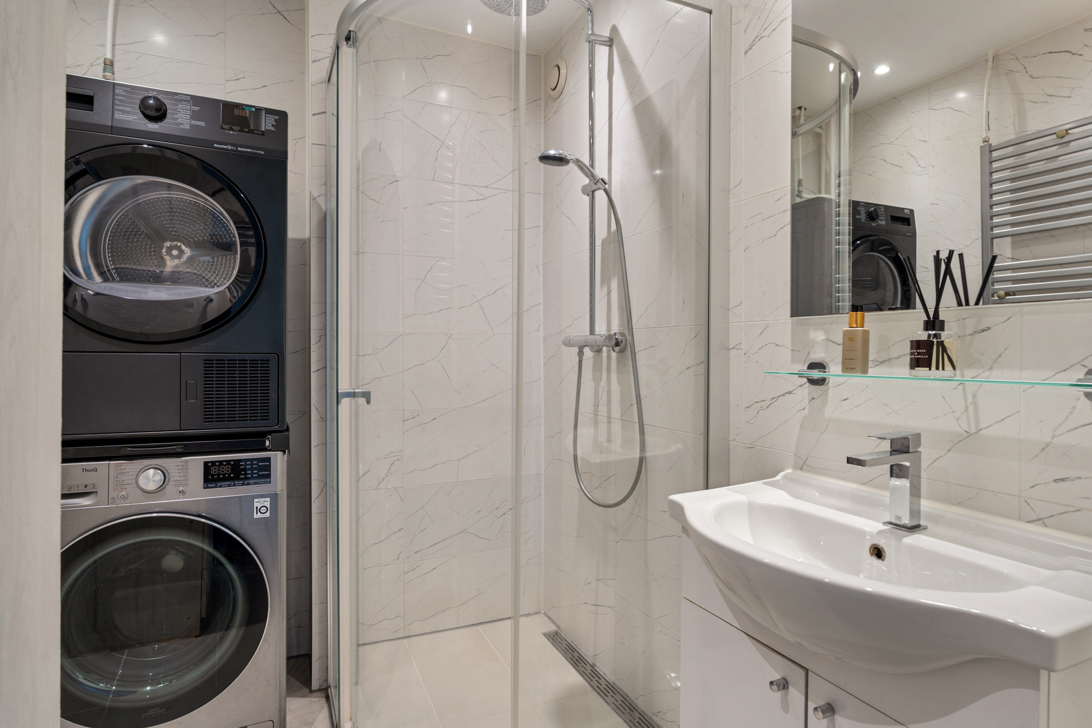 De keuken is keurig en voorzien van inbouwapparatuur, veel werkruimte en kastruimte. Er is een apart toilet en een badkamer met douche, wastafelmeubel en aansluitingen voor wasmachine en droger.
