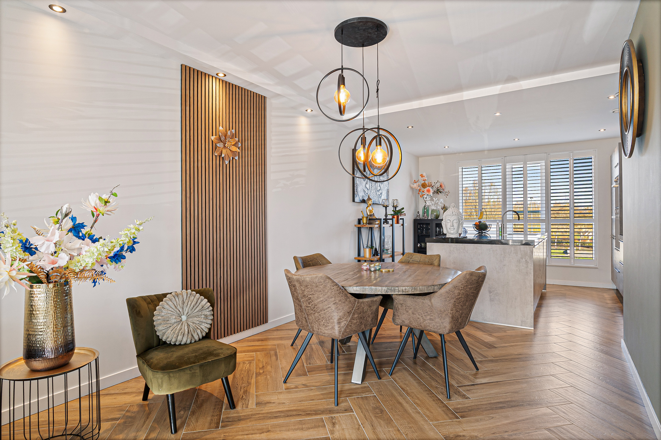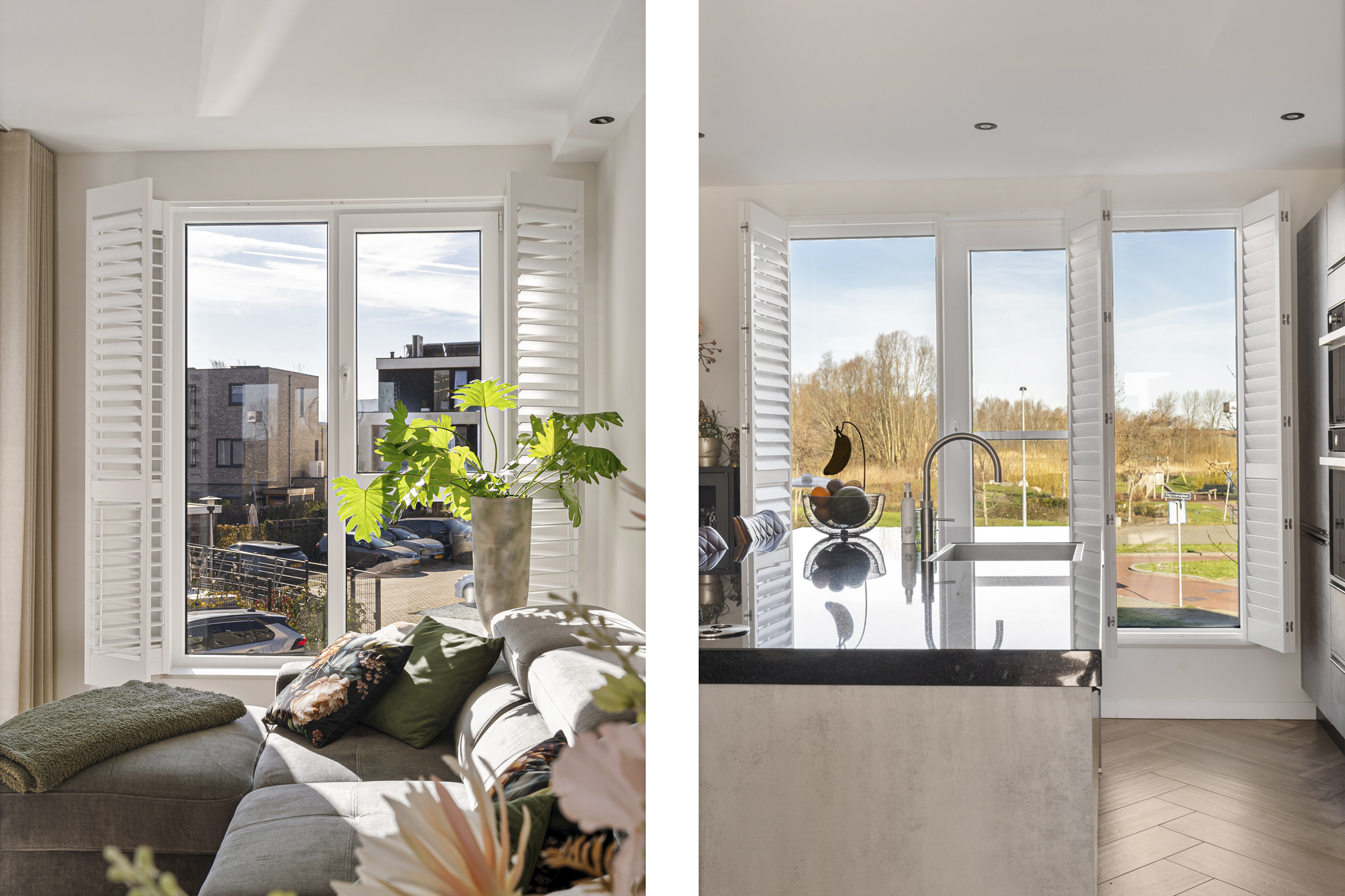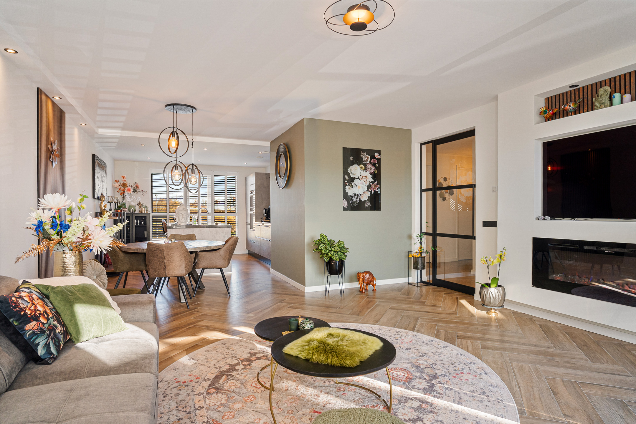 Bij binnenkomst valt direct de stijlvolle afwerking op. De royale woonkamer vormt het hart van de woning en wordt gekenmerkt door veel daglicht en een warme uitstraling dankzij de prachtige visgraatvloer en de stijlvolle raamafwerking met shutters.