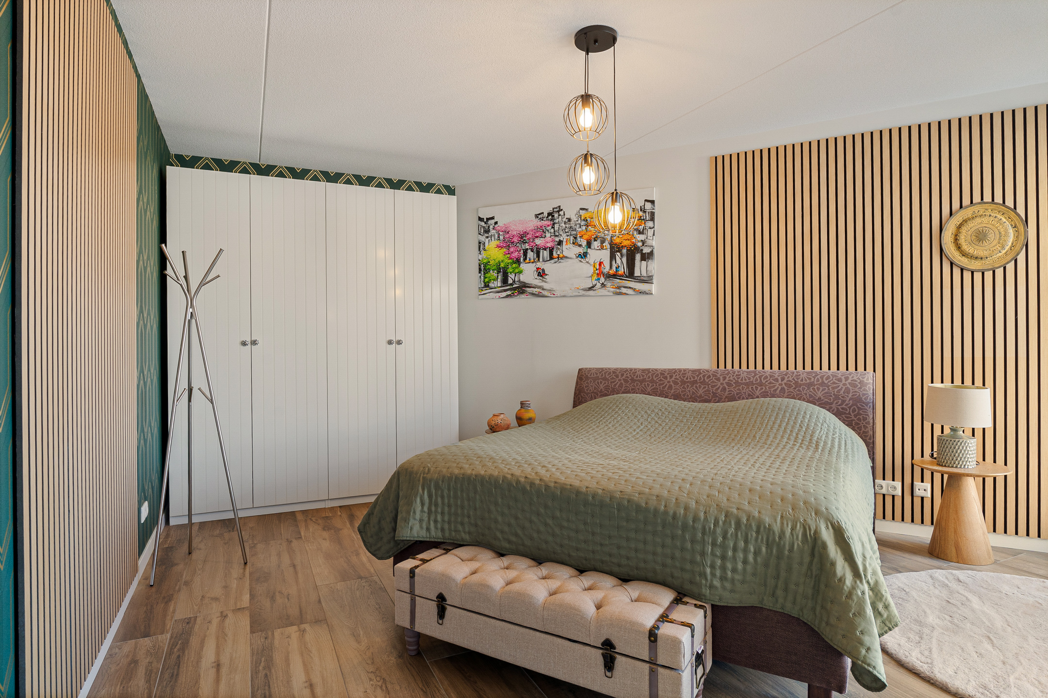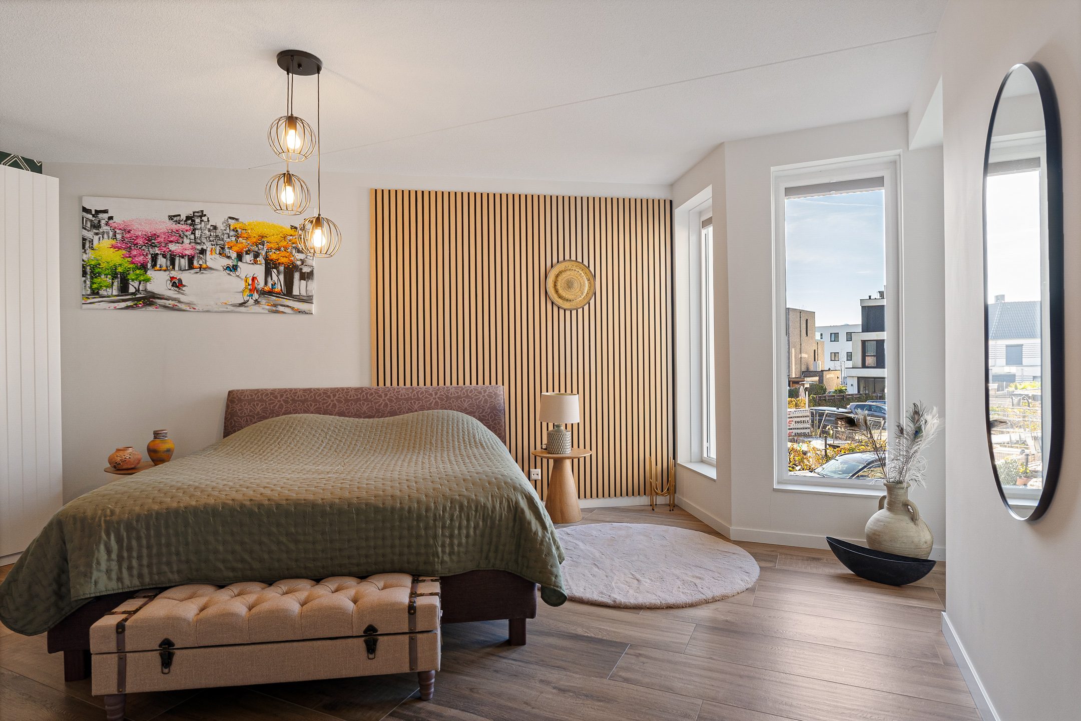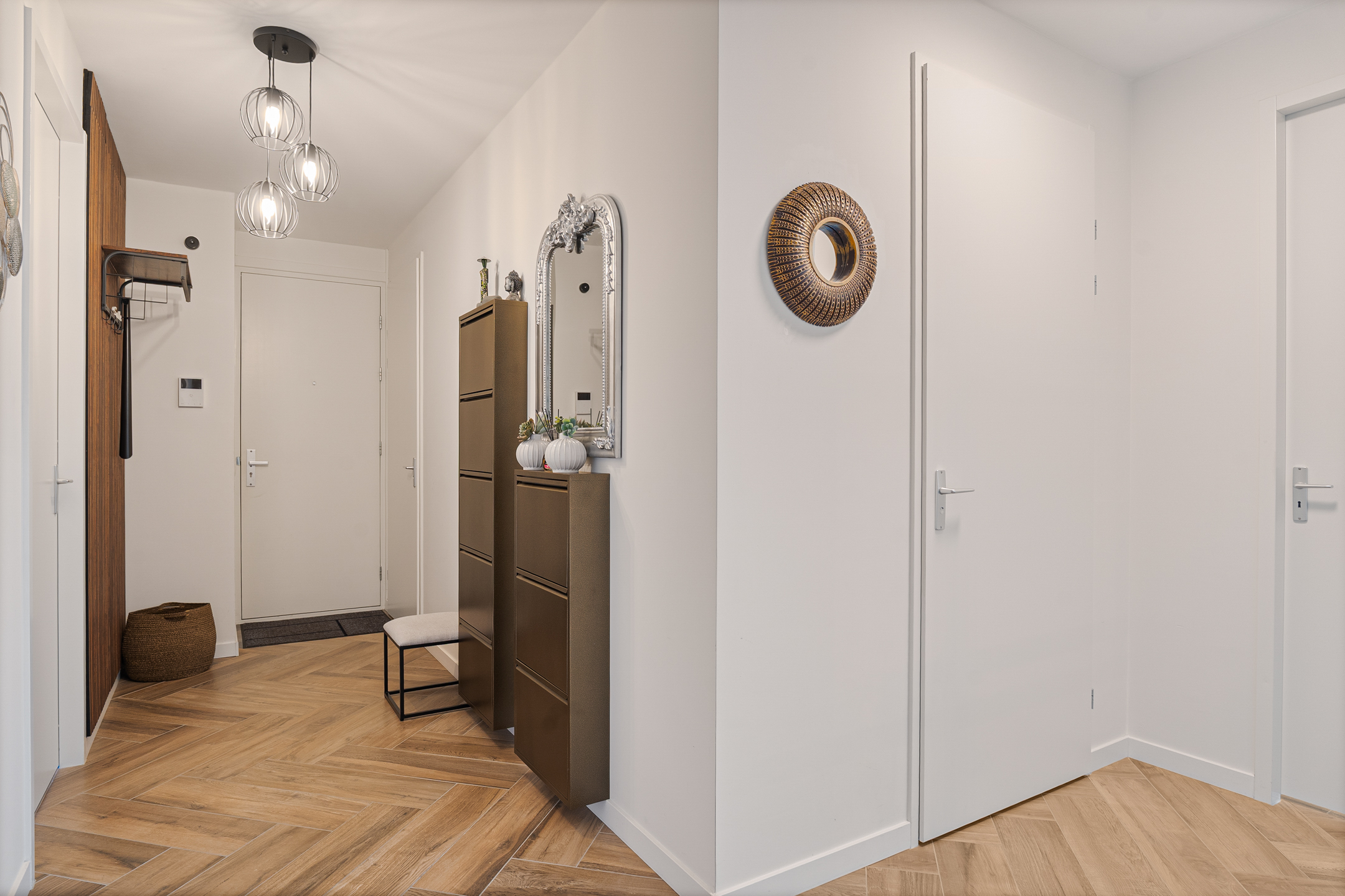 Bij binnenkomst valt direct de stijlvolle afwerking op. De royale woonkamer vormt het hart van de woning en wordt gekenmerkt door veel daglicht en een warme uitstraling dankzij de prachtige visgraatvloer en de stijlvolle raamafwerking met shutters.