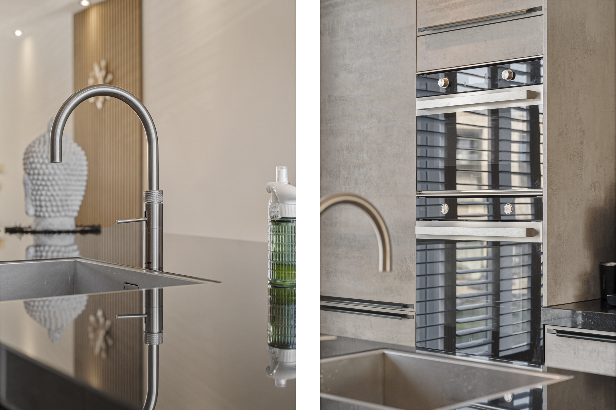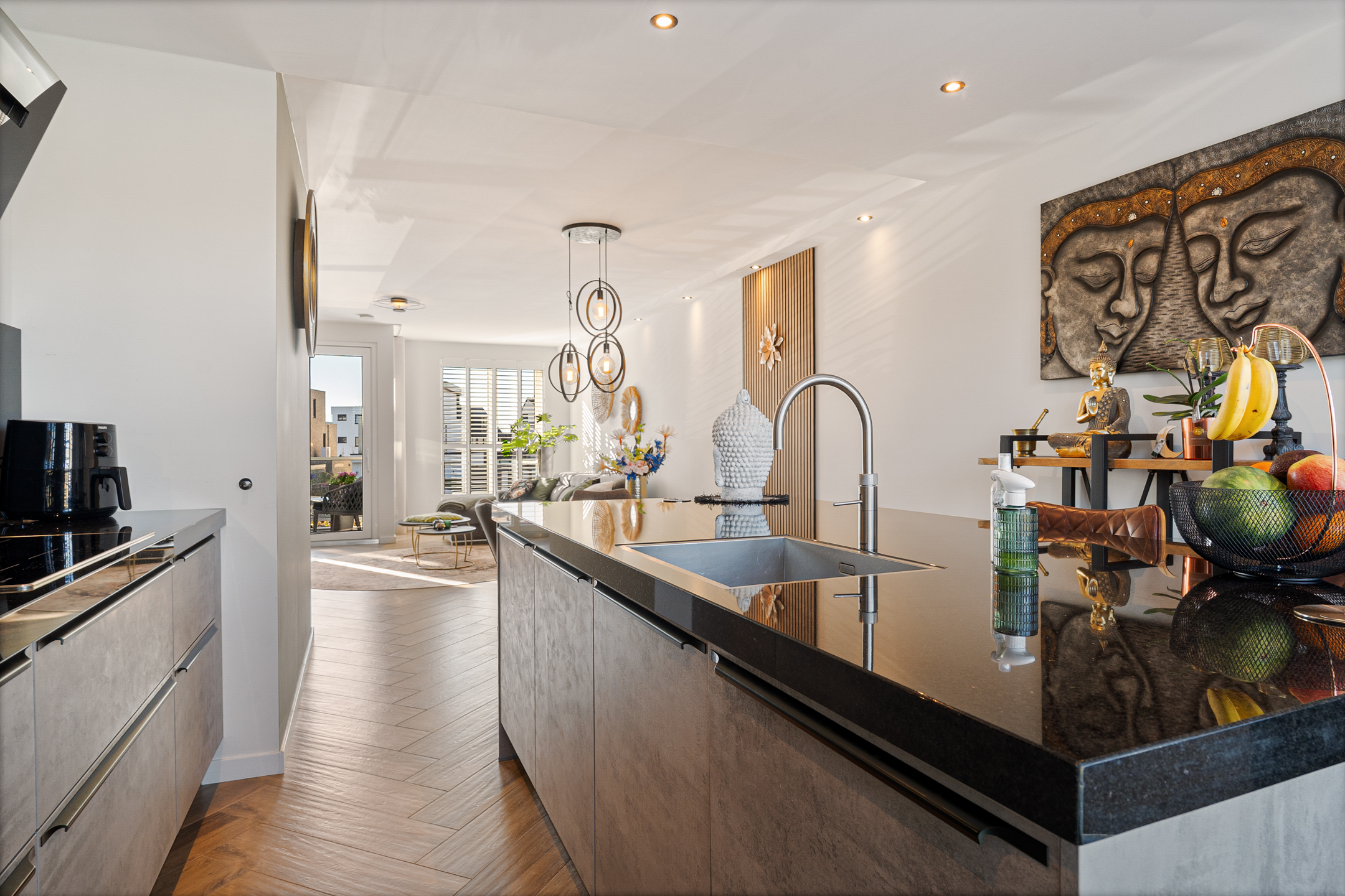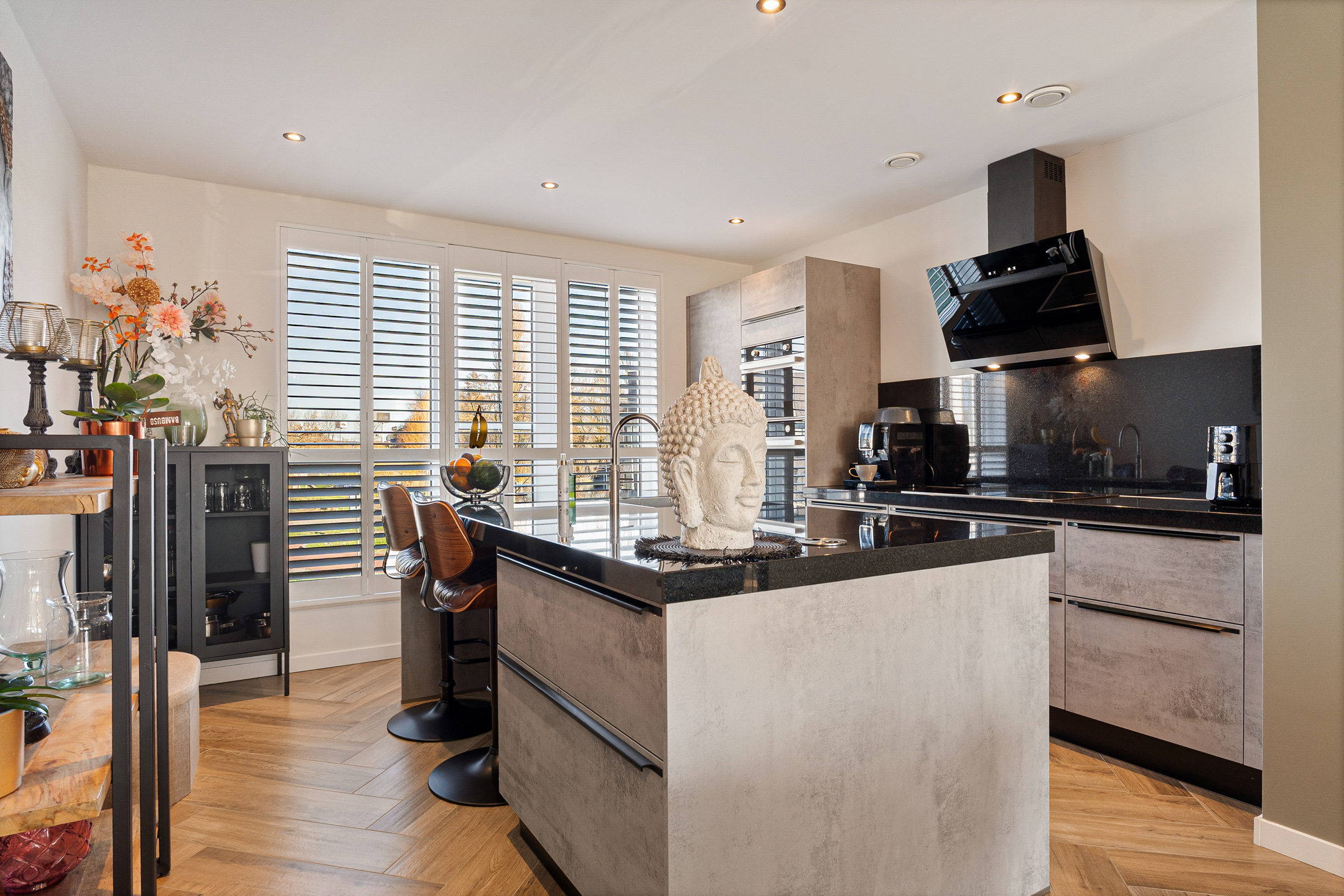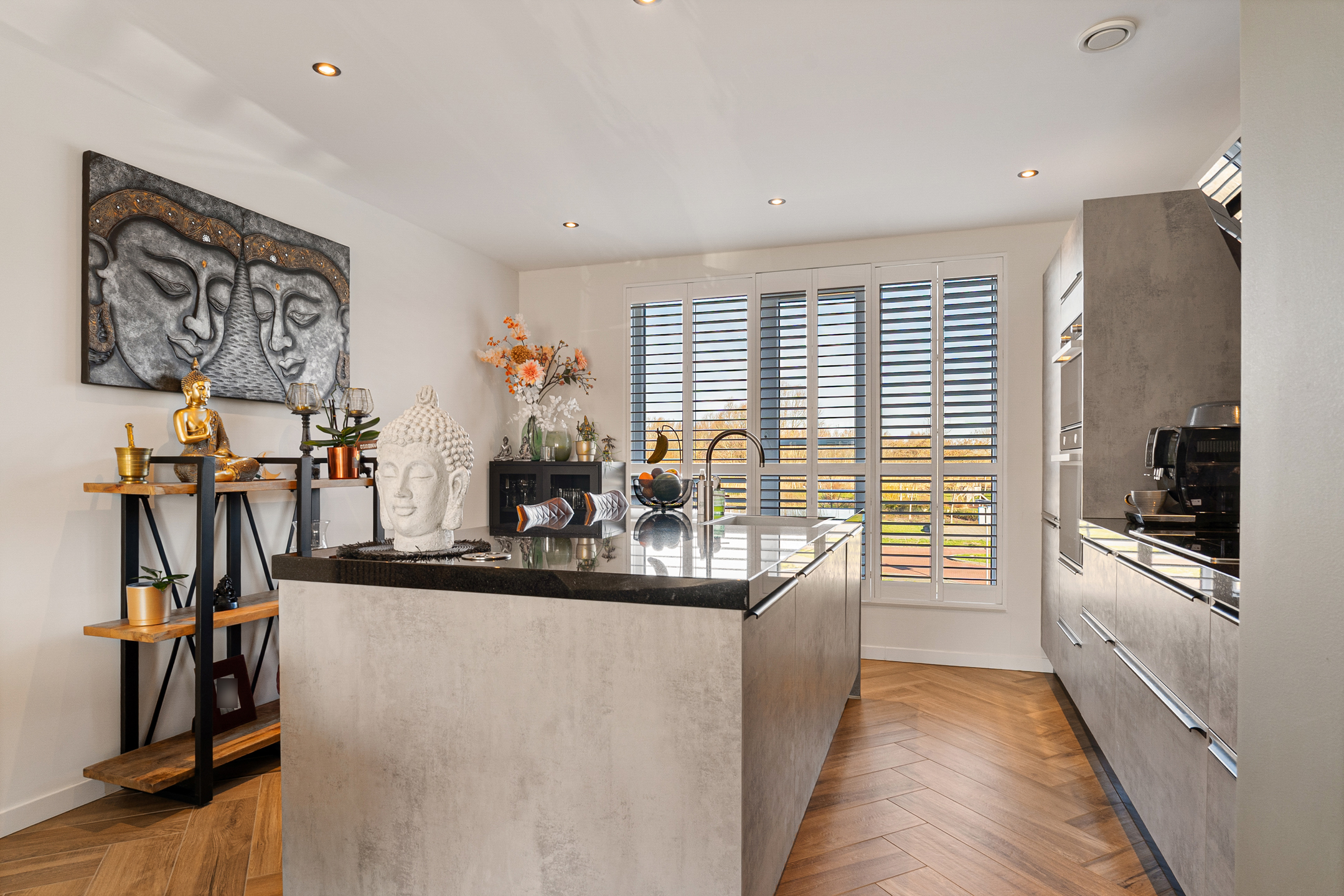 De open keuken is een echte blikvanger en uitgevoerd met een modern kookeiland, luxe keukenkraan (Quooker), hoogwaardige inbouwapparatuur en veel werkruimte. Een ideale plek om uitgebreid te koken en te genieten met familie en vrienden.