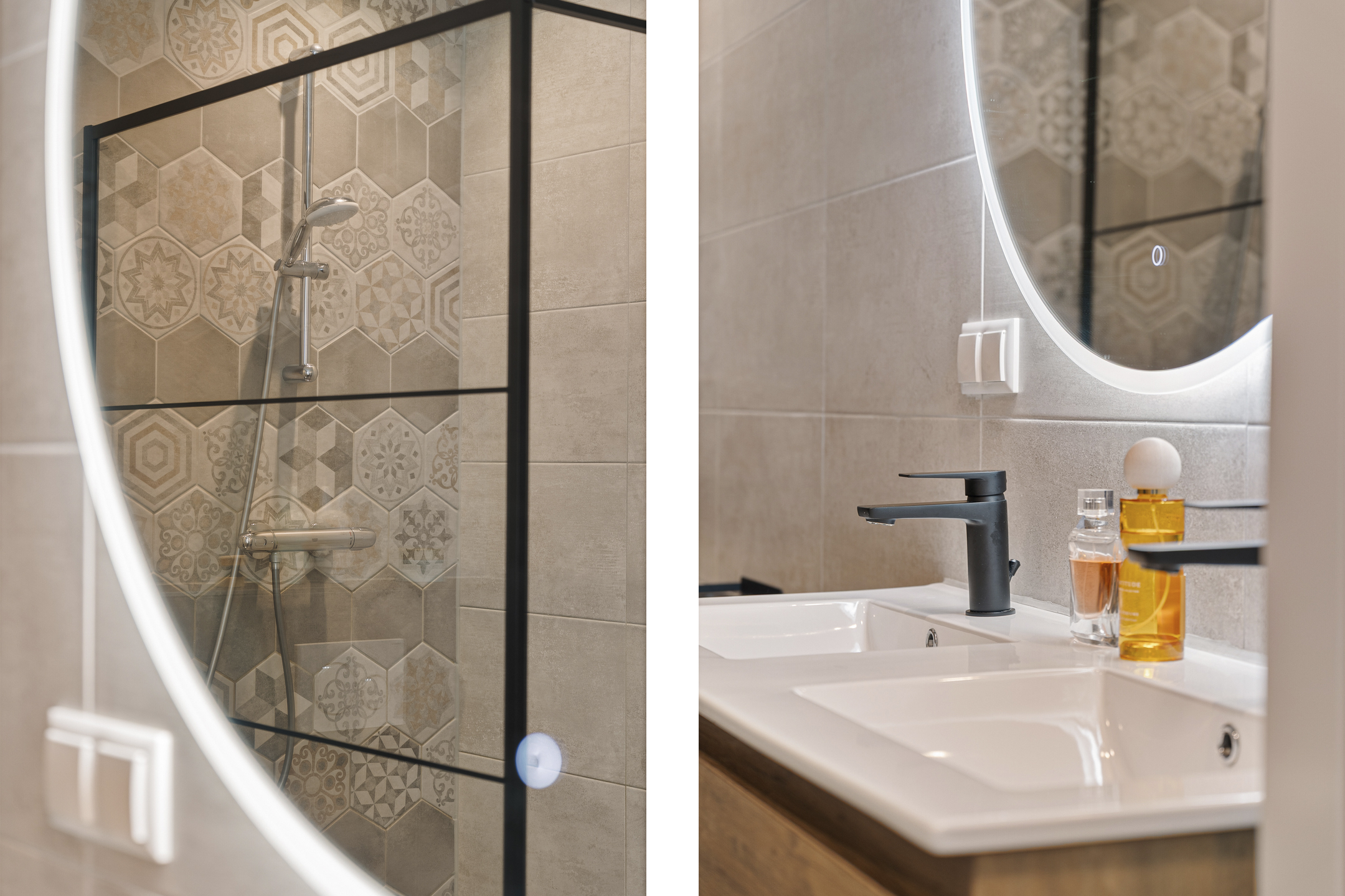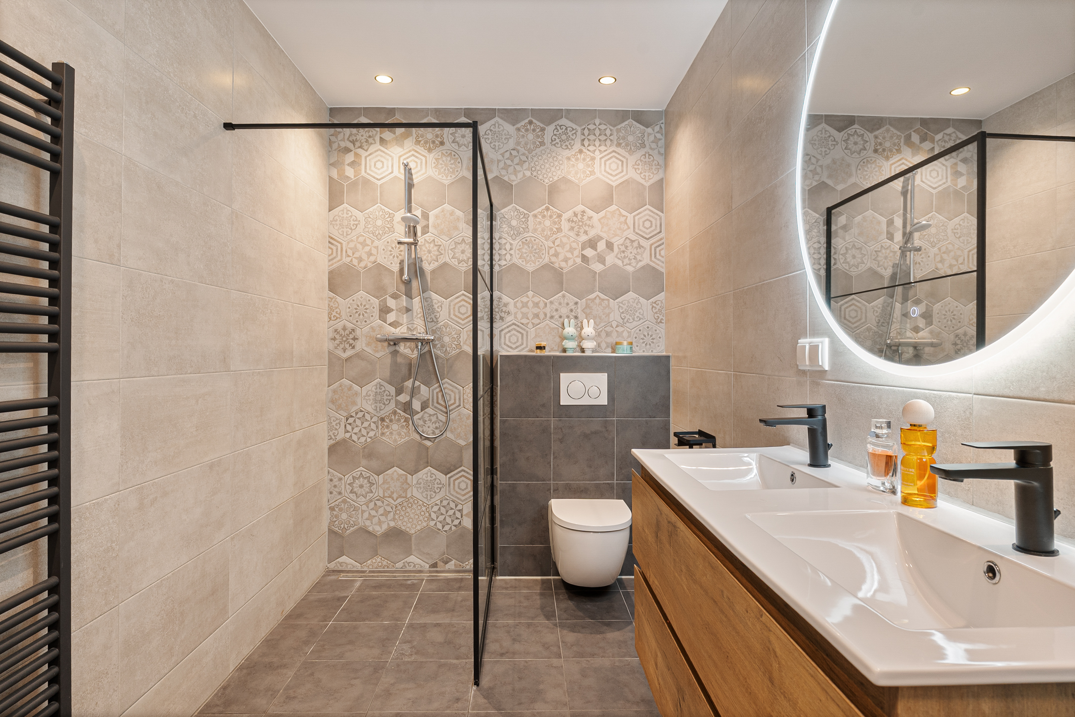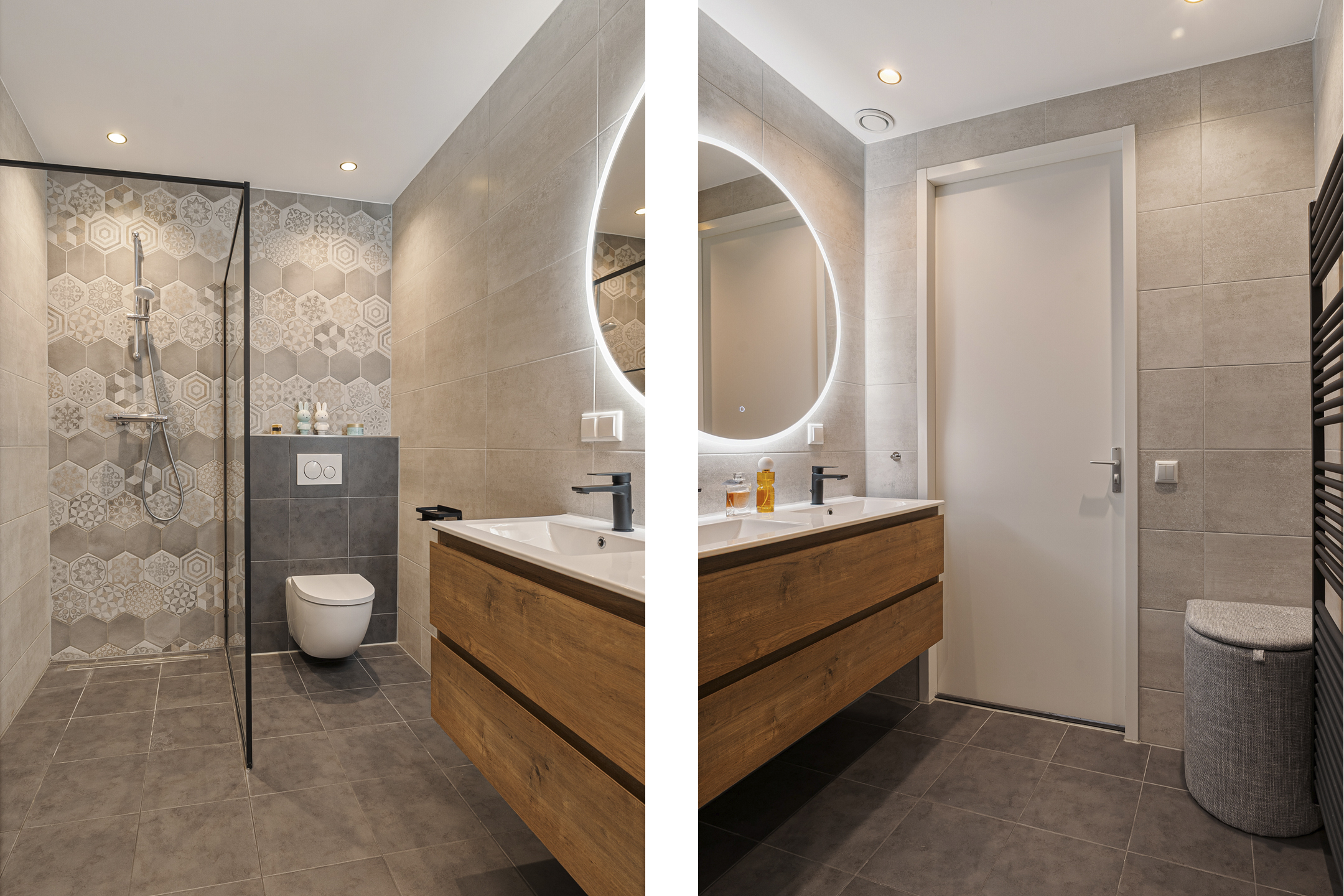 De badkamer is modern en luxe uitgevoerd met strak tegelwerk, een ruime inloopdouche en een dubbel wastafelmeubel, wat zorgt voor een comfortabele en verzorgde uitstraling.