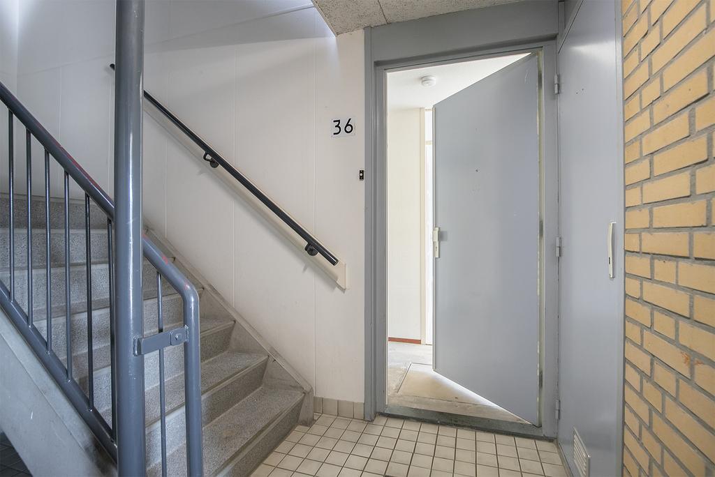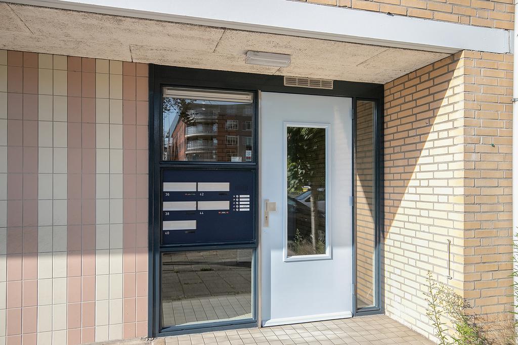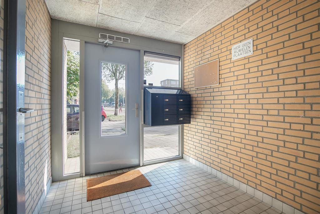 Centrale entree met de postbussen en het bellentableau. Via het nette trappenhuis zijn de woonverdiepingen bereikbaar. Naast de entree, onder de poort is de toegang tot de bergingen.