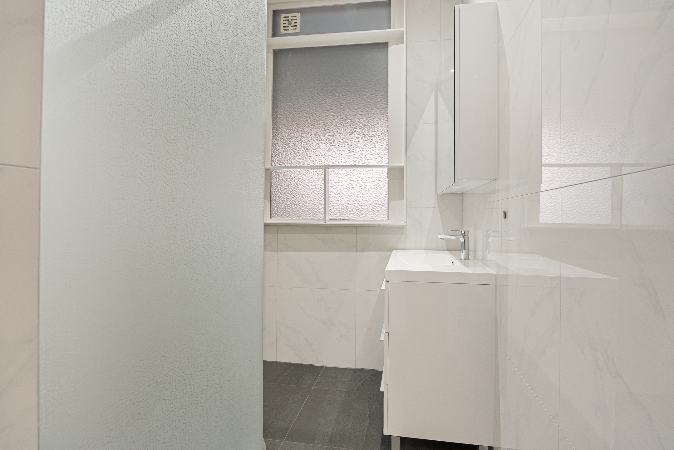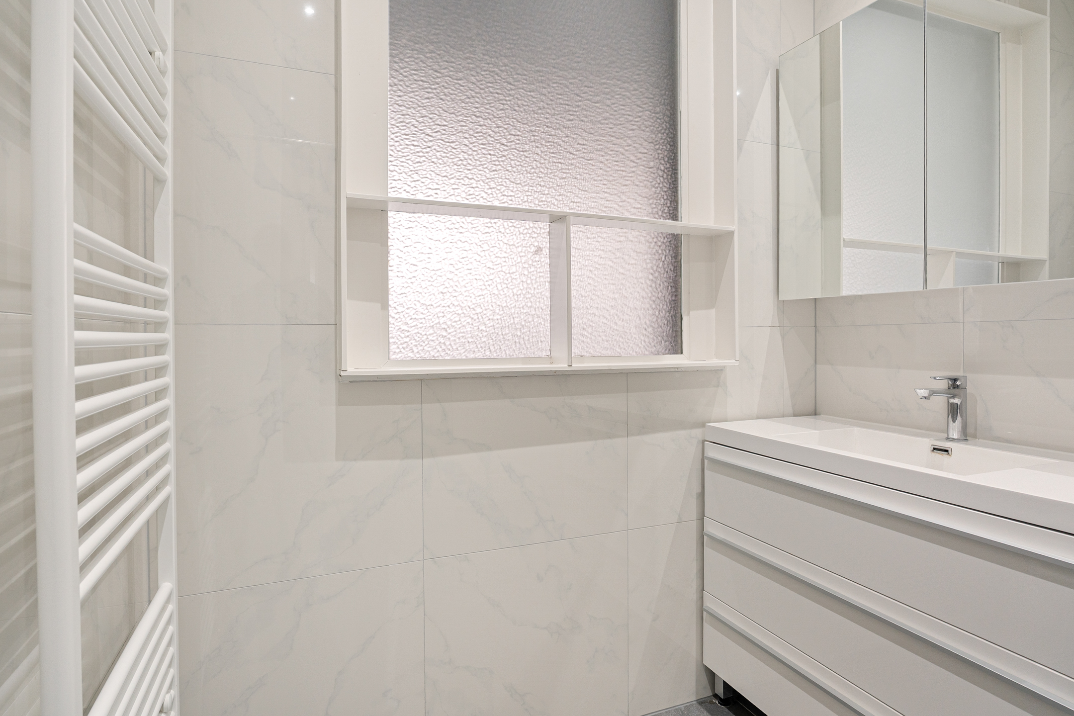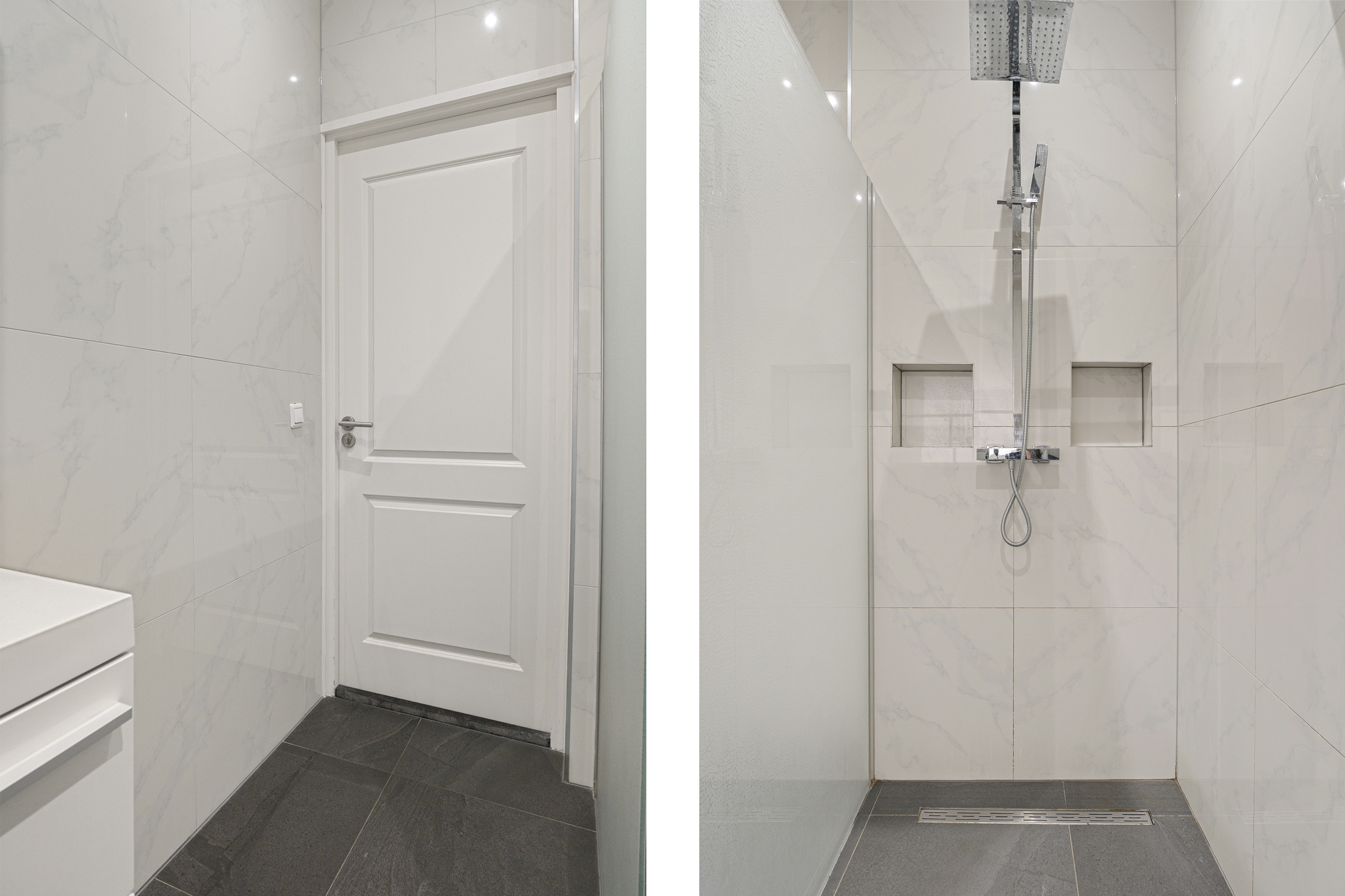 De badkamer is volledig betegeld en beschikt over een inloopdouche en een wastafelmeubel. Daarnaast is er een separaat toilet met hangend closet. Op deze verdieping bevindt zich ook een slaap- of werkkamer met wasmachineaansluiting.