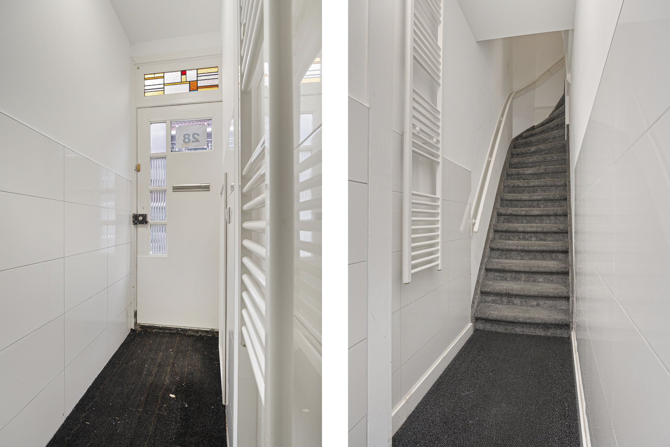 Je komt binnen via je eigen entree. In de keurig opgeknapte hal vind je een fraaie tegellambrisering, een moderne meterkast en de gestoffeerde trap naar de eerste verdieping.