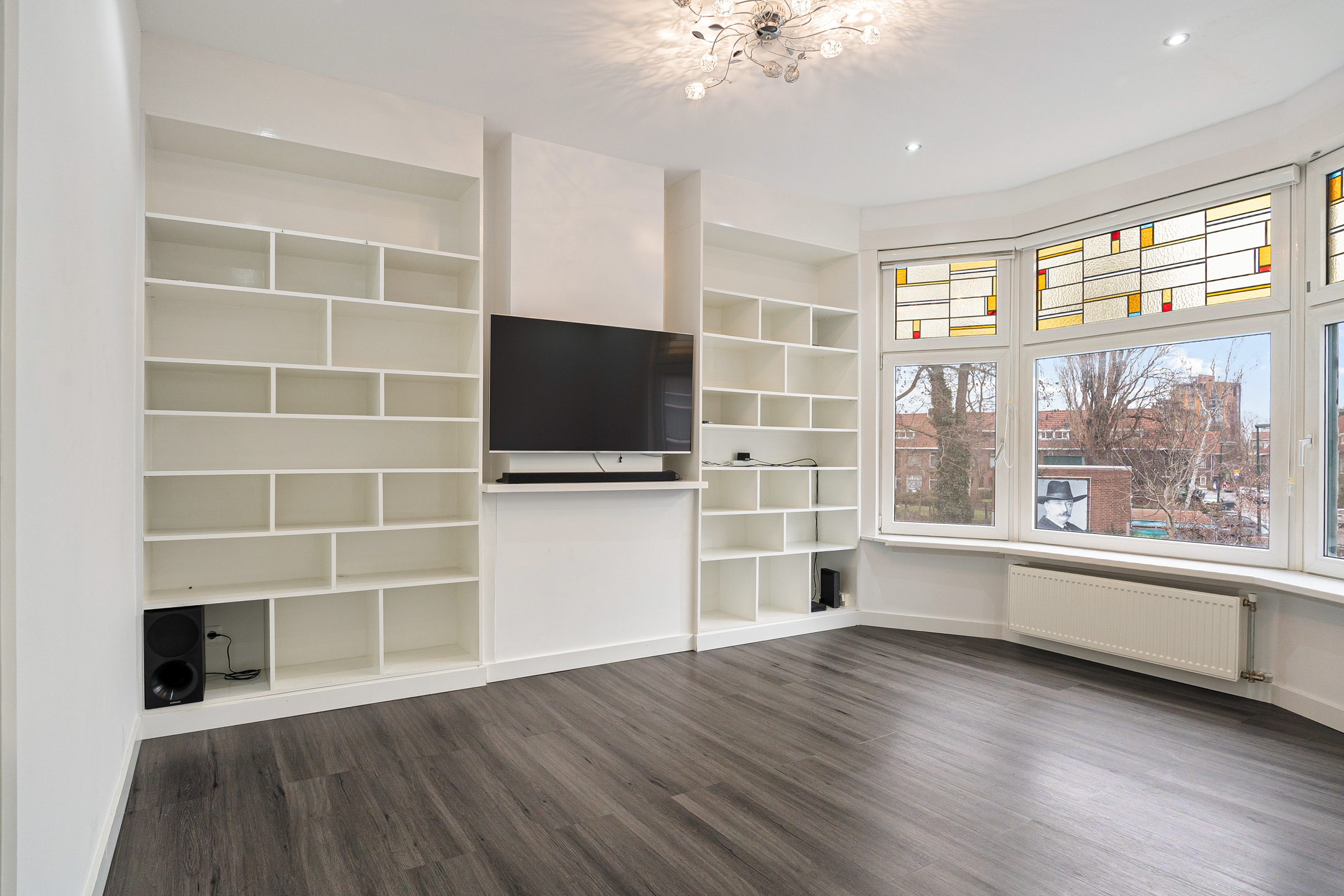 Op de eerste verdieping geeft de overloop toegang tot alle vertrekken. De lichte woonkamer valt direct op door de vele ramen en is ingericht met een ingebouwde boekenkast en en een grote televisie. Vanuit de woonkamer loop je door naar een tweede kamer, die flexibel te gebruiken is.